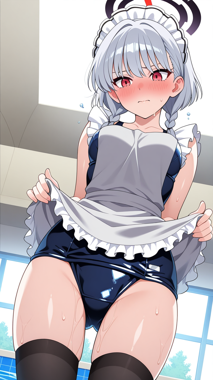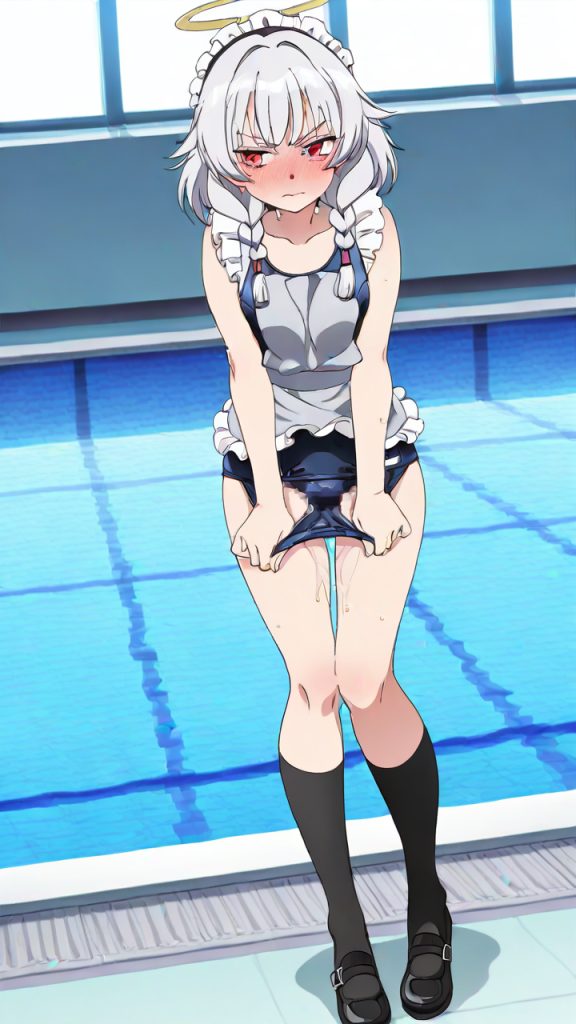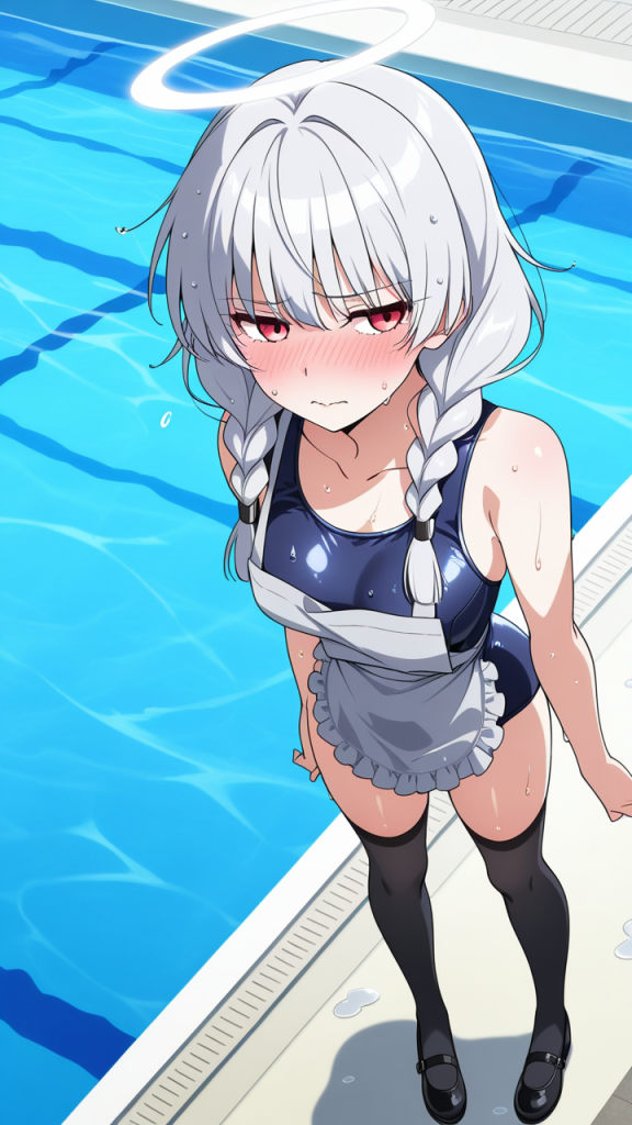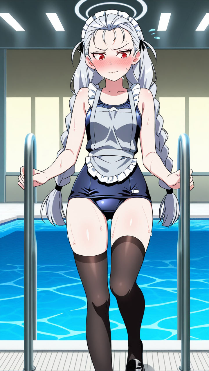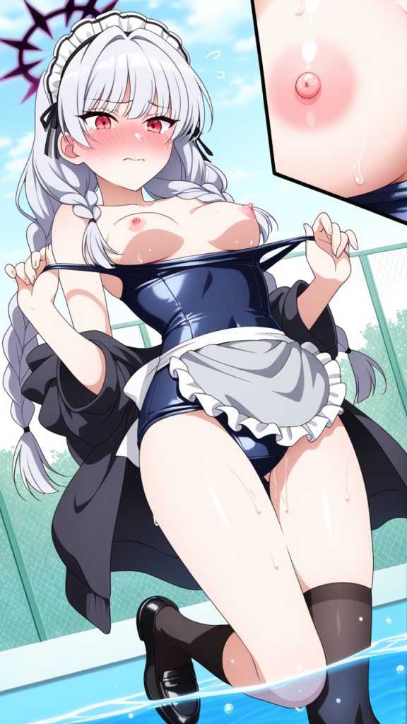 美少女,おっぱい,おしり,スク水,スクール水着,水着,,銀髪のツインおさげ、毛先ふんわり,赤い瞳、細めのクールな目,背が高くスレンダー,黒と銀のフリル付きメイド服、銀色のエプロン、黒いニーハイソックス、黒いメイドシューズ、天使の輪,恥ずかしがり屋、ツンデレ気味
