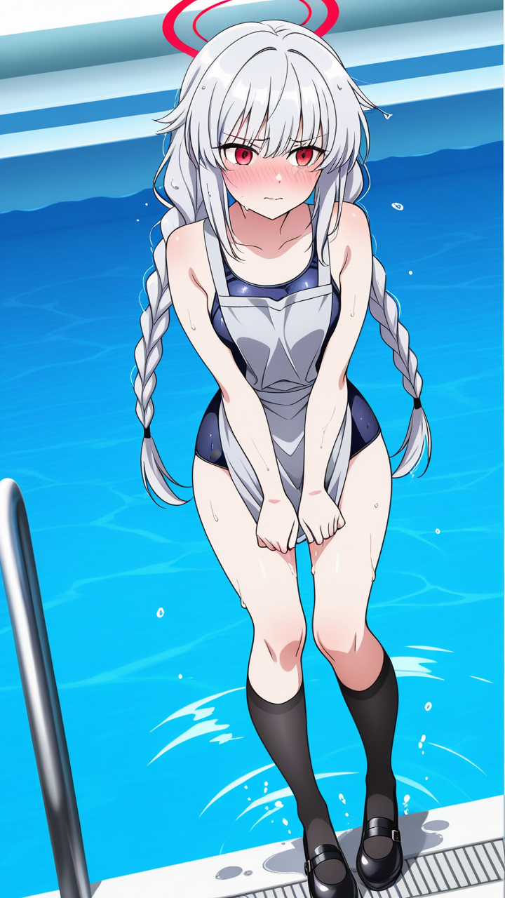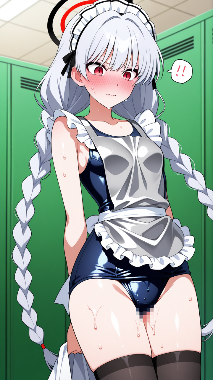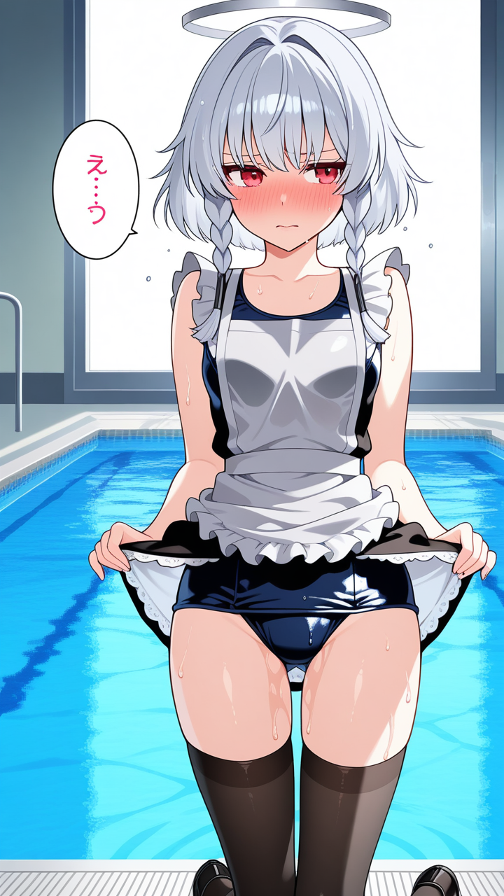 美少女,おっぱい,おしり,スク水,スクール水着,水着,,銀髪のツインおさげ、毛先ふんわり,赤い瞳、細めのクールな目,背が高くスレンダー,黒と銀のフリル付きメイド服、銀色のエプロン、黒いニーハイソックス、黒いメイドシューズ、天使の輪,恥ずかしがり屋、ツンデレ気味