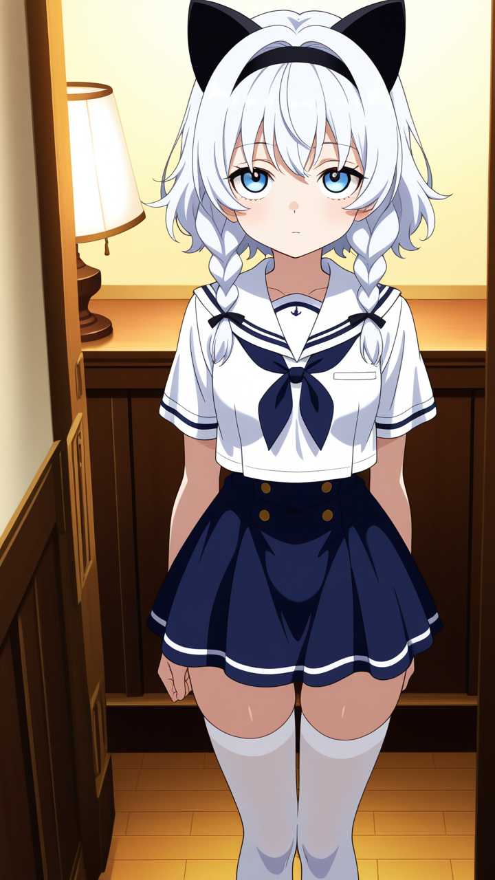 white hair, braided twin braids,blue eyes, upturned eyes,petite, small breasts, delicate frame,navy and white sailor uniform, white knee-high socks, black cat ears headband,cool, silent, expressionless, aloof