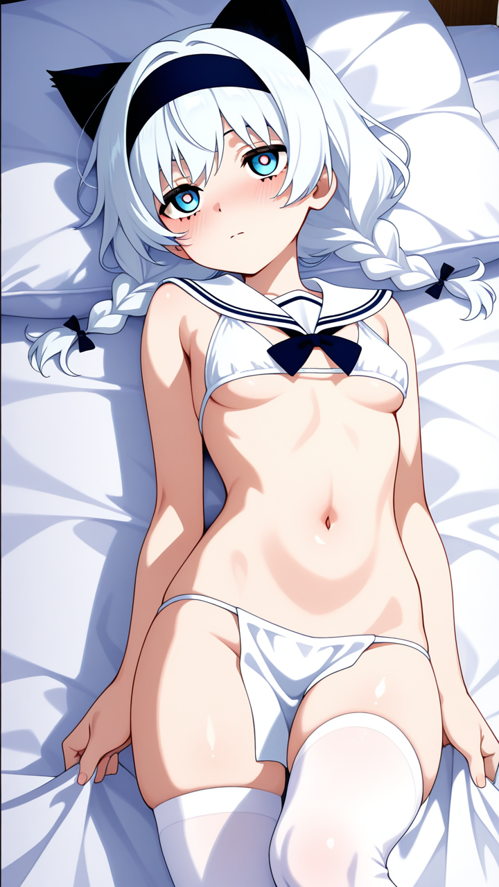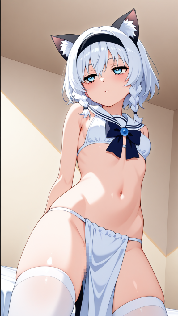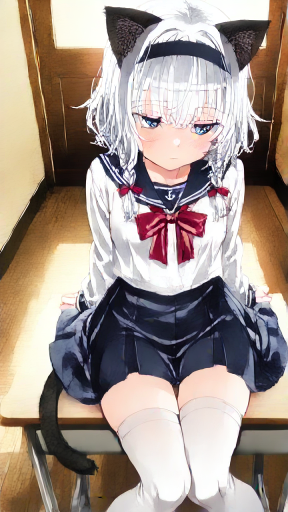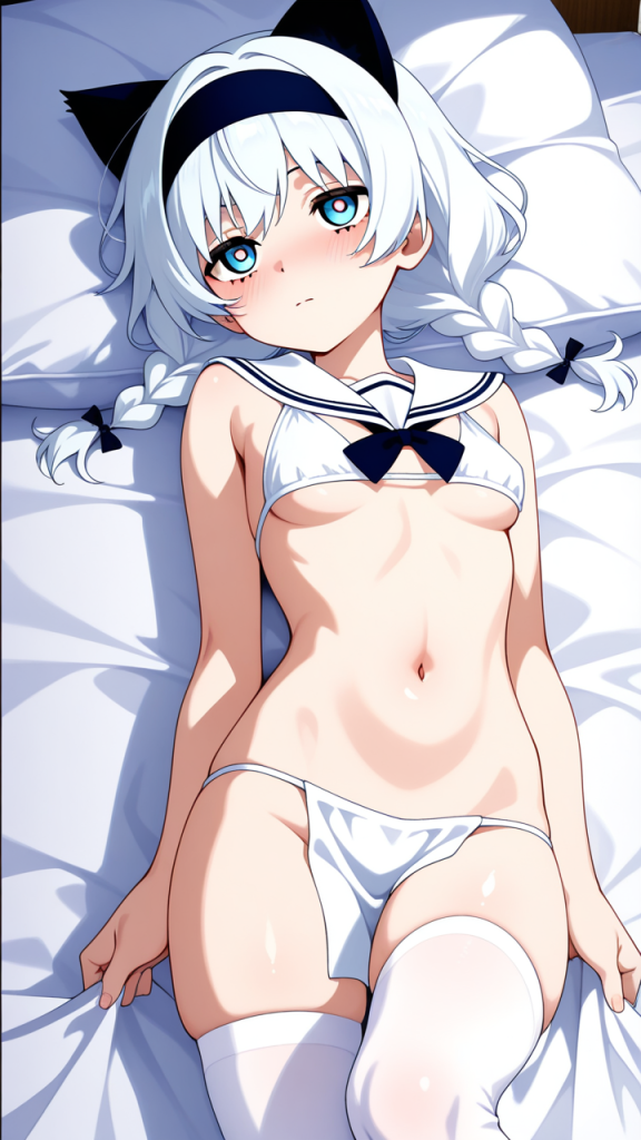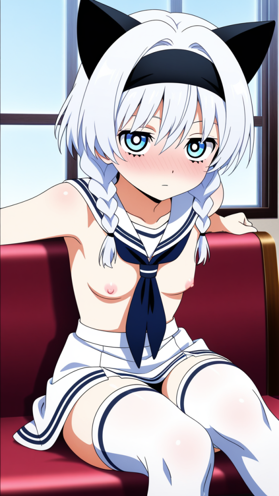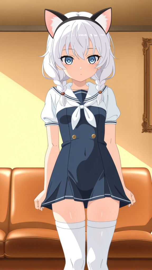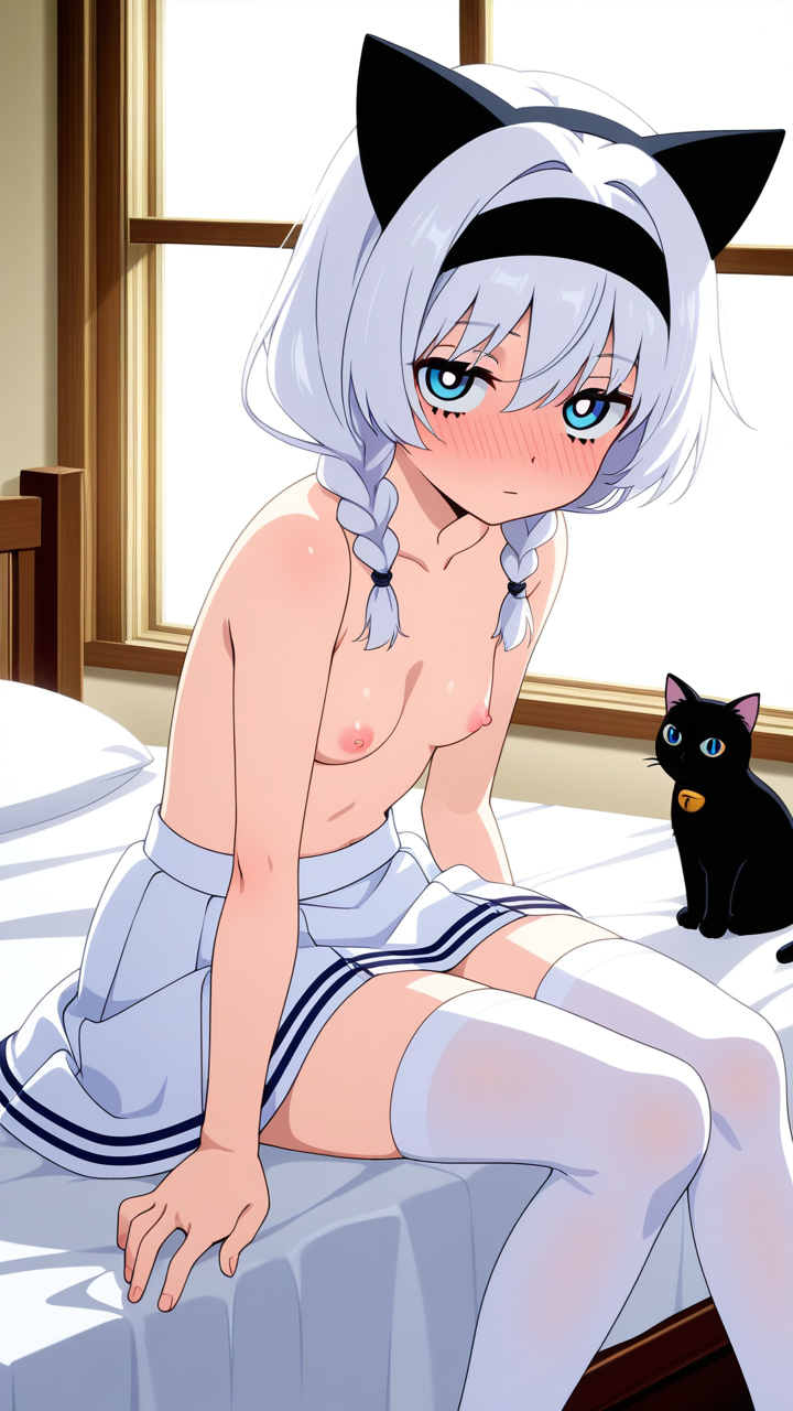 美少女,おっぱい,おしり,ニーソ,絶対領域,太もも,,白髪の三つ編み,青い瞳のつり目,貧乳・小柄,紺と白のセーラー服、白いニーソックス、黒い猫耳ヘッドアクセサリー,クール・無口・冷徹