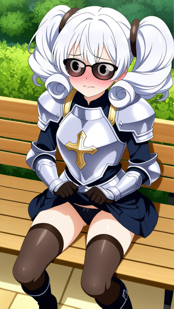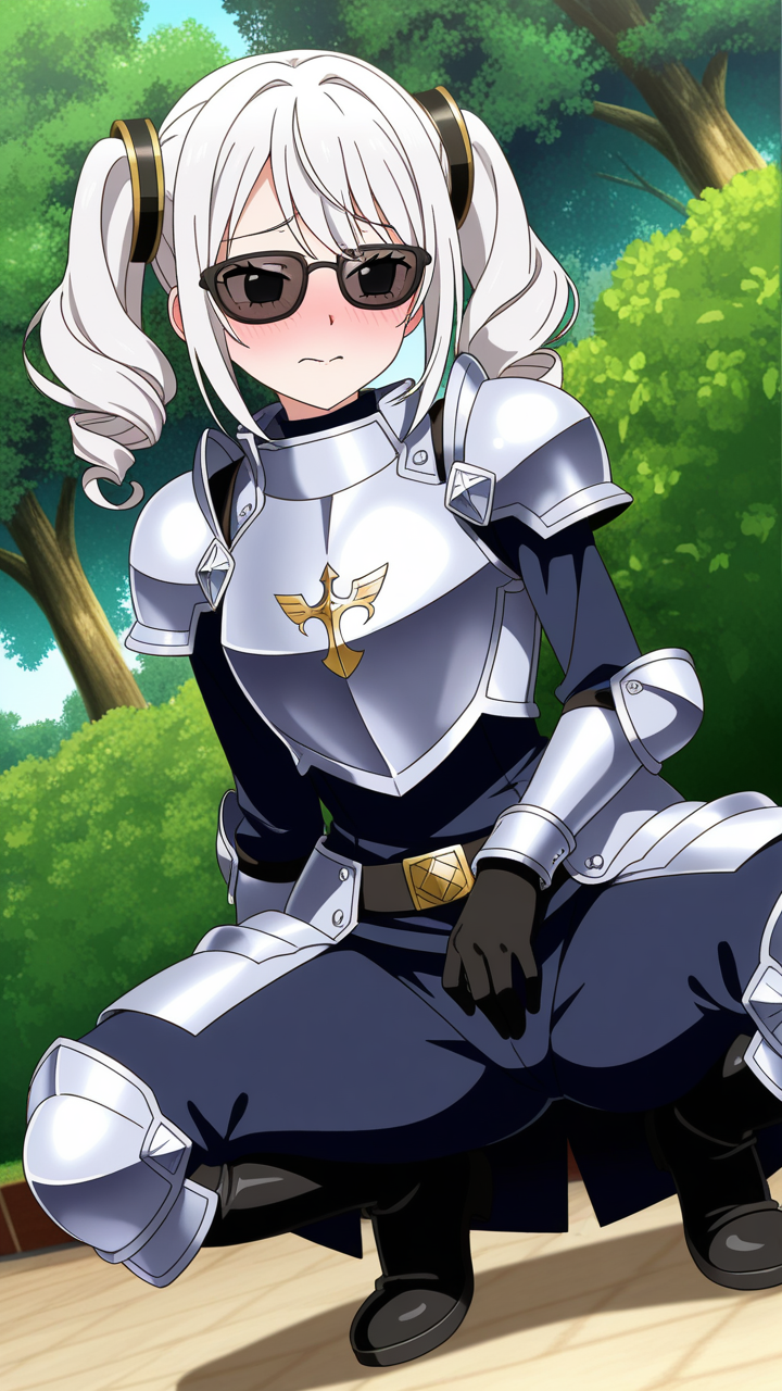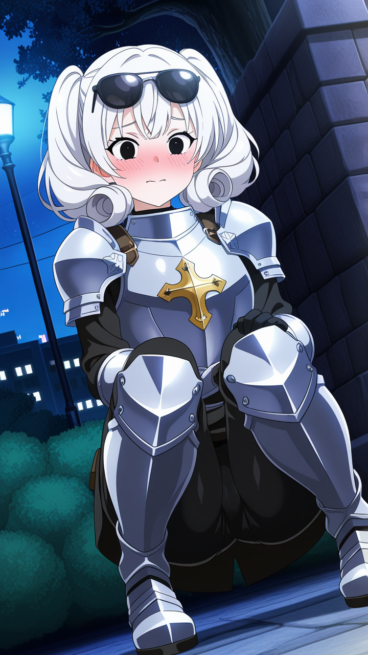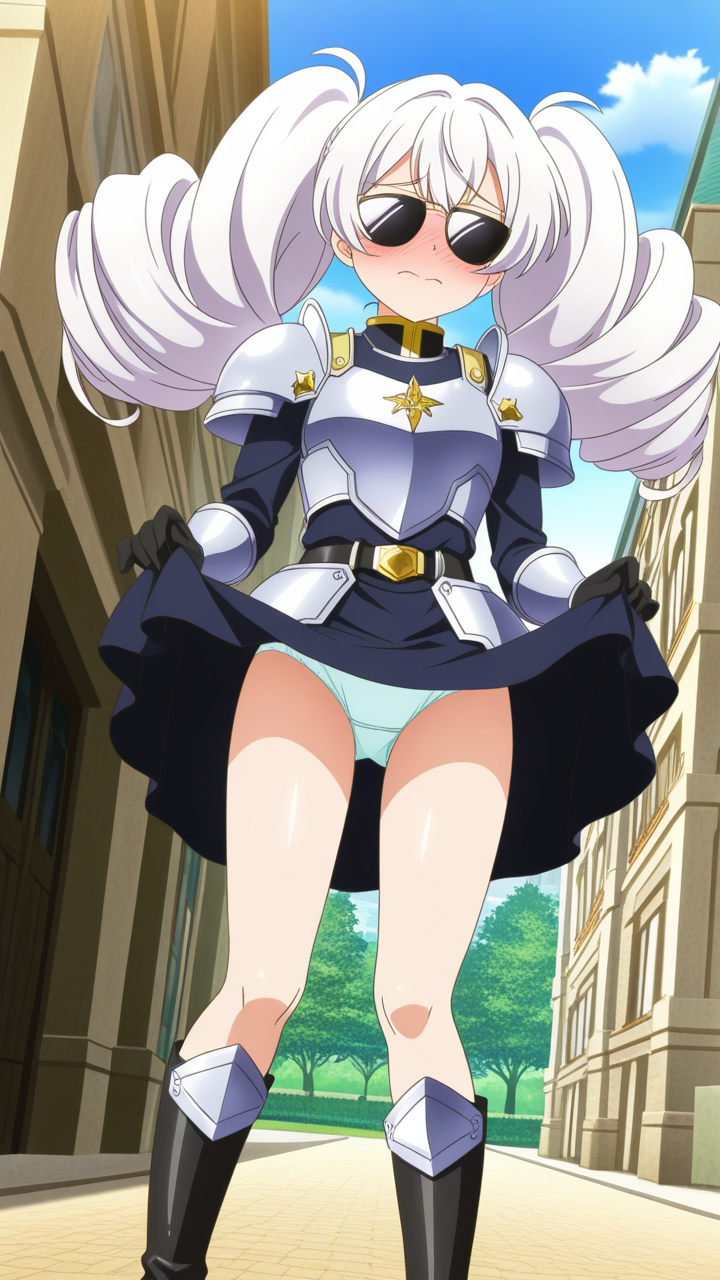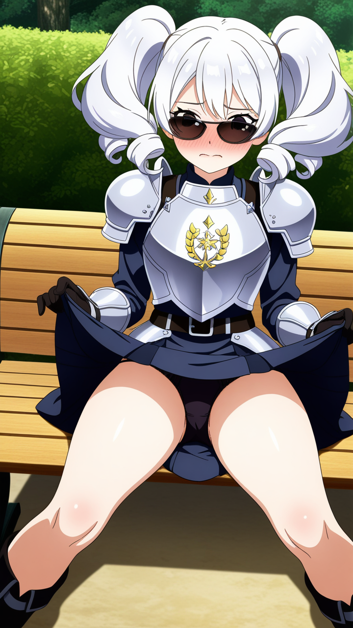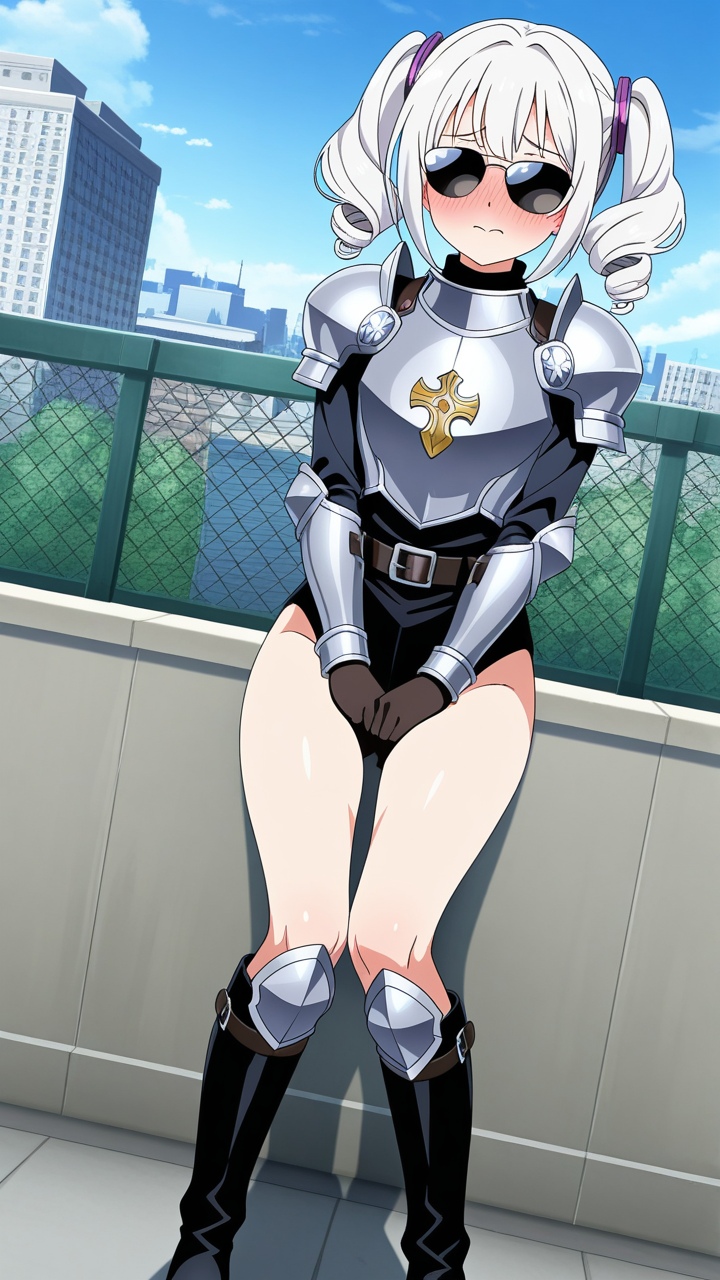 美少女,おっぱい,おしり,乳首,野外露出,露出,屋外,,白髪のツインテール、毛先ふんわりカール,黒い瞳のたれ目,背が高くスレンダー,銀色の騎士鎧、黒い革手袋、胸部に金色の紋章、黒いブーツ、サングラス,元気系で快活、冒険好きで親友思い