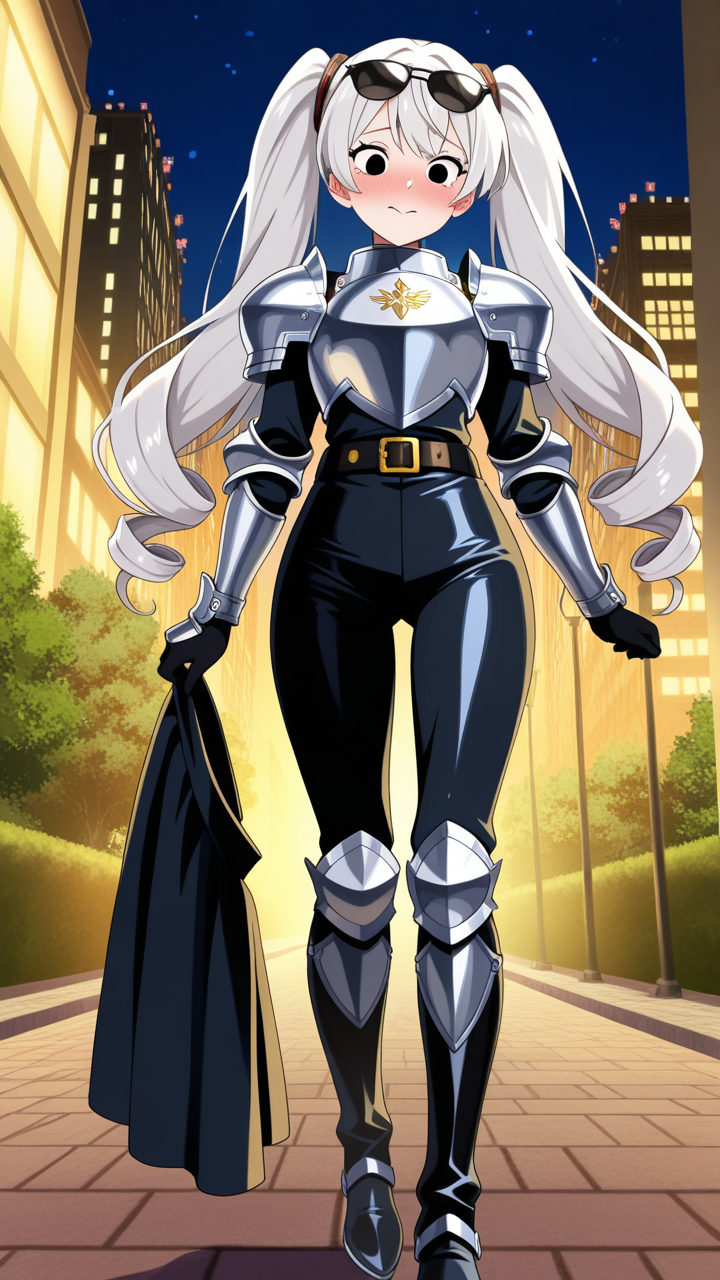 white hair, twin tails with fluffy curled ends,black eyes, droopy eye shape,tall and slender build,silver knight armor, black leather gloves, gold emblem on chest, black boots, sunglasses,energetic and cheerful, adventurous and loyal to friends