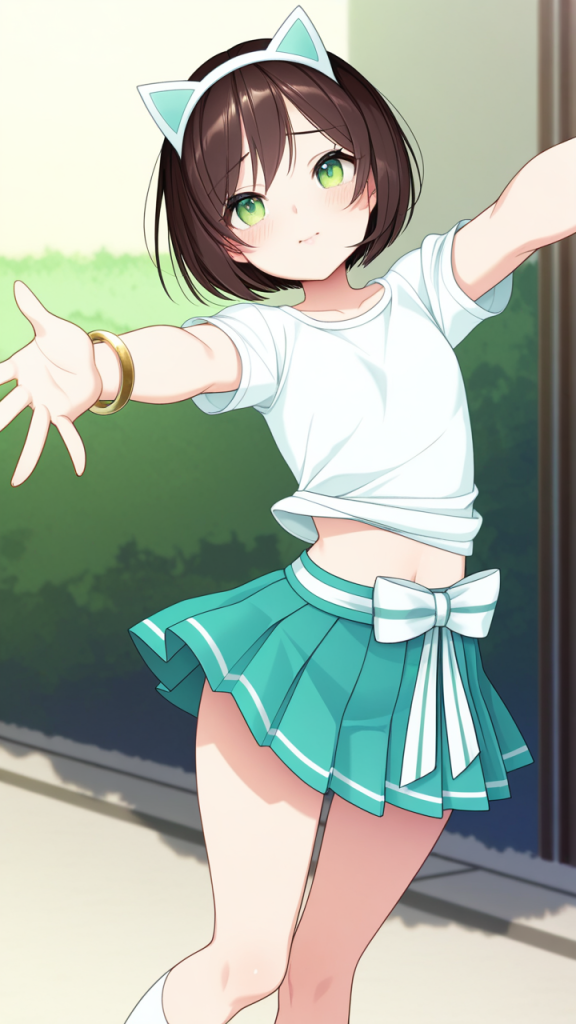 美少女,貧乳,おっぱい,乳首,微乳,ぺたんこ,スレンダー,,茶髪の刈り上げショート、襟足をすっきりカット,緑色の瞳、大きなぱっちり目,小柄でむっちりとした体型,白い半袖シャツに深緑の半幅帯を合わせた和洋折衷、紺色のプリーツスカート、白いソックス、猫耳ヘッドアクセサリー、金色のブレスレット,純粋無垢で無邪気、いつも笑顔を絶やさない素直な子