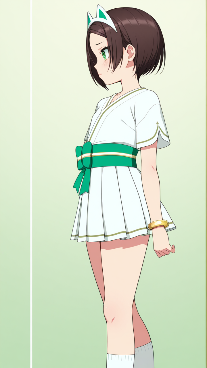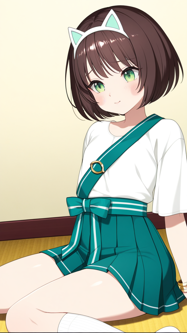 chocolate brown buzzcut short hair,large sparkling green eyes,petite, soft and curvy,white short-sleeve shirt with deep green obi sash, navy pleated skirt, white socks, cat ear headpiece, gold bracelet,innocent, pure-hearted, cheerful and honest