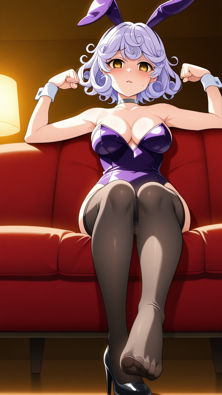 美少女,おっぱい,足コキ,足,脚,太もも,ニーソ,,黒から青へのグラデーションくせ毛ショート,金の瞳、垂れ目気味のハーフ目,巨乳・スレンダー,黒と紫のバニースーツ、銀色のチョーカー、黒いニーハイソックス、黒いハイヒール,ヤンデレ気味で執着心が強く、独占欲が強い