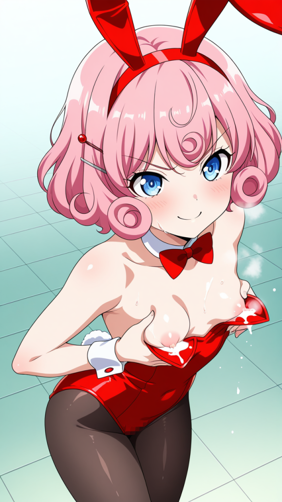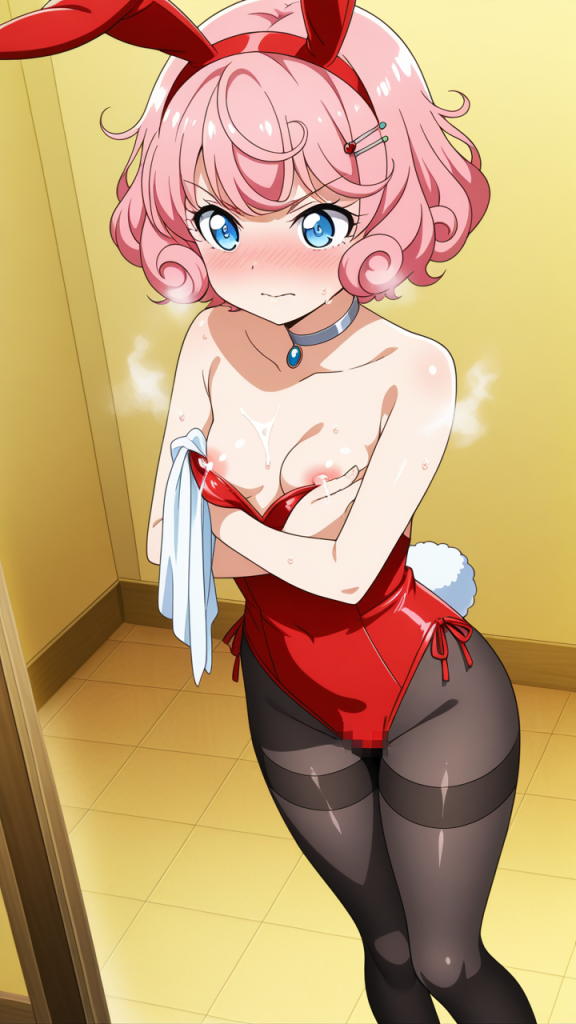 美少女,おっぱい,おしり,M字開脚,食い込み,乳首,パンツ,くぱぁ,母乳,ミルク,,ピンク髪のくせ毛ショート,水色の細めのクールな瞳,貧乳・小柄,黒と赤のバニースーツ、銀色のチョーカー、黒いニーハイソックス、赤いヘアピン,勝ち気で負けず嫌い、挑発的でツンデレ