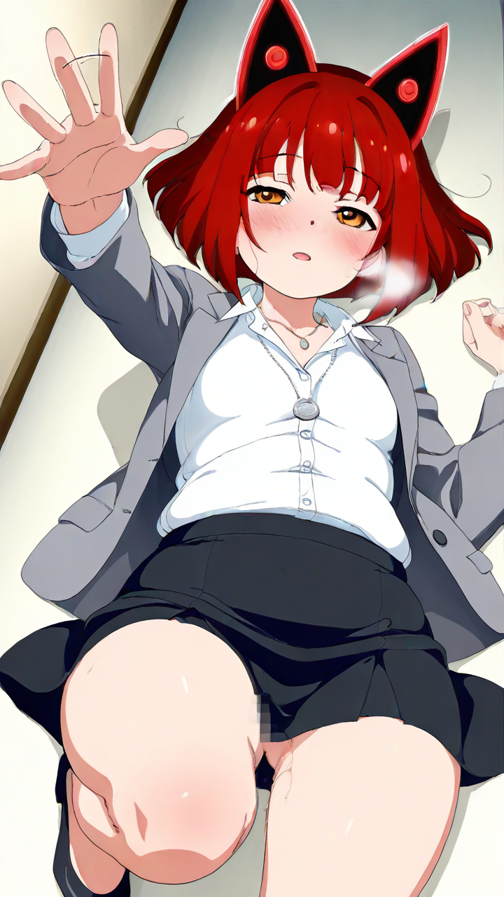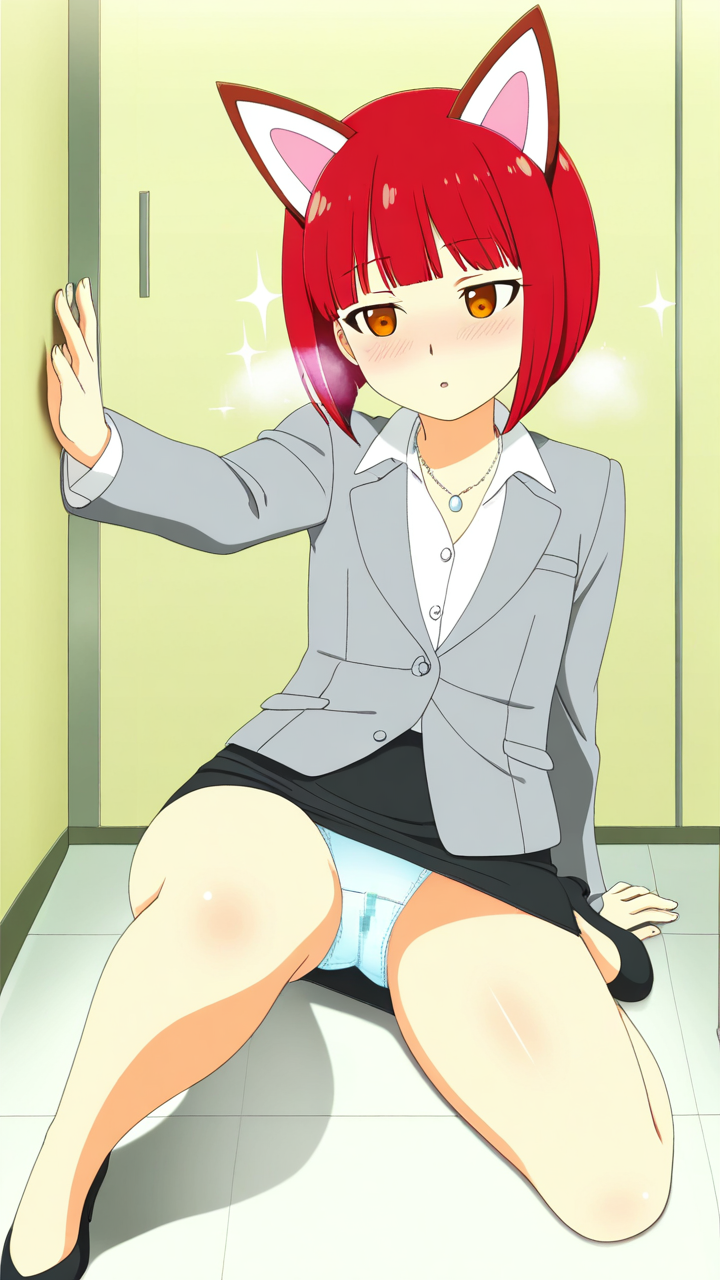 美少女,おっぱい,おしり,M字開脚,乳首,パンツ,くぱぁ,オナニー,自慰,指,マスターベーション,,赤髪の外ハネボブ,琥珀色の瞳、垂れ目気味のハーフ目,小柄でむっちり,グレーのビジネスブレザー、白いシャツ、黒いタイトスカート、黒いパンプス、狐耳ヘッドアクセサリー、銀色のネックレス,ミステリアス、知的で深い思考を持つ、秘密めいた雰囲気