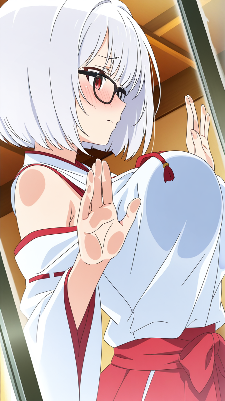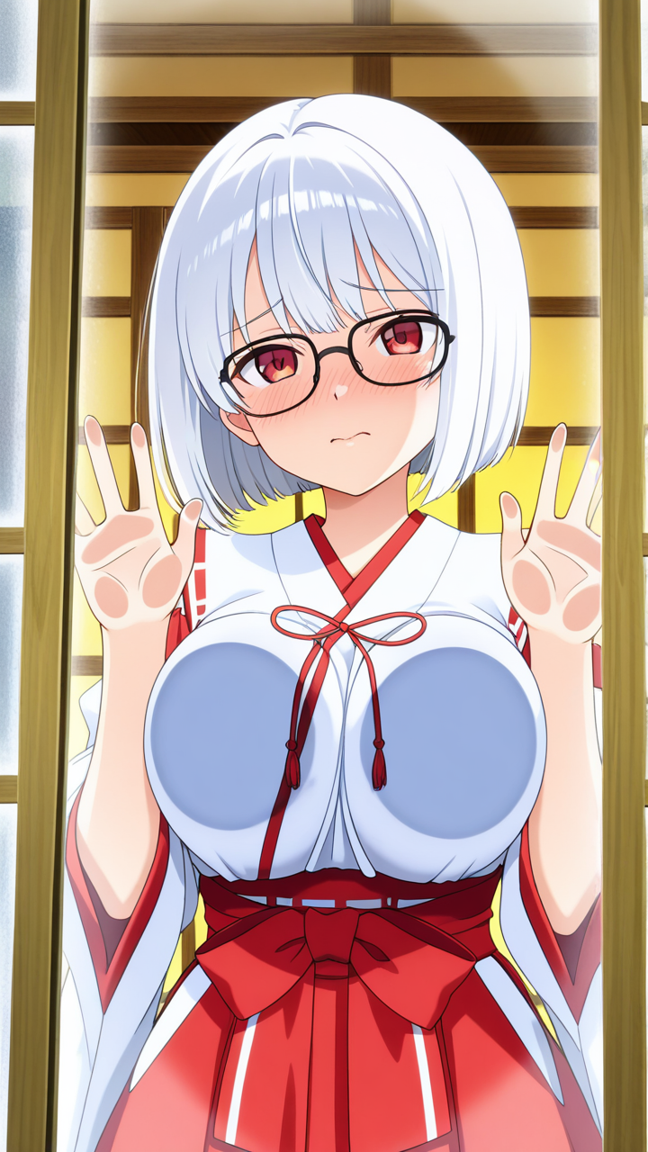 美少女,おっぱい,乳首,ガラス,押し付け,圧迫,胸,巨乳,貧乳,,白髪のボブカット,赤い瞳、垂れ目気味のハーフ目,巨乳・スレンダー,白と赤の巫女服、赤いリボン、黒縁眼鏡,甘えんぼで依存的、甘い声でおねだりする