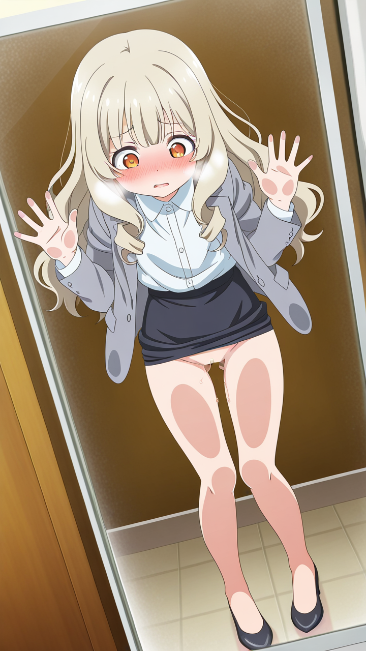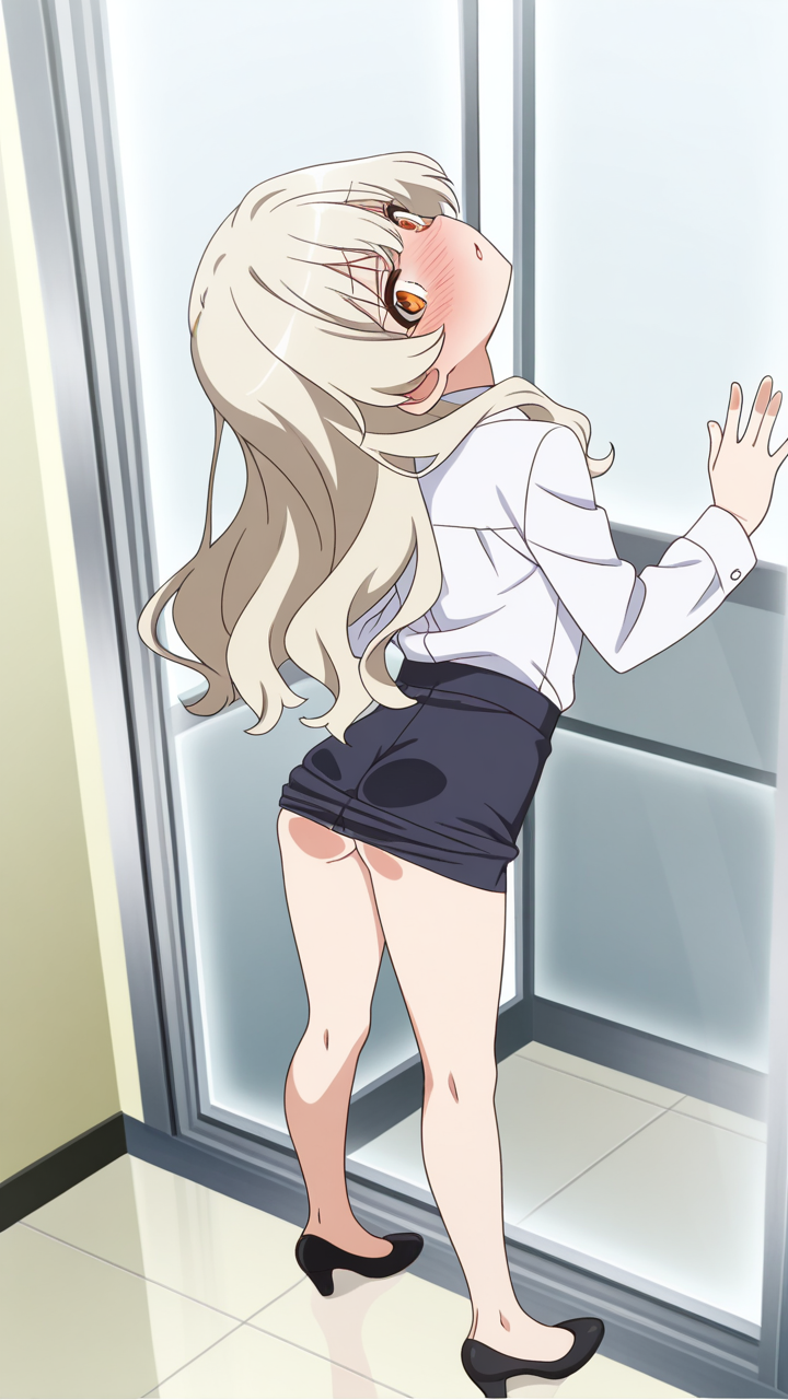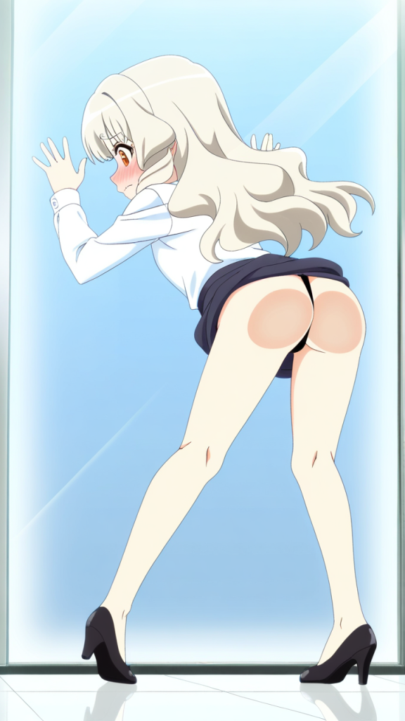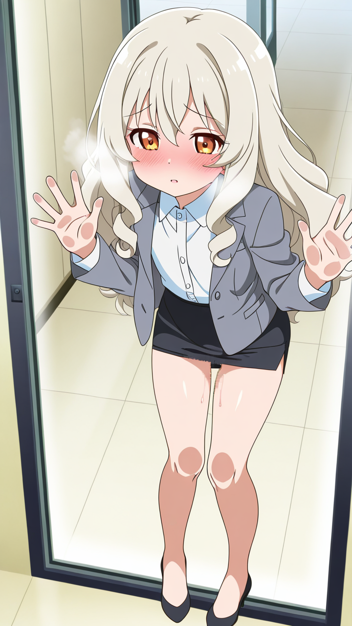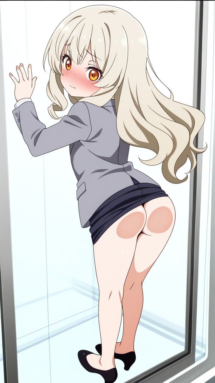 美少女,おしり,ガラス,押し付け,圧迫,ヒップ,くぱぁ,パンツ,,プラチナ髪のセミロング、毛先内巻き,琥珀色の細めのクールな瞳,ロリ体型,グレーのビジネスブレザー、白いシャツ、黒いペンシルスカート、黒いパンプス,天然ドジっ子で、仕事中もよく失敗する。でも誠実な姿勢で皆に愛される