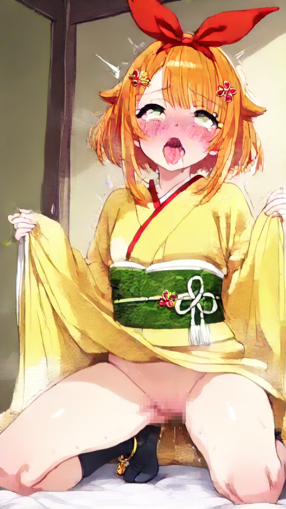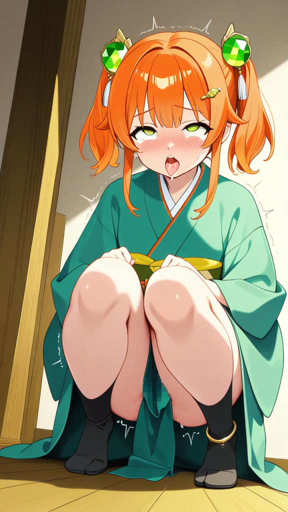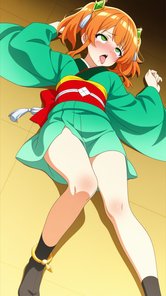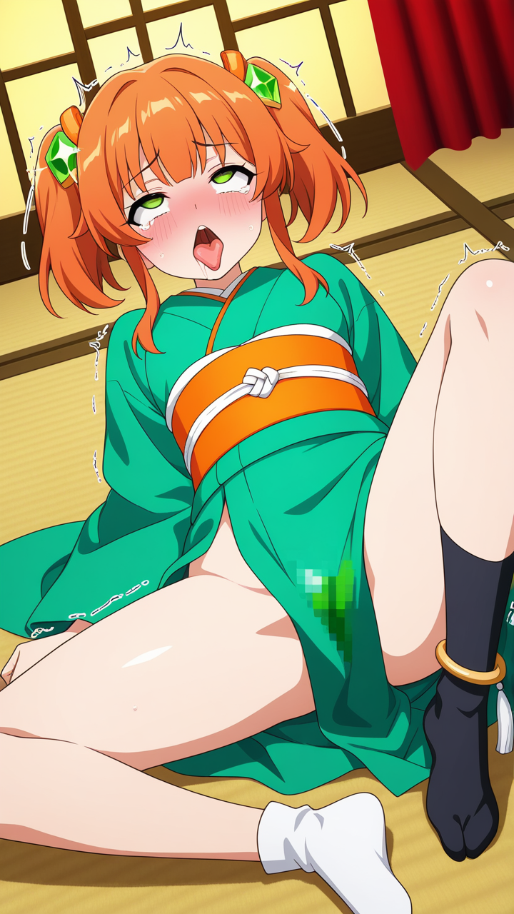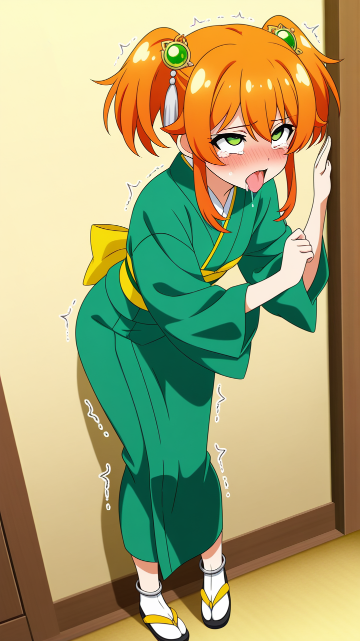 美少女,おっぱい,おしり,乳首,アヘ顔,白目,舌出し,よだれ,,オレンジ色のアップスタイル、サイドに細い後れ毛,緑色の大きなぱっちり目,背が高くスレンダーな体型,深緑と金色の帯が映える上質な着物、足首に銀色の房飾り、黒い足袋、髪に透明感のある琥珀色のヘアピン,ツンデレで照れ屋、本心は優しい