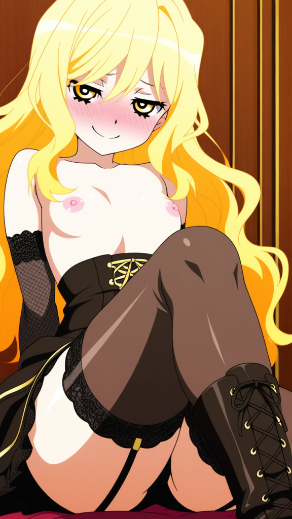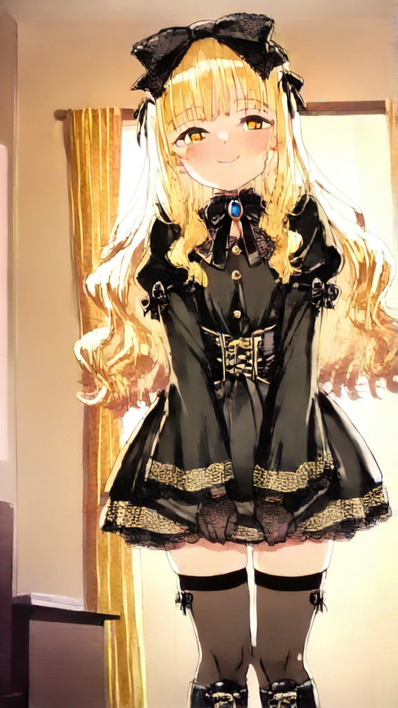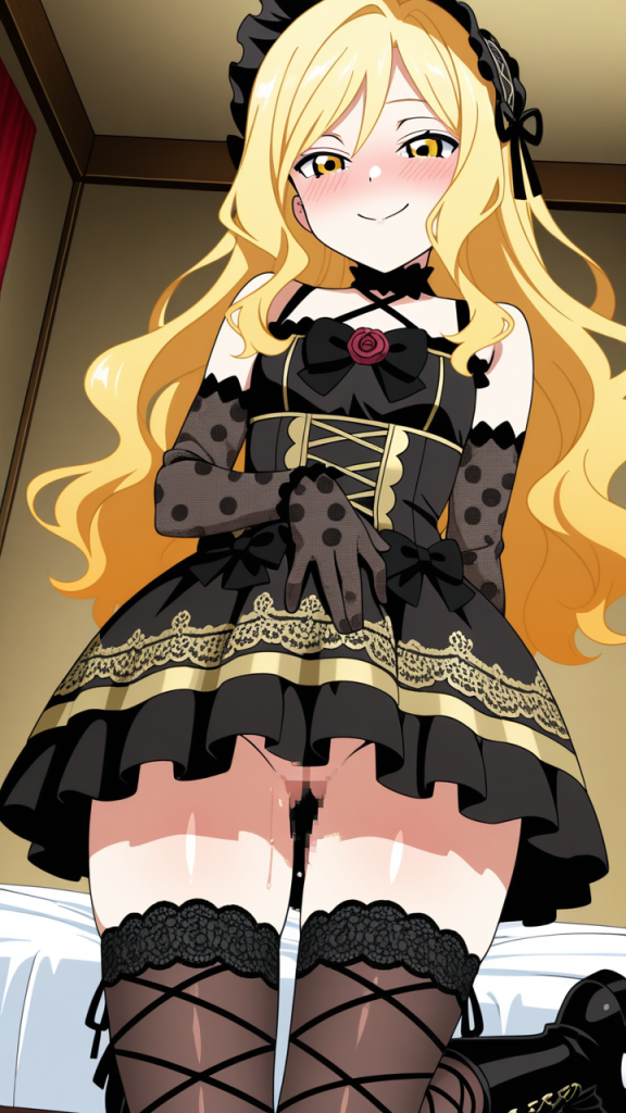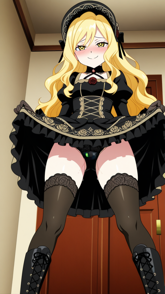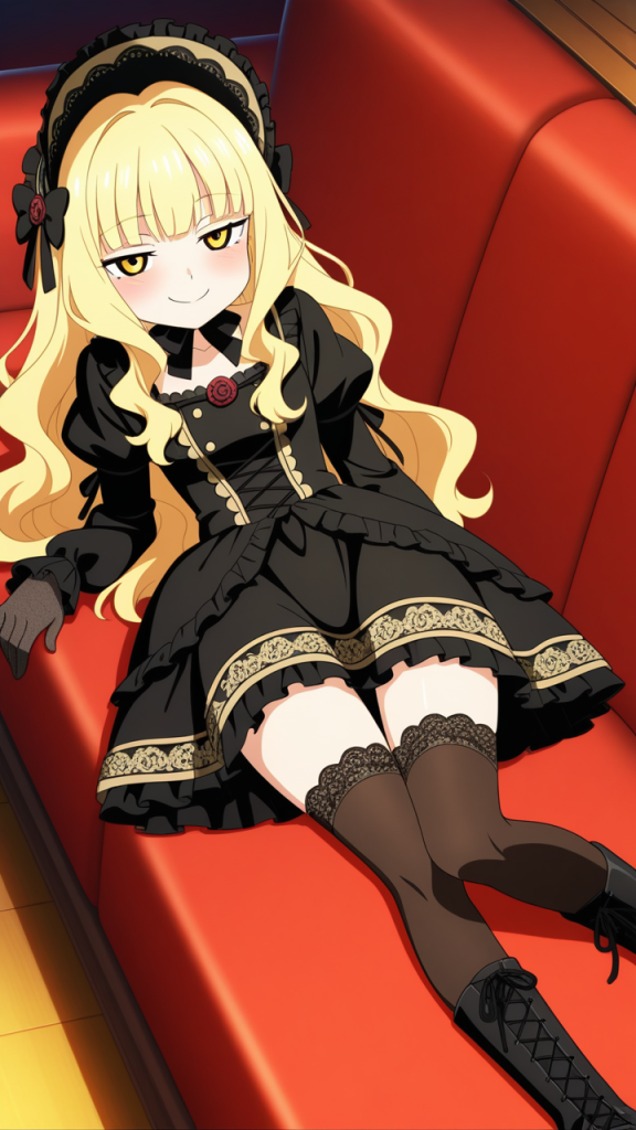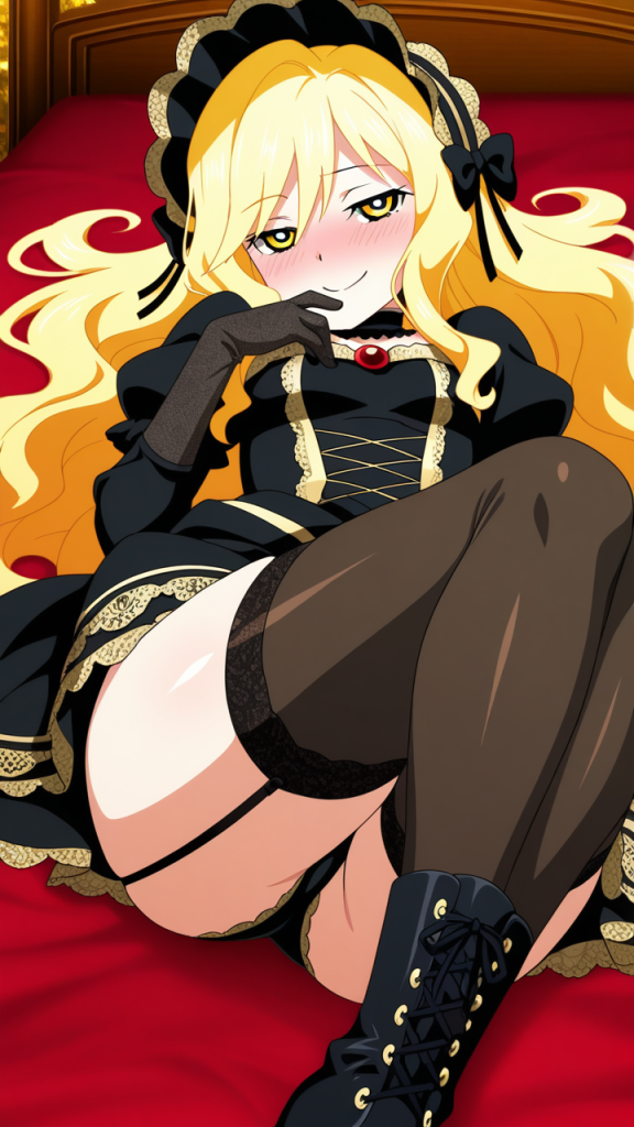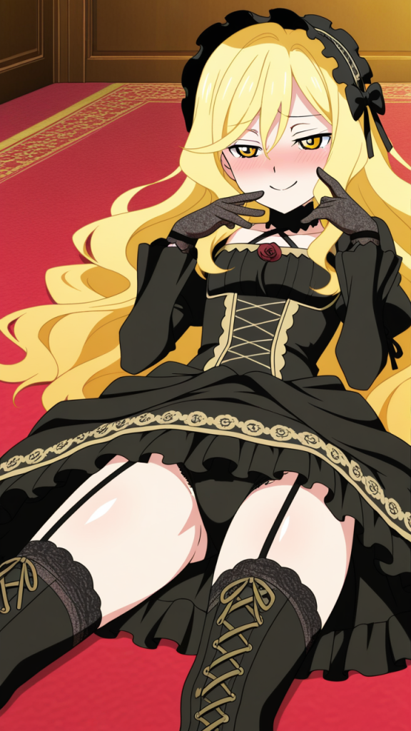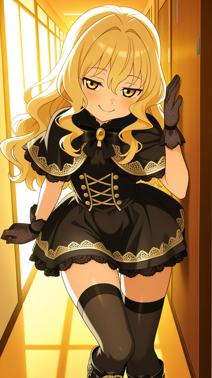 美少女,おっぱい,おしり,ニーソ,絶対領域,太もも,,金髪のウェーブロング,金の瞳、垂れ目気味のハーフ目,小柄でむっちり,黒と金のゴシックロリータドレス、金色のレースアップショートブーツ、黒いレースグローブ,腹黒系、甘い笑顔の裏に計算高い思考を隠す