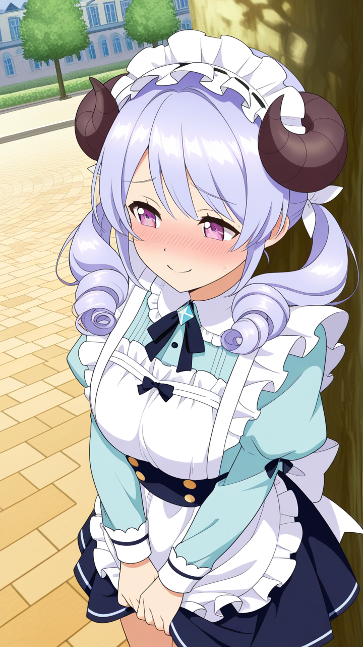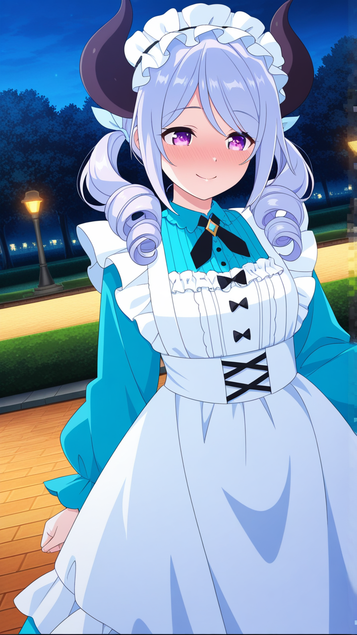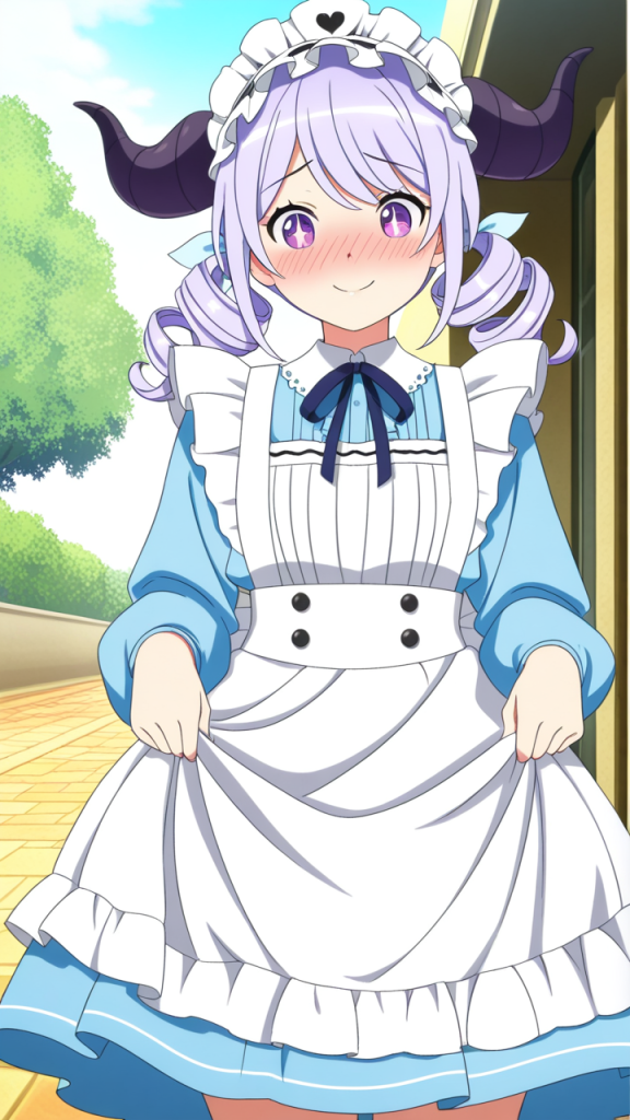 light blue rolled twin tails with fluffy curled ends,purple eyes, large and sparkling,normal build, slightly chubby,dragon maid outfit, black and blue, frilled chest detail, demon horns headpiece, white apron,innocent and pure-hearted, honest and kind, slightly airheaded, cheerful smile