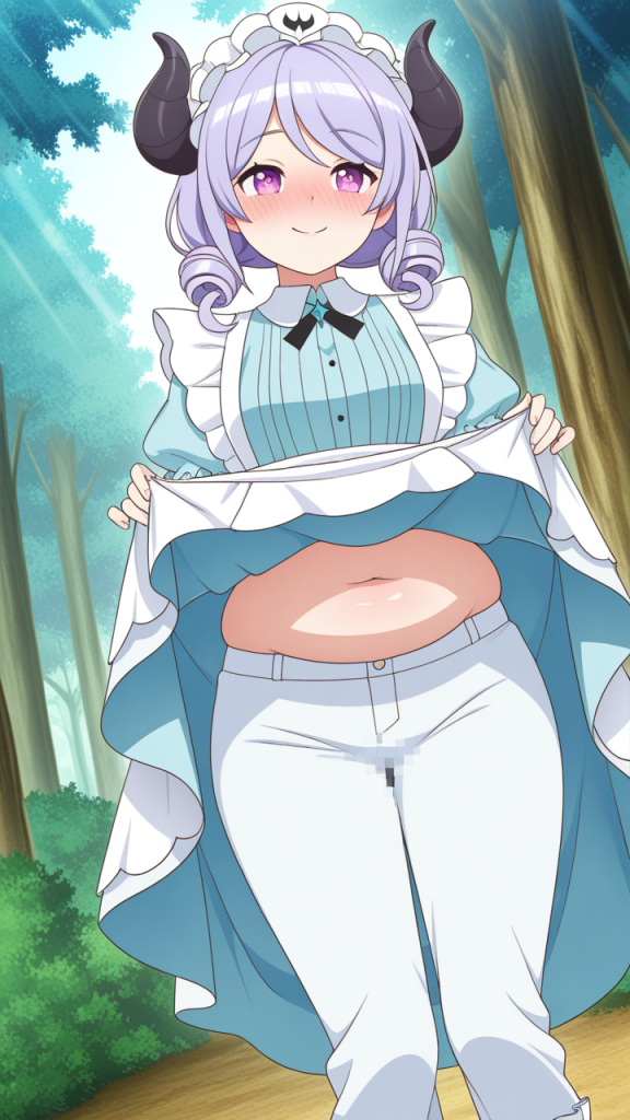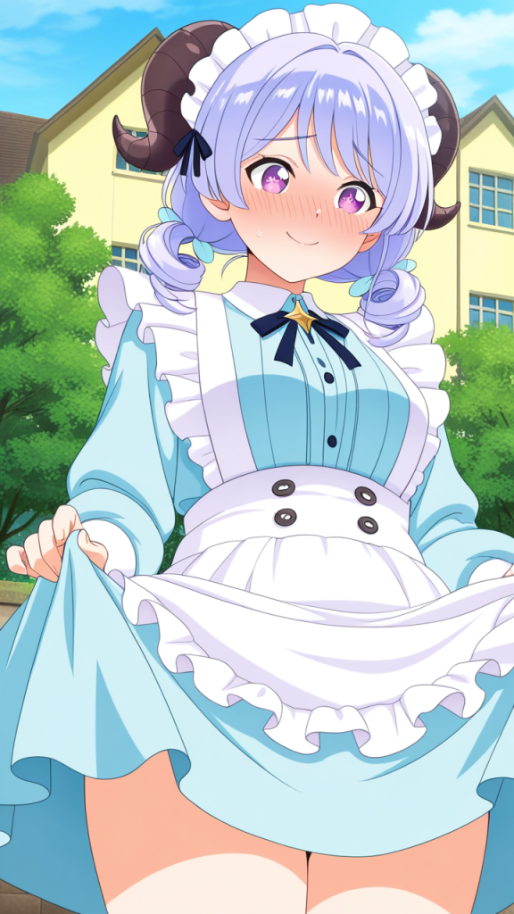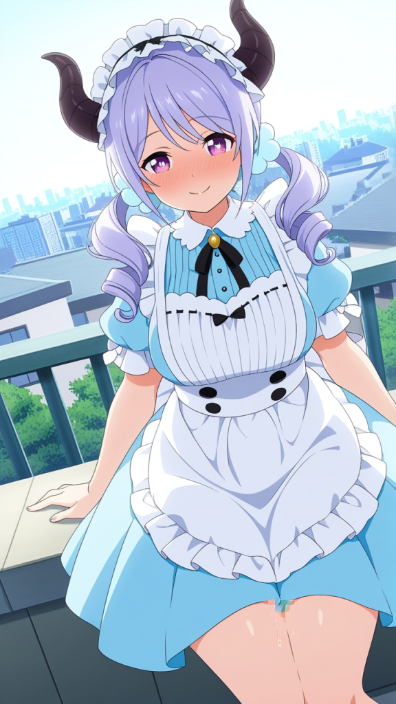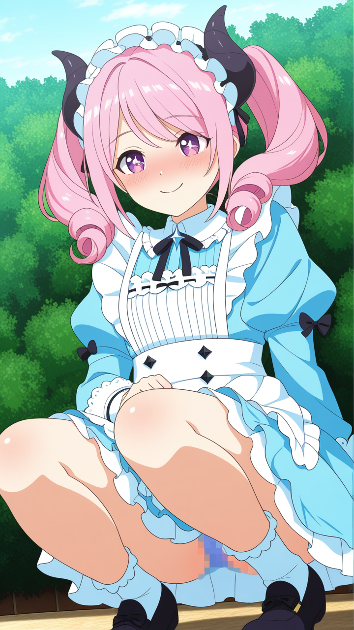 美少女,おっぱい,おしり,乳首,野外露出,露出,屋外,,水色のロールツインテール、毛先ふんわりカール,紫の瞳、丸くてキラキラした目,普通体型、少しむっちり,ドラゴンメイド服、黒と青の配色、胸元にフリル、悪魔の角ヘッドアクセサリー、白いエプロン,純粋無垢、素直で優しい、少し天然ボケ