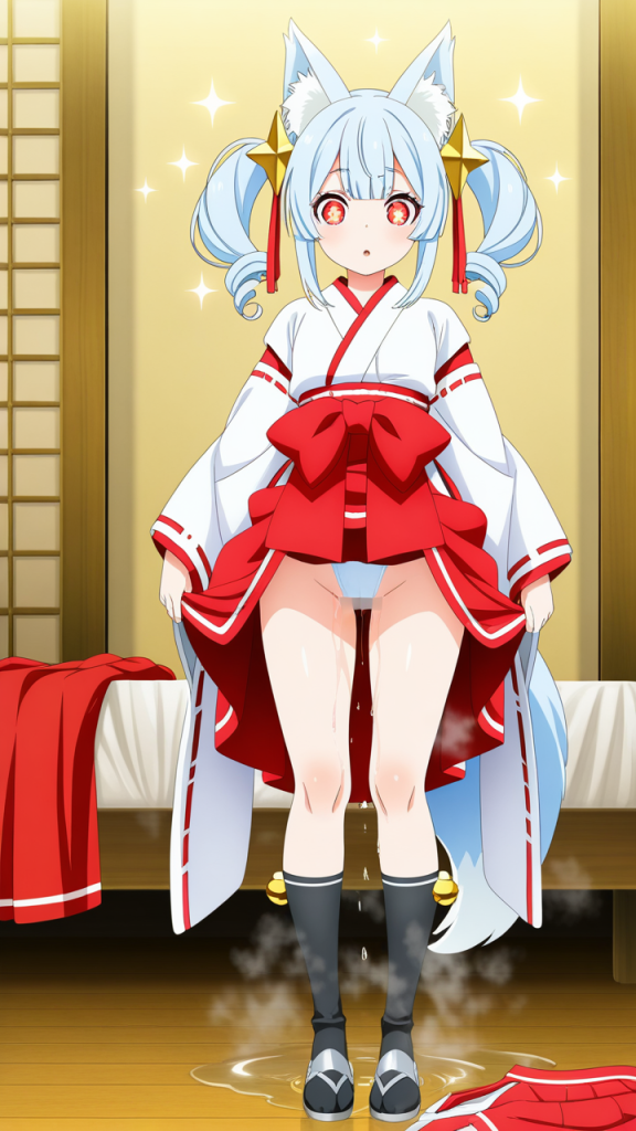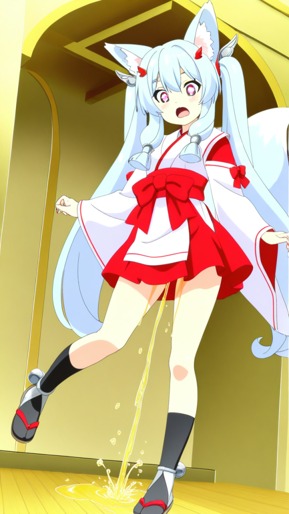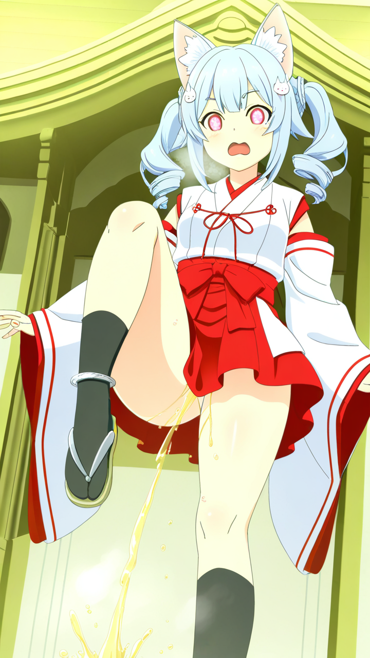 美少女,おっぱい,おしり,M字開脚,食い込み,乳首,パンツ,くぱぁ,おしっこ,お漏らし,放尿,,水色のツインテール、毛先ふんわりカール,深紅の瞳、切れ長の目,背が高くスレンダー,紅と白の巫女服、腰に白い帯紐、狐耳アクセサリー、足首に銀色の房飾り、黒い足袋,天然ドジっ子、ぶっきらぼうだが優しい心を持つ