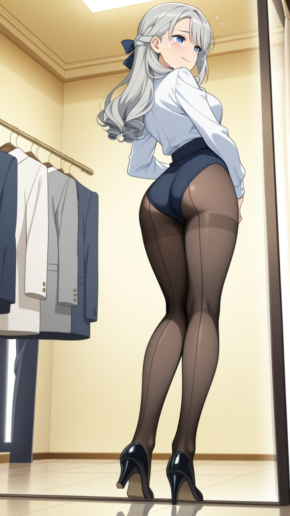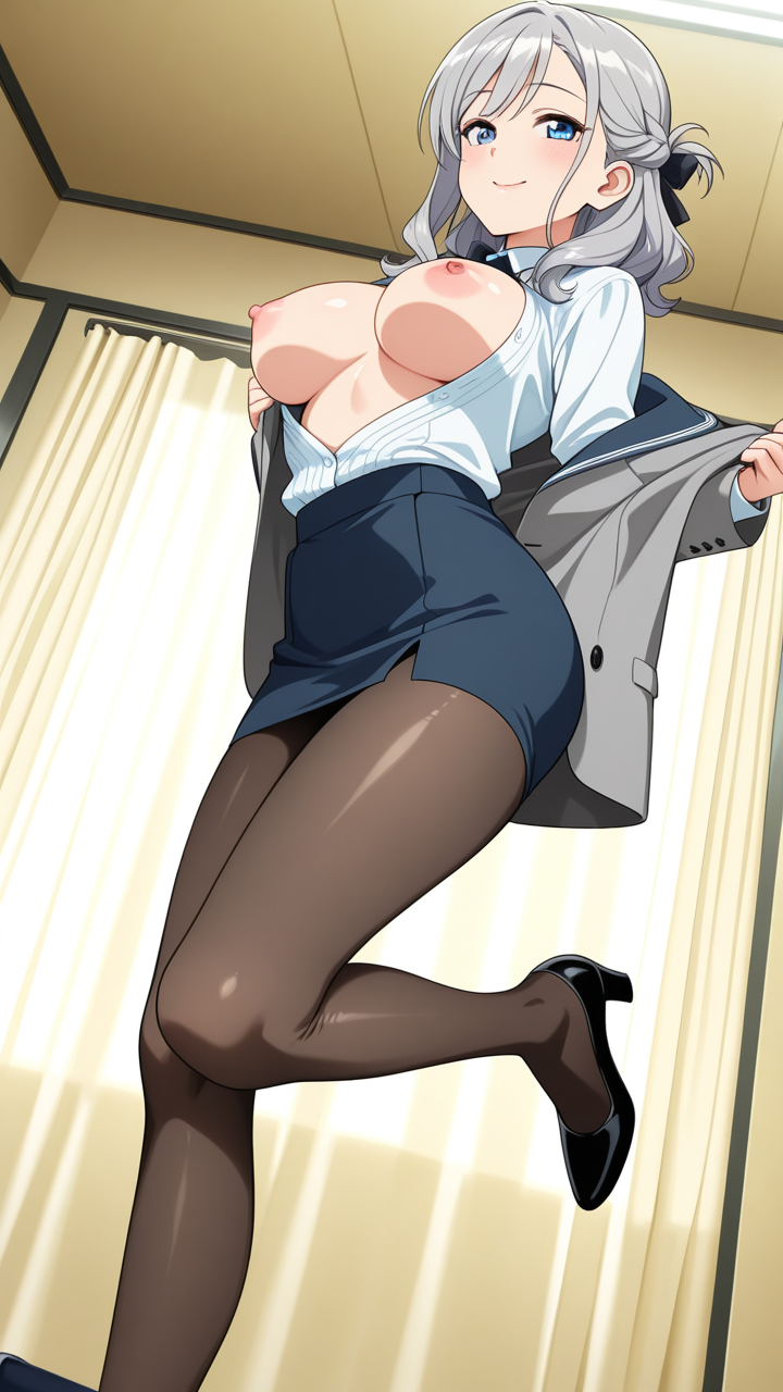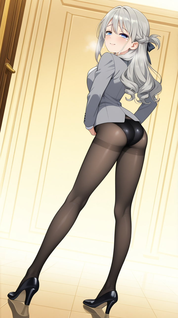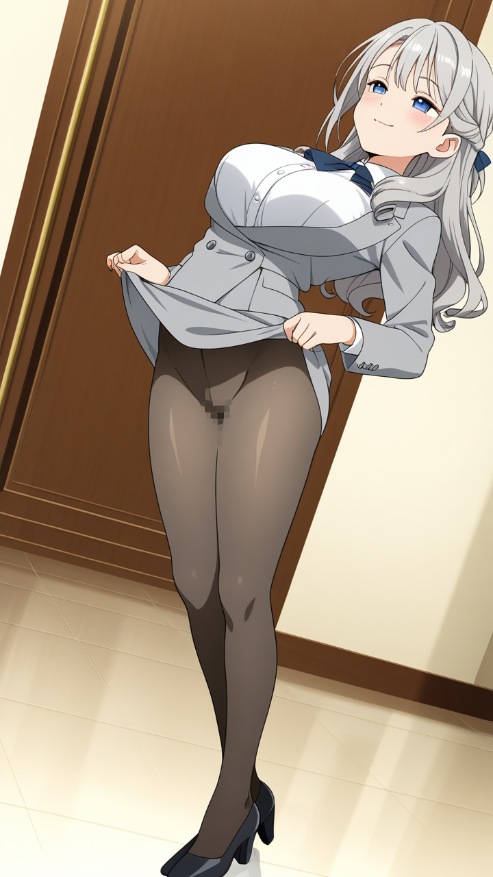 美少女,おっぱい,おしり,M字開脚,食い込み,乳首,パンツ,くぱぁ,バック,後背位,,グレー髪のハーフアップ、毛先ふんわりカール,青い瞳の大きなぱっちり目,巨乳・スレンダー,紺色のビジネスOL衣装、白いシャツ、グレーのテーラードジャケット、黒いシャイニータイツ、黒いヒール,おっとり癒し系、穏やかで優しい笑み