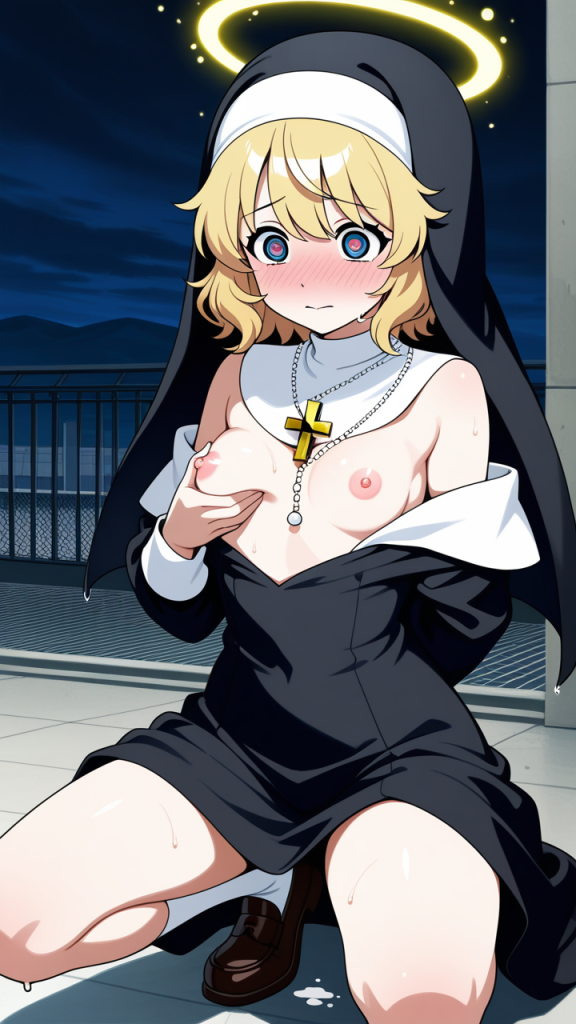 美少女,おっぱい,おしり,M字開脚,食い込み,乳首,パンツ,くぱぁ,母乳,ミルク,,金髪のショートカット、毛先は軽くハネたニュアンス,深紅の瞳、たれ目,細身・長身のモデル体型,白と金色の装飾が映える修道女服、胸元に金色のクロス、腰に白いロザリオ、頭上には光る天使の輪、足元は黒いローファー,ミステリアスで、儚さと深い知識を秘めた雰囲気