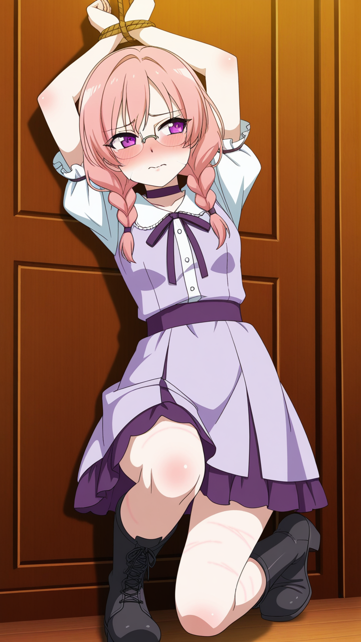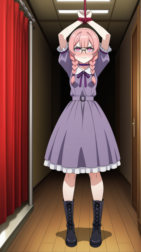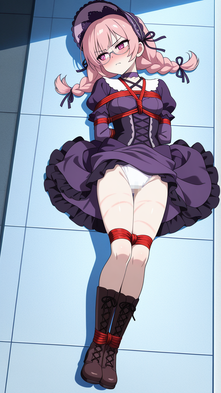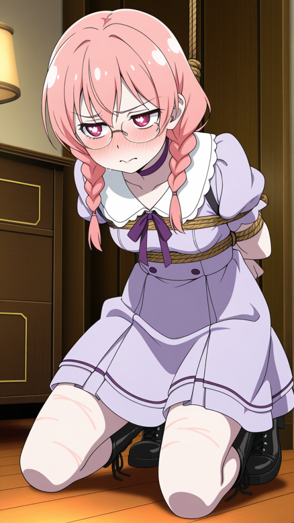 美少女,おっぱい,おしり,乳首,縛り,ロープ,拘束,SM,ボンデージ,,ピンク髪のツインおさげ,深紅の瞳、垂れ目気味のハーフ目,貧乳・長身,黒と薄紫のゴシックロリータドレス、胸元に深紅のリボン、黒いレースアップブーツ、銀縁の眼鏡、首に紫のチョーカー,気の強いボーイッシュで、ツンデレ気味。毒舌だが内心は優しい