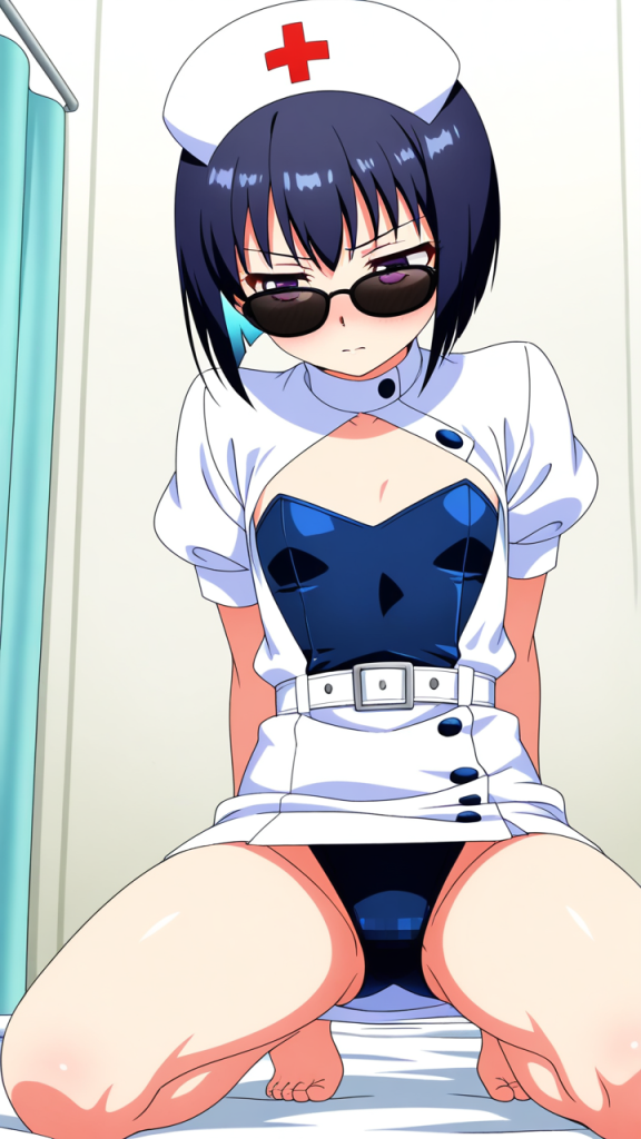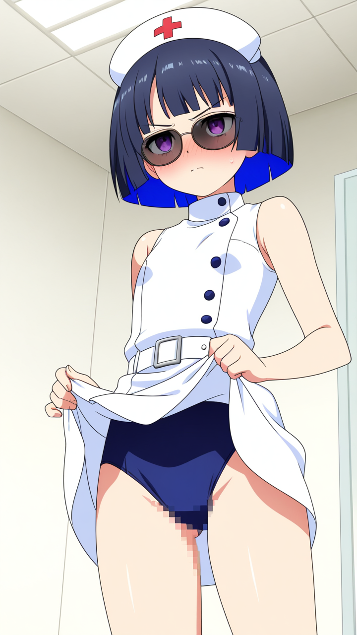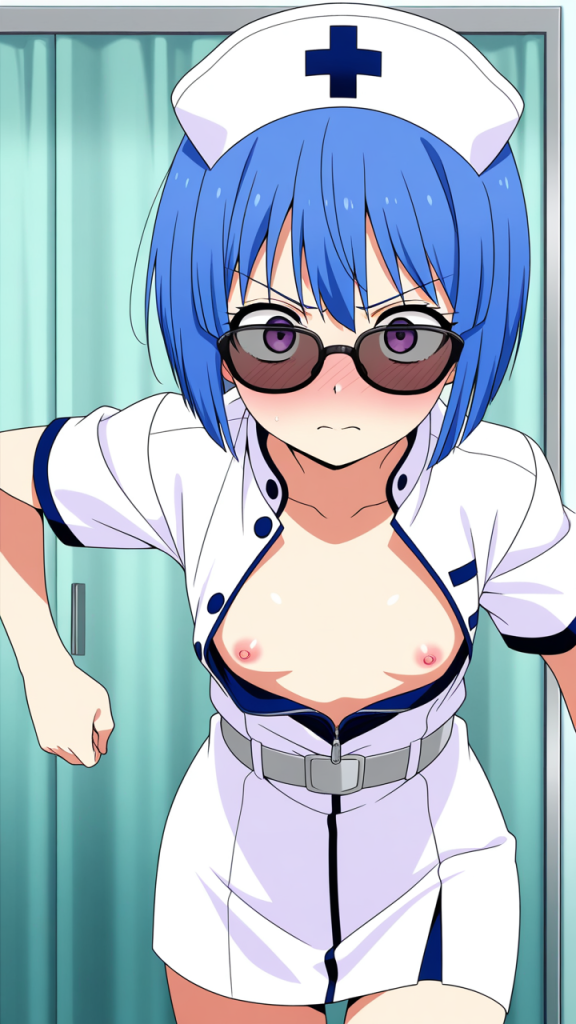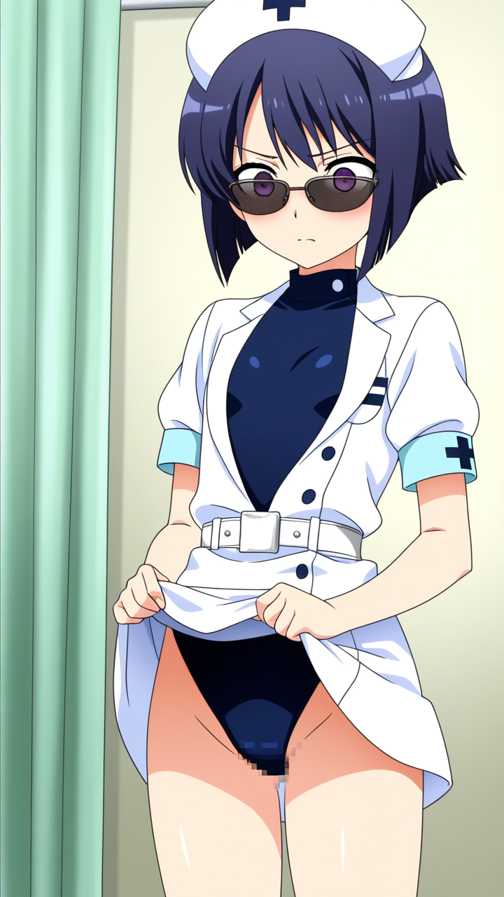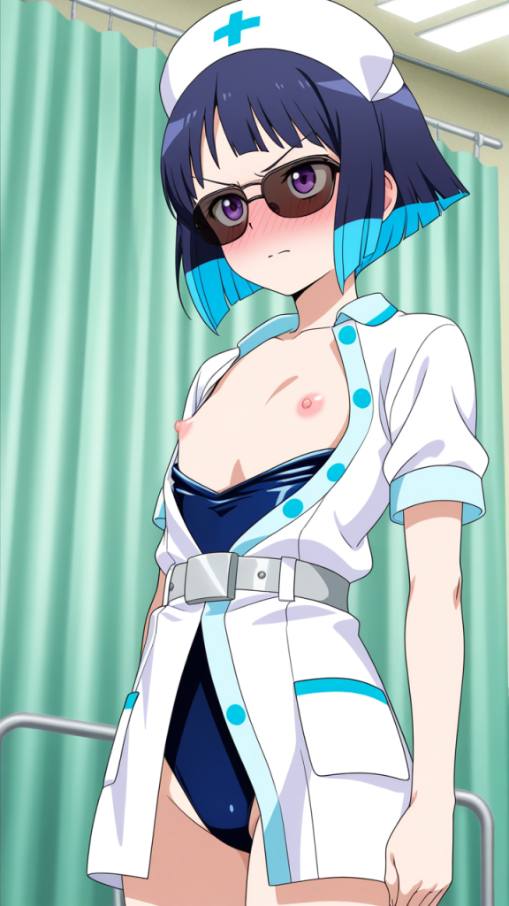 美少女,おっぱい,乳首,ナース,ナース服,看護師,コスプレ,,青髪のショートカット、毛先が軽くハネたニュアンス,紫の瞳、たれ目,貧乳・長身,黒と青のスポーティックレオタード、腰に銀色のベルト、サングラス,勝ち気・負けず嫌い、常に前向き