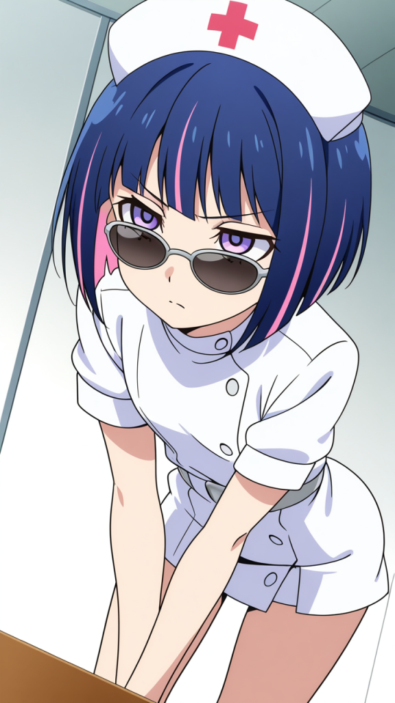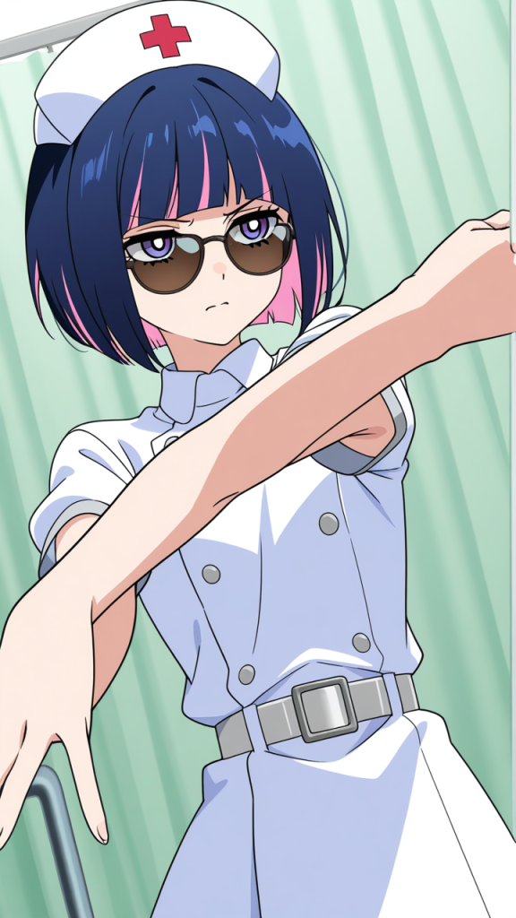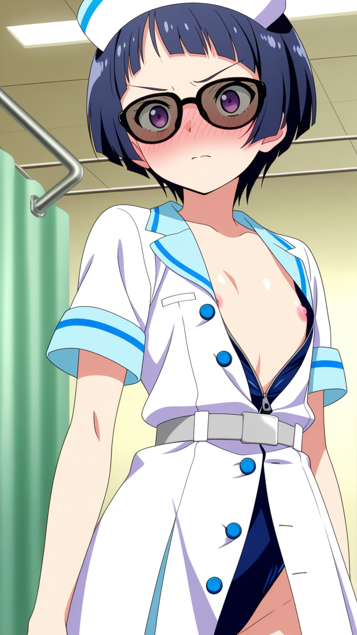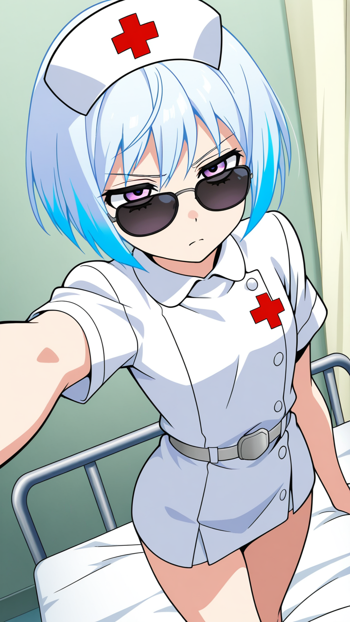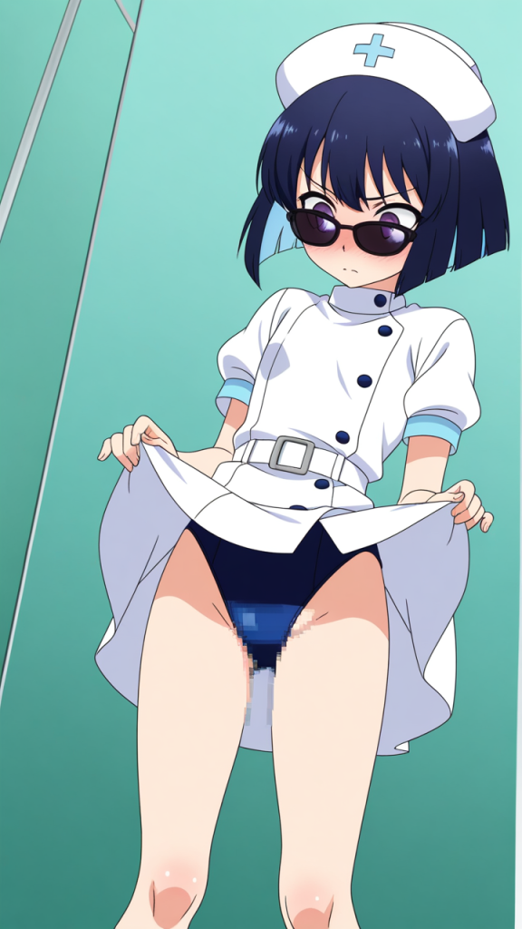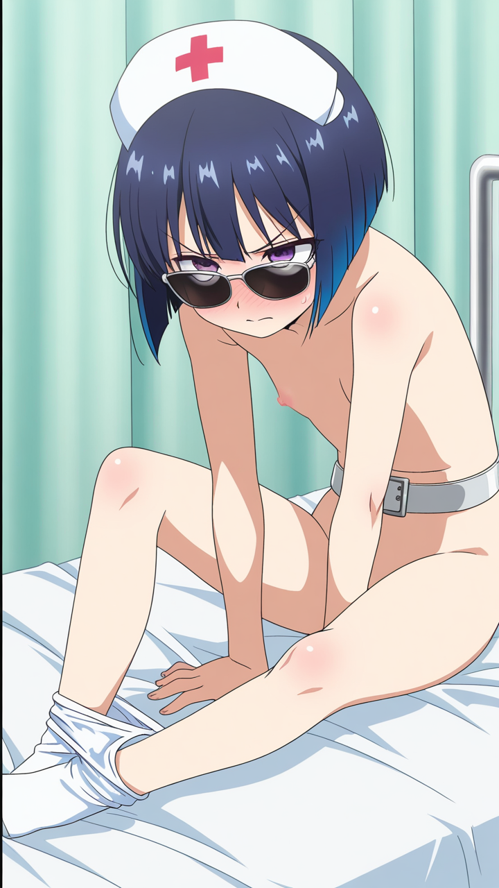 美少女,おっぱい,乳首,ナース,ナース服,看護師,コスプレ,,青髪のショートカット、毛先が軽くハネたニュアンス,紫の瞳、たれ目,貧乳・長身,黒と青のスポーティックレオタード、腰に銀色のベルト、サングラス,勝ち気・負けず嫌い、常に前向き
