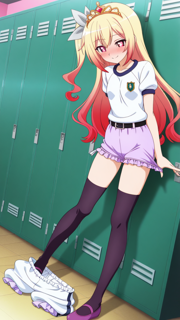 美少女,おっぱい,おしり,体操服,ブルマ,体育,,金からピンクへのグラデーション、サイドテール,深紅の瞳、丸くてキラキラした目,細身・長身モデル体型,黒と深紅の魔法少女衣装、胸元にシルバーのリボン、腰に黒いベルト、深紅のティアラ型ヘッドドレス、黒いニーハイソックス、紫のバレエシューズ,腹黒系、甘い笑顔の裏で計算高い