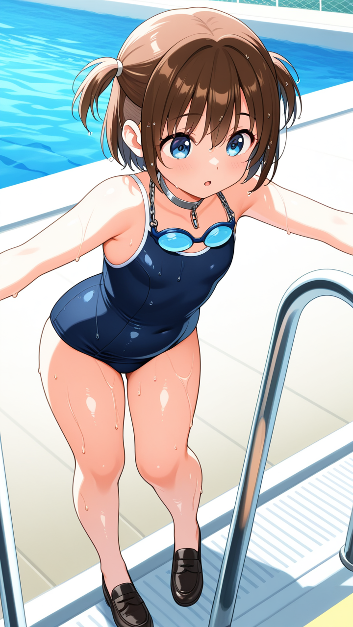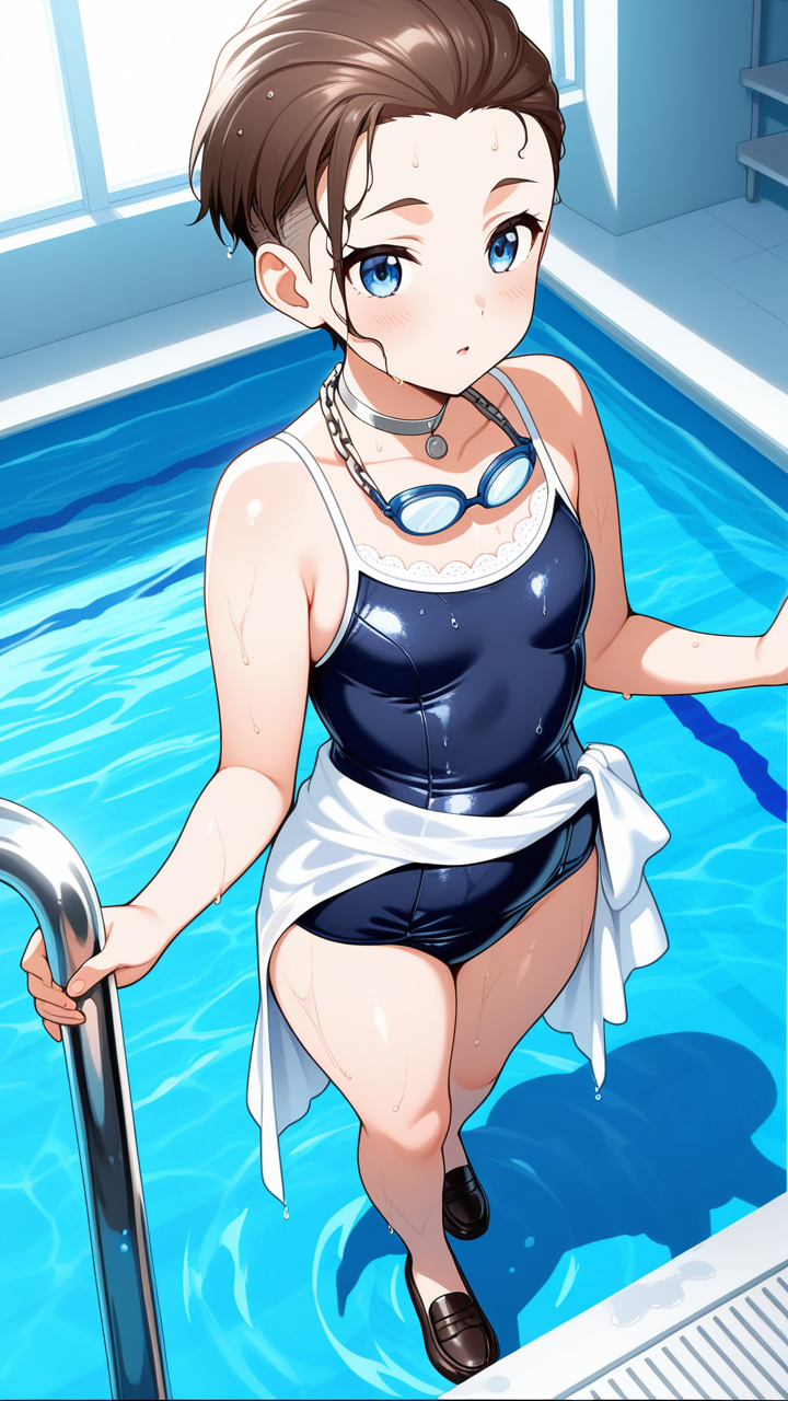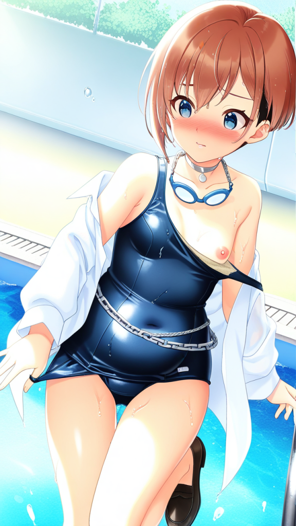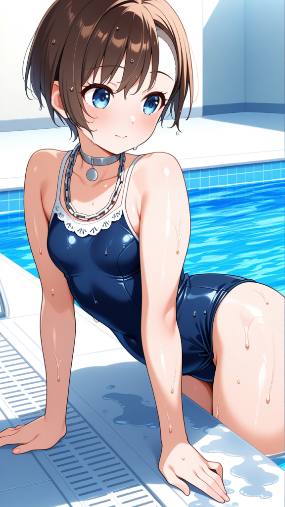 美少女,おっぱい,おしり,スク水,スクール水着,水着,,茶髪の刈り上げショート、毛先は軽くハネたニュアンス,青い瞳の大きなぱっちり目,小柄でむっちりとした体型,紺と白の和洋折衷ドレス、胸元に白いレース、腰に銀色のチェーンベルト、首に銀色のチョーカー、黒いローファー,お嬢様気質で上品だが、どこか親しみやすく優しい