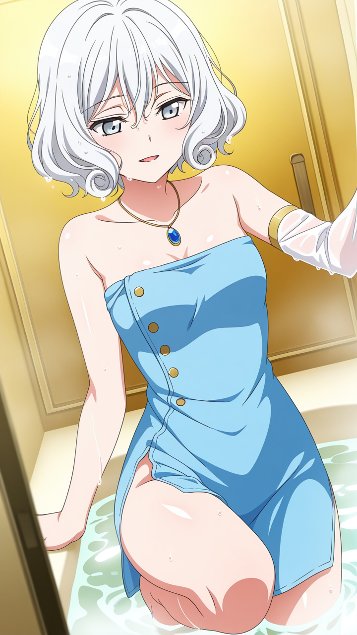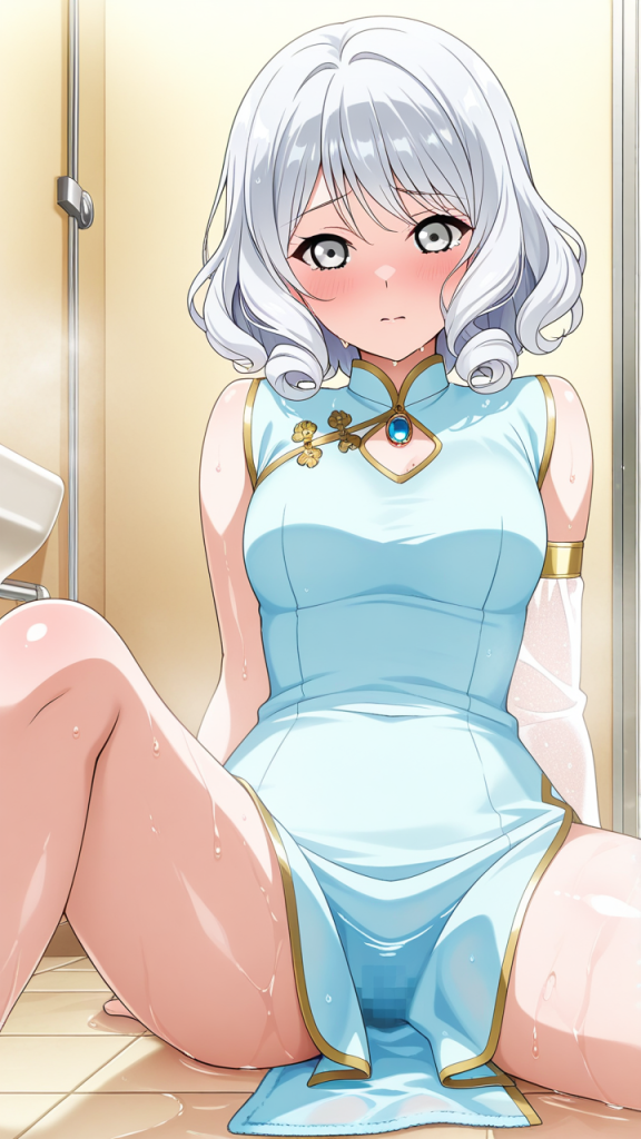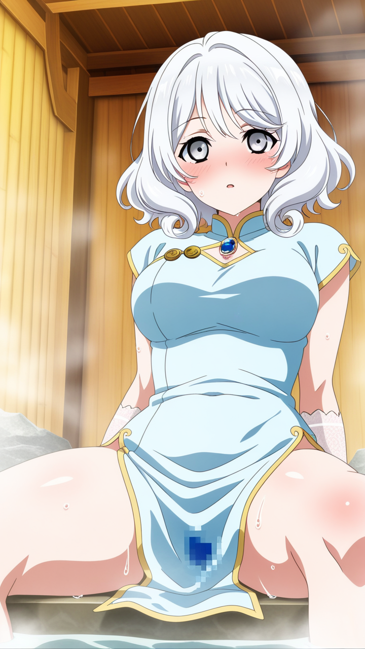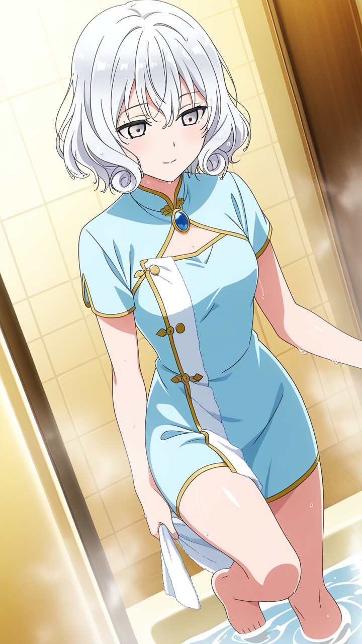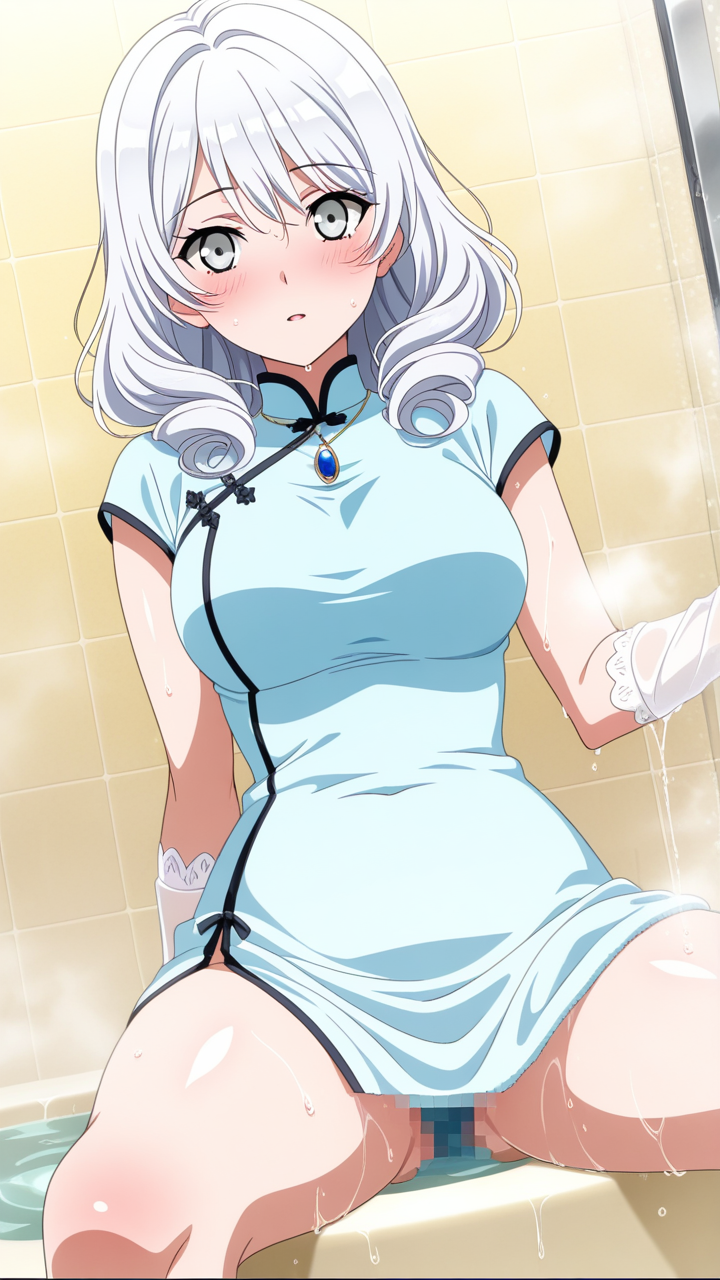 美少女,おっぱい,おしり,乳首,風呂,入浴,温泉,シャワー,,白髪の内巻きセミロング,銀色の細めのクールな瞳,背が高くスレンダー,青と白のチャイナドレス、金色の装飾的なボタン、腕には白い絹のアームカバー、首には青い宝石のペンダント,気高いお嬢様、知的でクール、控えめながら威厳がある