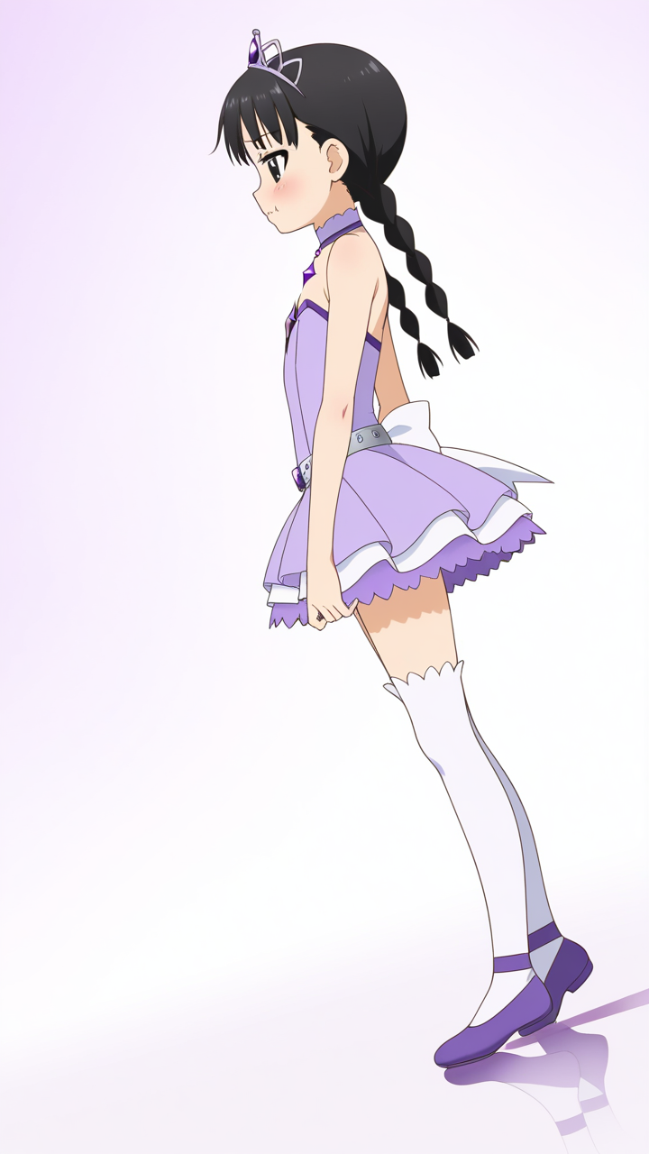 purple twin braids, fluffy at the ends,black eyes, round and sparkling,petite, flat chest,purple and silver magical girl outfit, white ribbon on chest, silver belt, purple tiara-style headdress, white knee-high socks, purple ballet shoes,spoiled and sweet-natured, innocent and cheerful