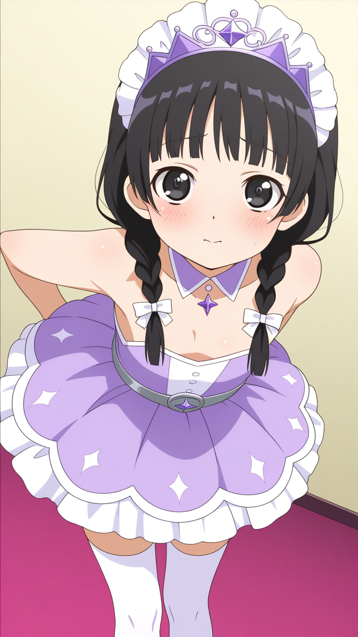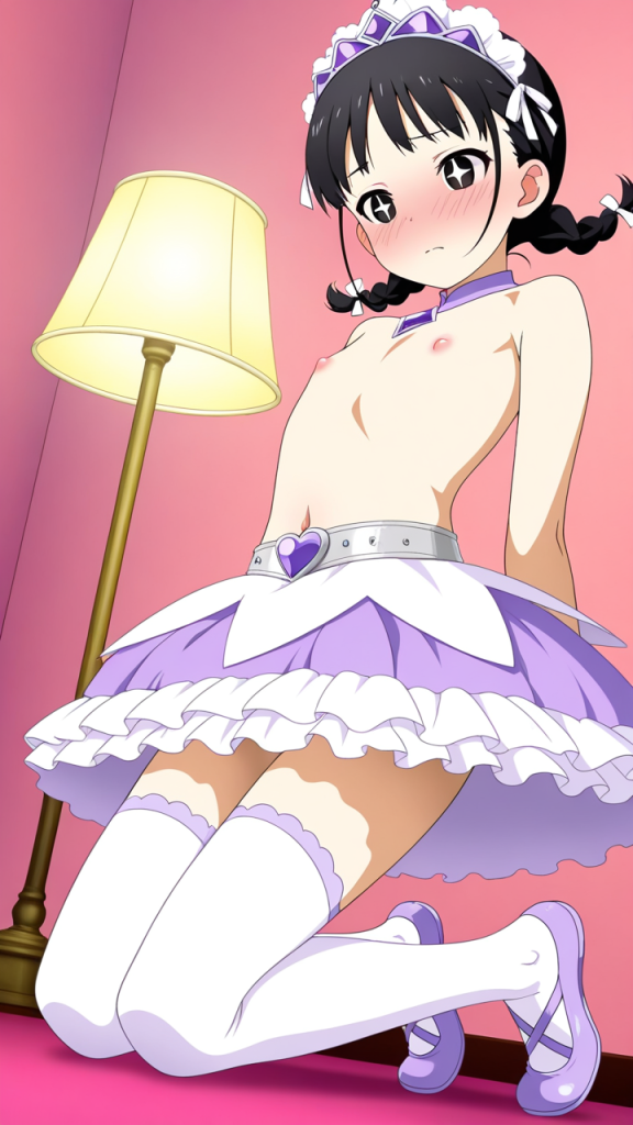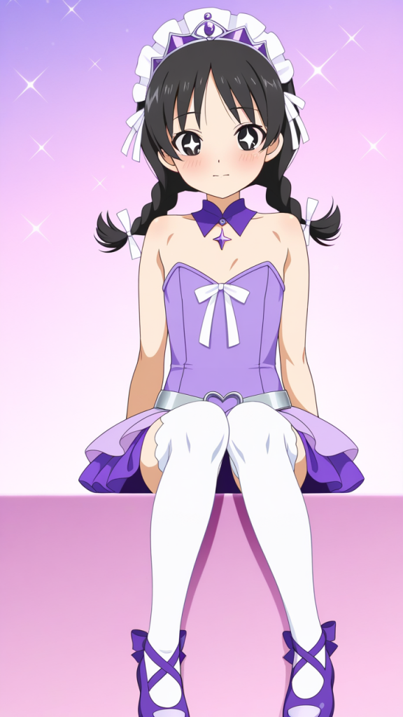 美少女,貧乳,おっぱい,乳首,微乳,ぺたんこ,スレンダー,,紫髪のツインおさげ、毛先ふんわり,黒い瞳、丸くてキラキラした目,貧乳・小柄,紫と銀色の魔法少女衣装、胸元に白いリボン、腰に銀色のベルト、紫色のティアラ型ヘッドドレス、白いニーソックス、紫色のバレエシューズ,甘えんぼ、おっとり
