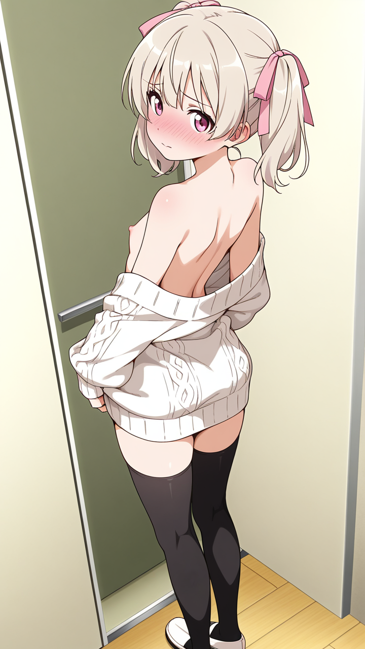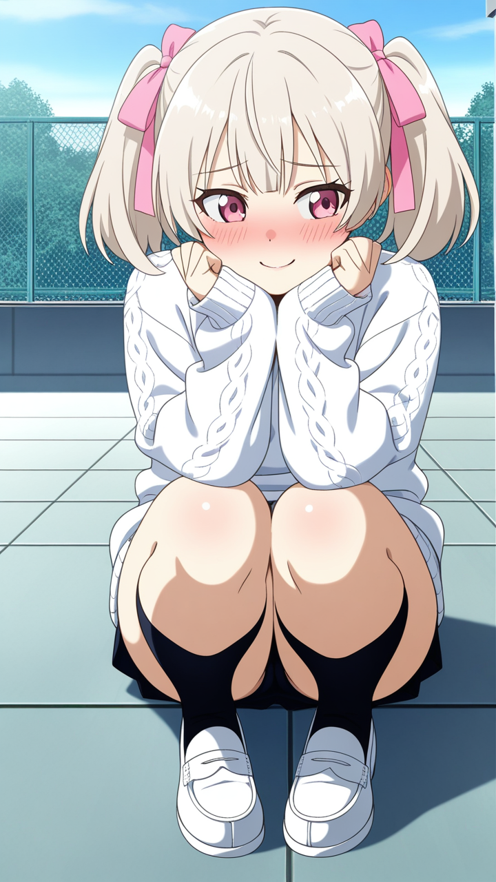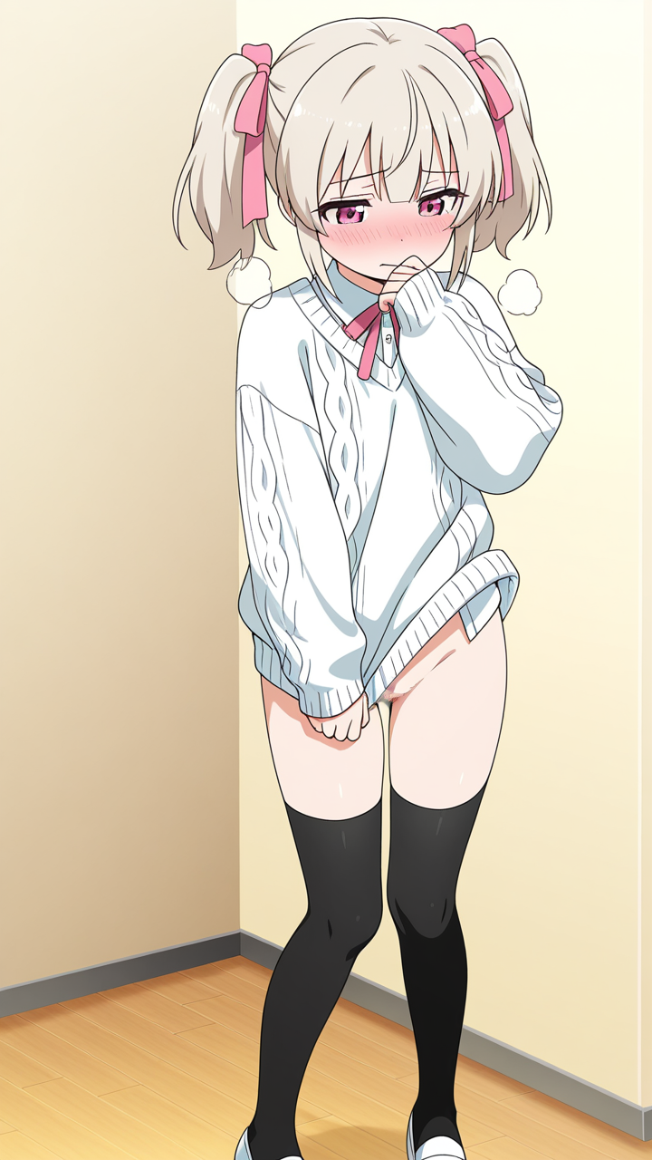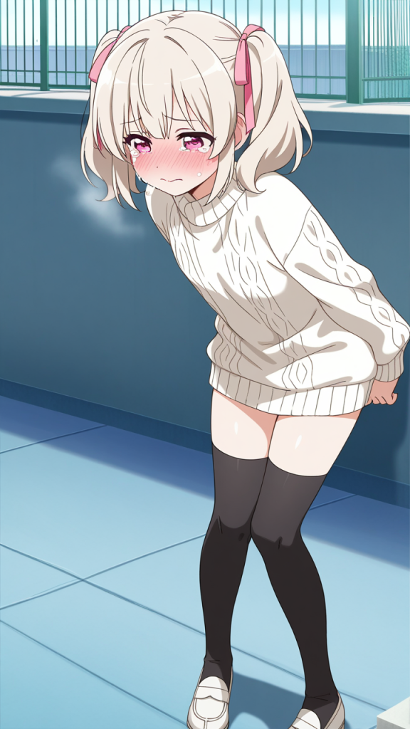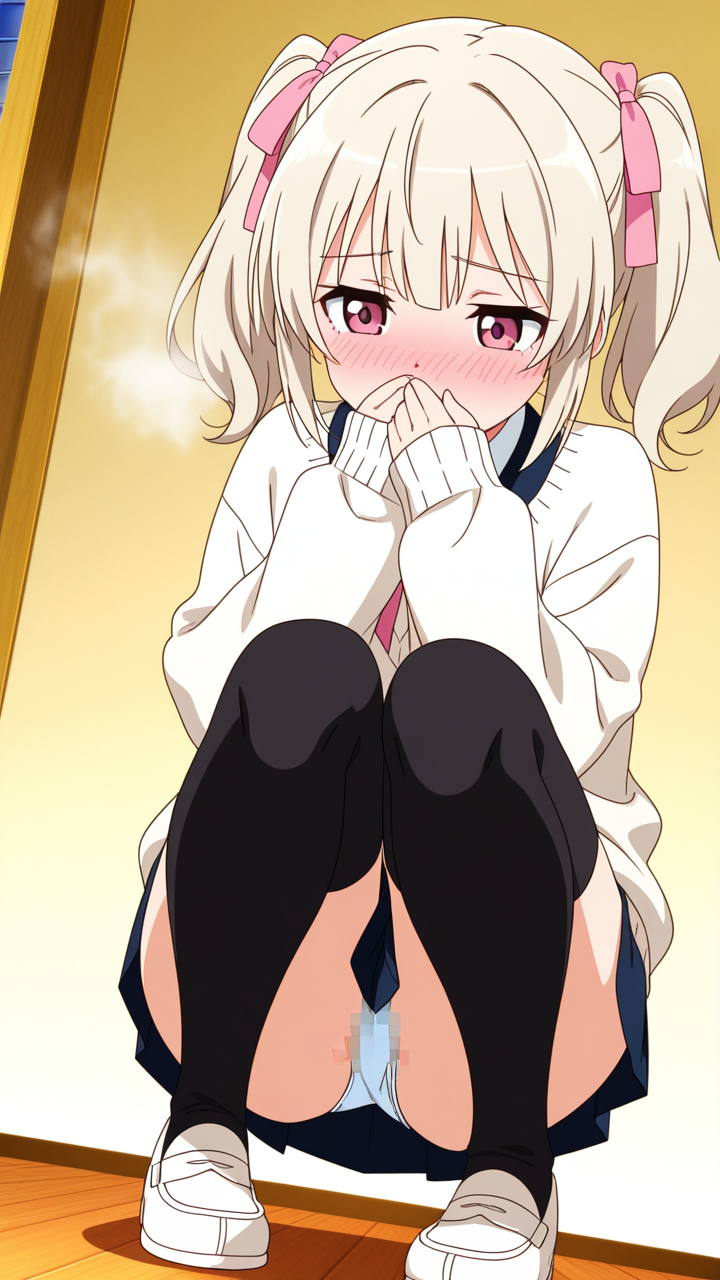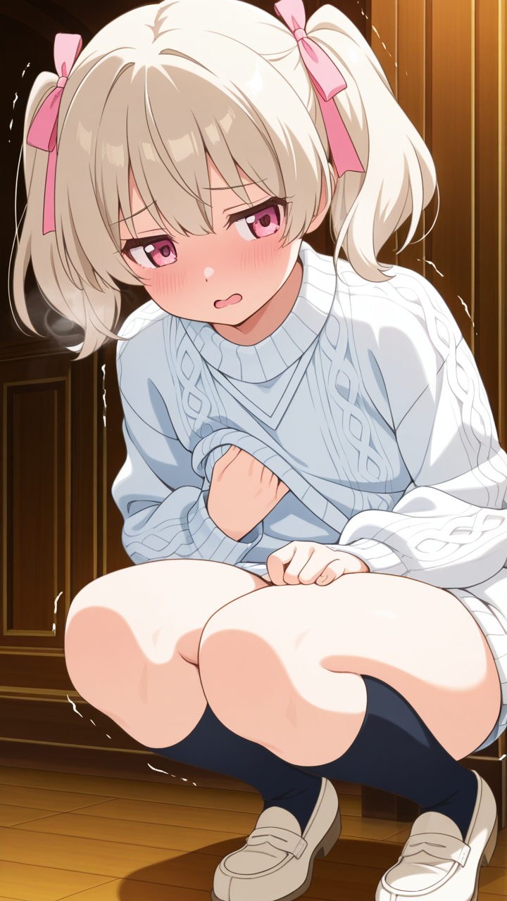 美少女,おっぱい,おしり,M字開脚,食い込み,乳首,パンツ,くぱぁ,,プラチナブロンドのロールツインテール,ピンク色のたれ目,小柄でむっちりした体型,白ニットセーター、黒ニーソックス、ピンクのリボンヘアアクセサリー、白いローファー,恥ずかしがり屋で控えめ、優しく儚げな雰囲気