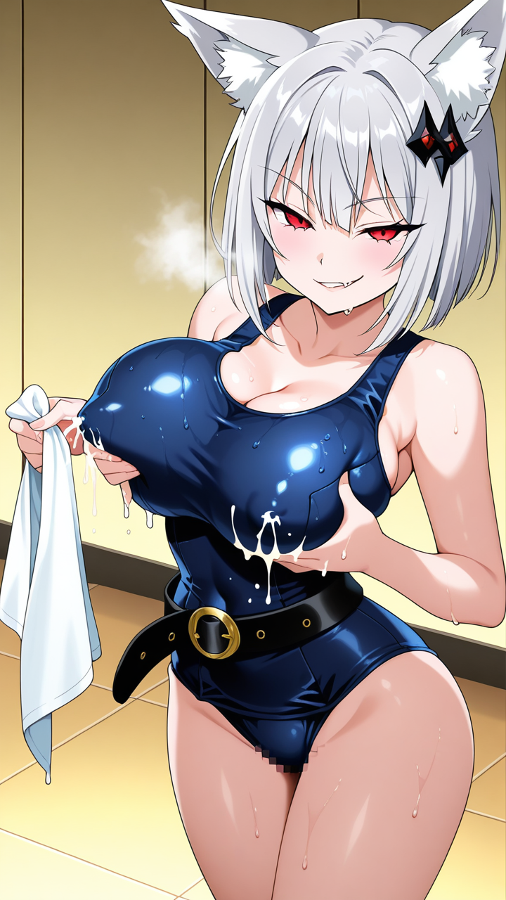 美少女,おっぱい,おしり,M字開脚,食い込み,乳首,パンツ,くぱぁ,母乳,ミルク,,銀髪のアップスタイル、後れ毛がふんわり,赤い瞳、切れ長の目,巨乳・スレンダー,スクール水着、狐耳ヘッドアクセサリー、腰に黒いベルト,腹黒系、含み笑い