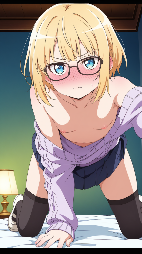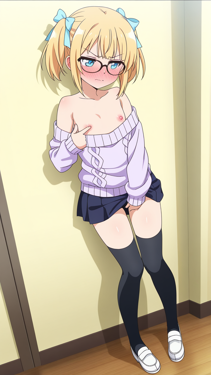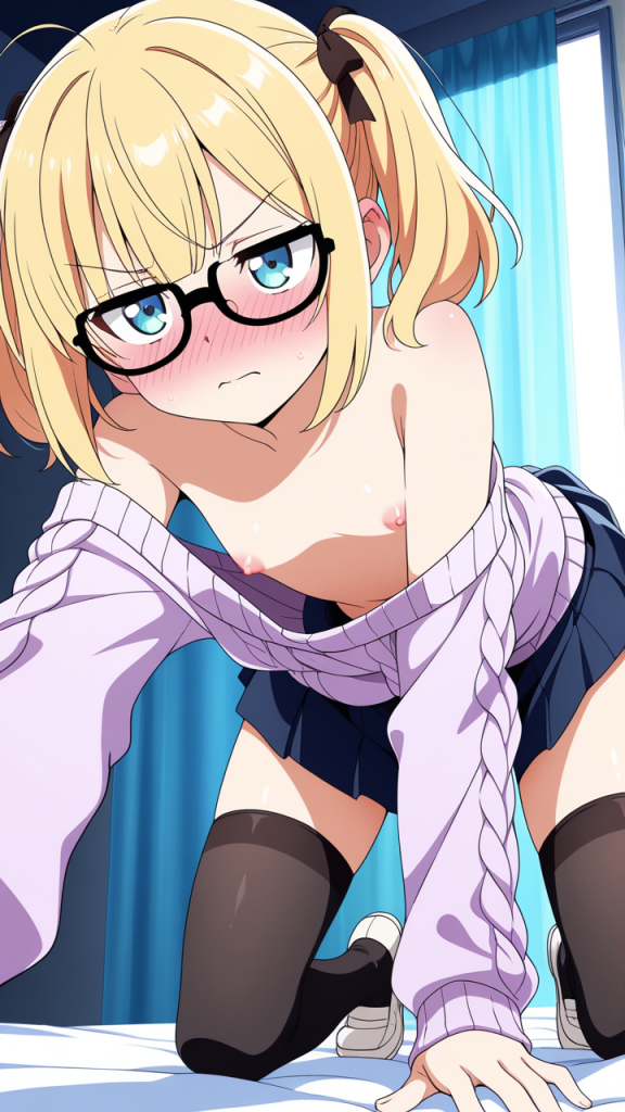 美少女,おっぱい,おしり,M字開脚,乳首,パンツ,くぱぁ,オナニー,自慰,指,マスターベーション,,金髪のロールツインテール,水色の大きなぱっちり目,貧乳・小柄,薄紫のニットセーター、黒いニーソックス、白いローファー、フレームの眼鏡,毒舌で皮肉屋、でもツンデレ