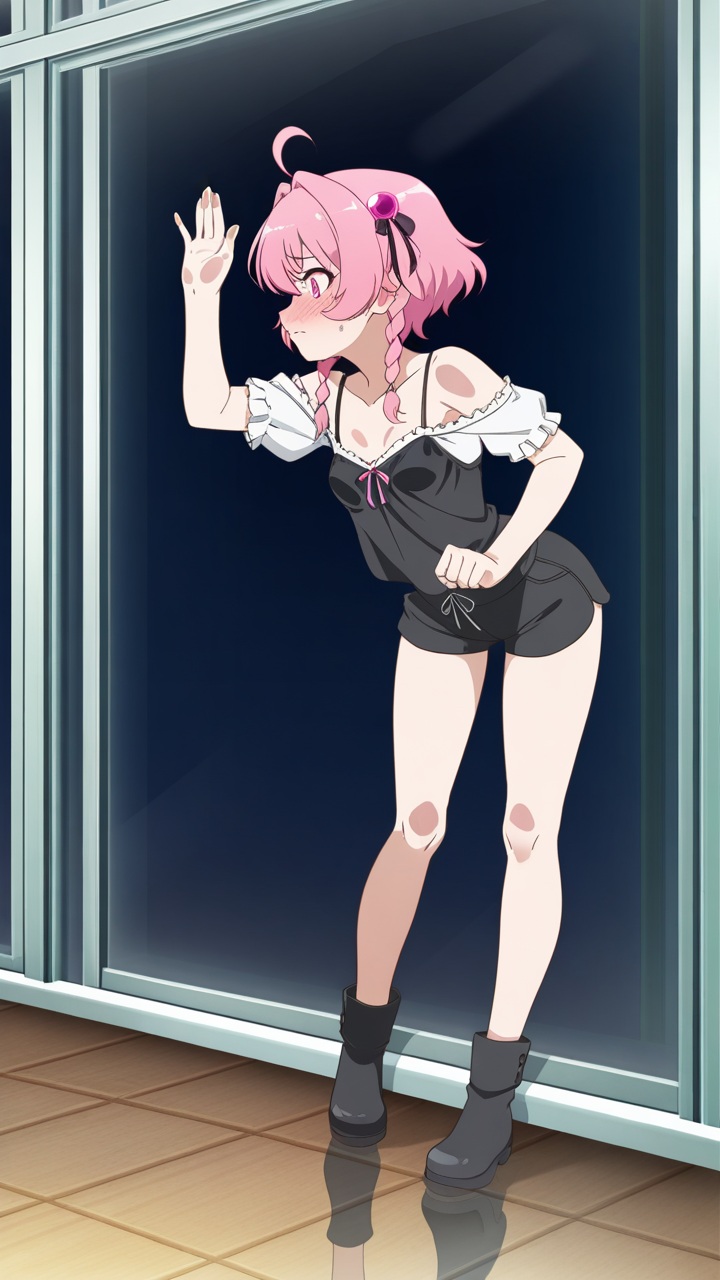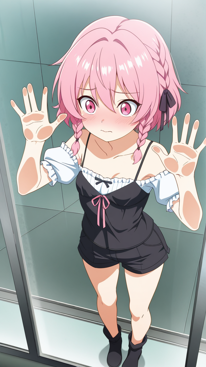 美少女,おっぱい,乳首,ガラス,押し付け,圧迫,胸,巨乳,貧乳,,マゼンタ色の三つ編み,ピンクの瞳、細めのクールな目,貧乳・小柄,白のシースルーブラウス、黒いキャミソール、黒いショートパンツ、マゼンタ色のリボンヘアアクセサリー、黒いアンクルブーツ,気の強いボーイッシュ、勝気で口が悪い
