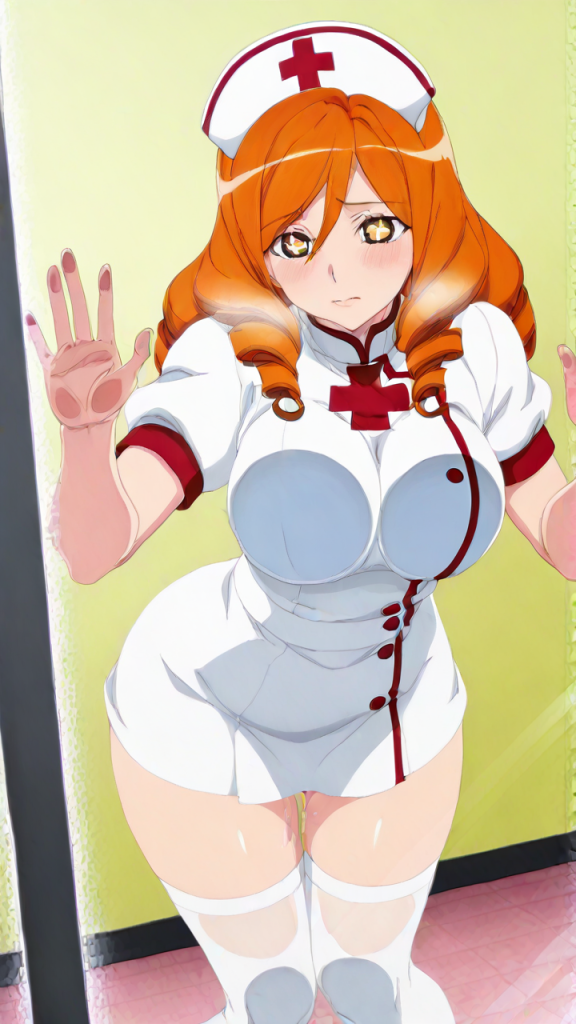 美少女,おしり,ガラス,押し付け,圧迫,ヒップ,くぱぁ,パンツ,,オレンジ髪の内巻きセミロング,深紅の瞳、丸くてキラキラした目,スポーティー・筋肉質,白を基調としたナース服、胸元に赤十字マーク、腰に深紅の大きなリボンタイ、白いニーソックス、赤いマリンシューズ,ミステリアス、どこか秘密めいた表情