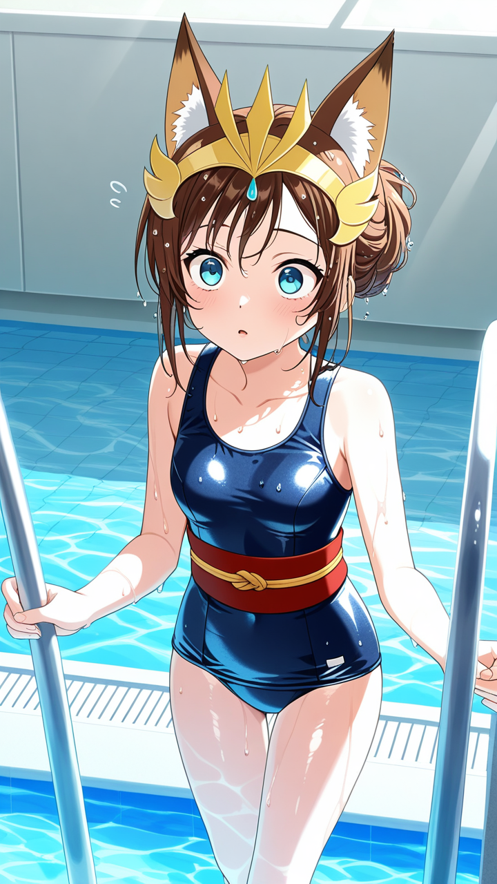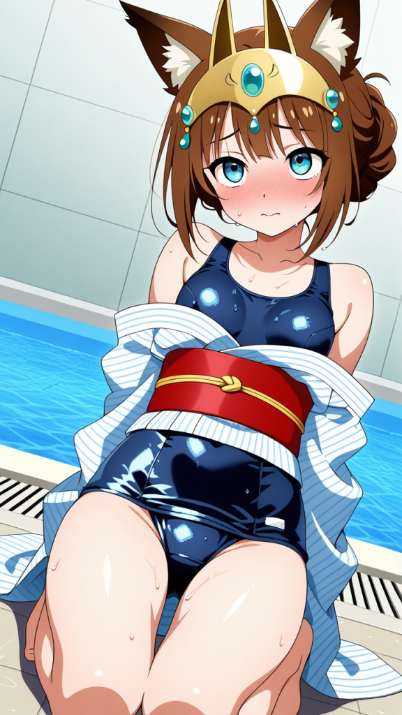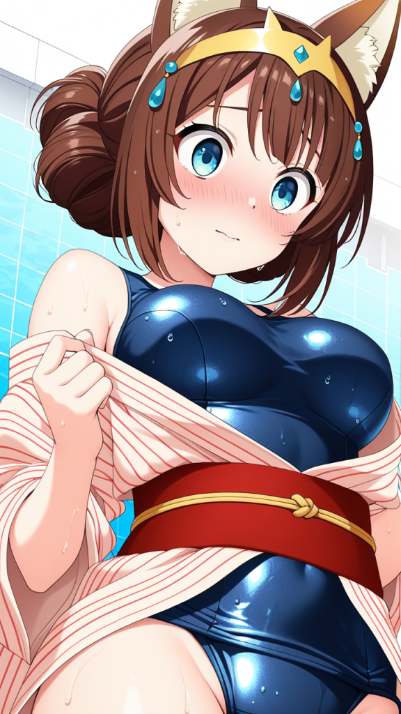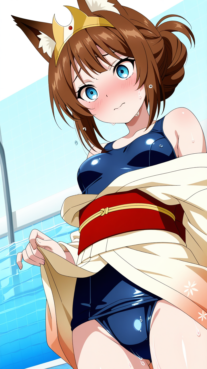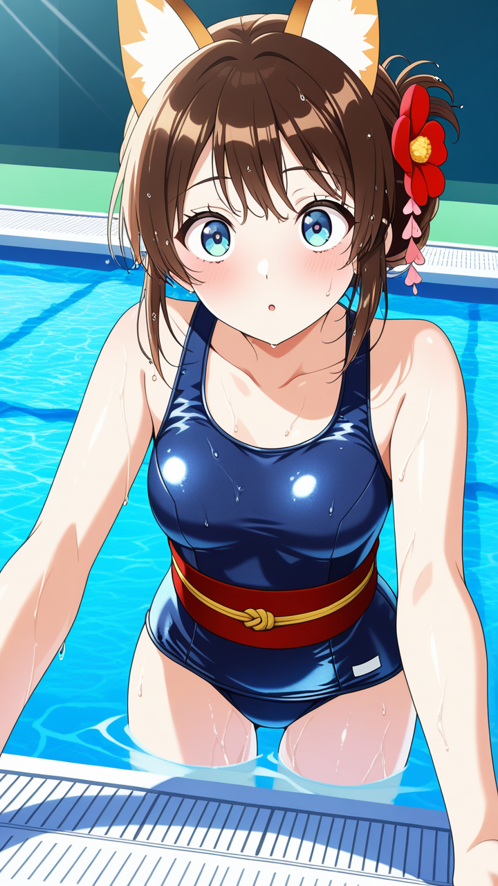 美少女,おっぱい,おしり,スク水,スクール水着,水着,,茶髪のアップスタイル、後れ毛がふんわり,水色の瞳、つり目,巨乳・スレンダー,紅白の帯付き浴衣、腰に金色の帯締め、狐耳ヘッドアクセサリー,甘えんぼ、はにかみ屋