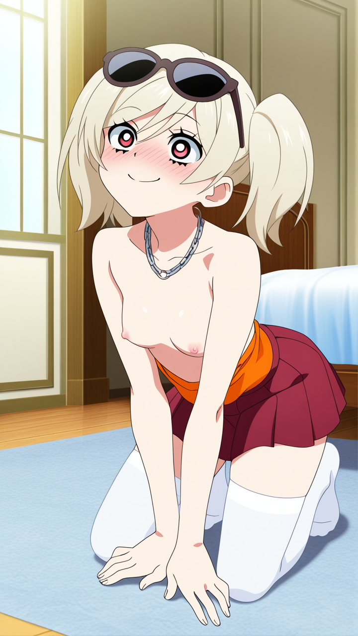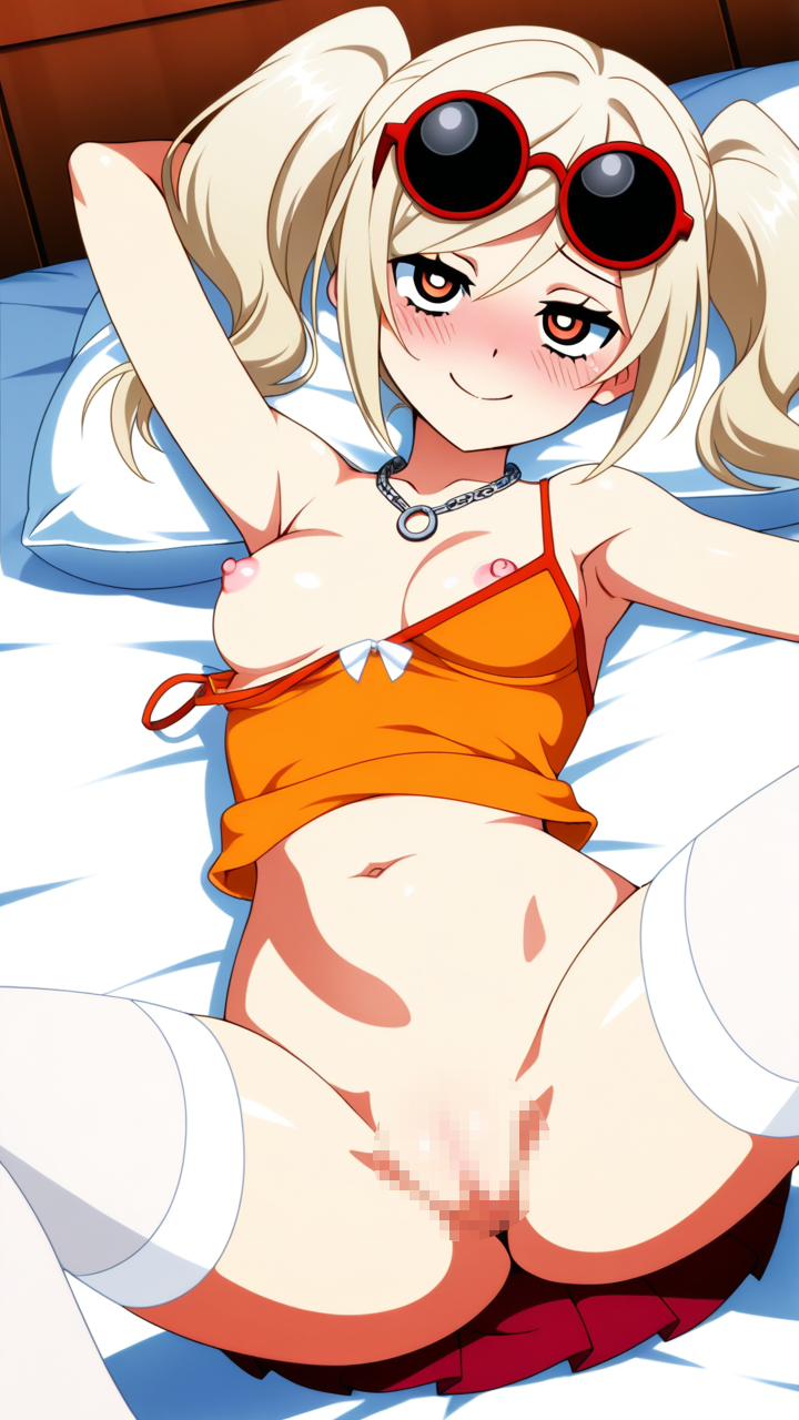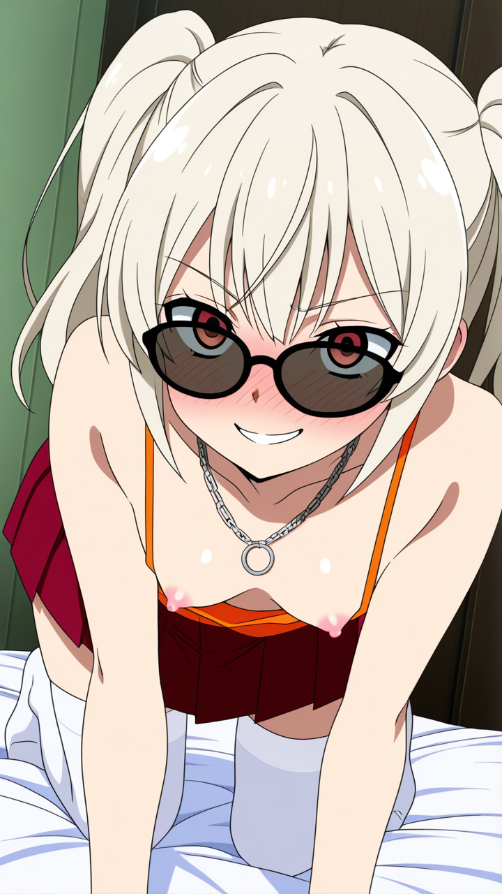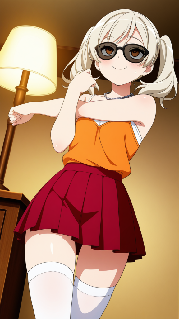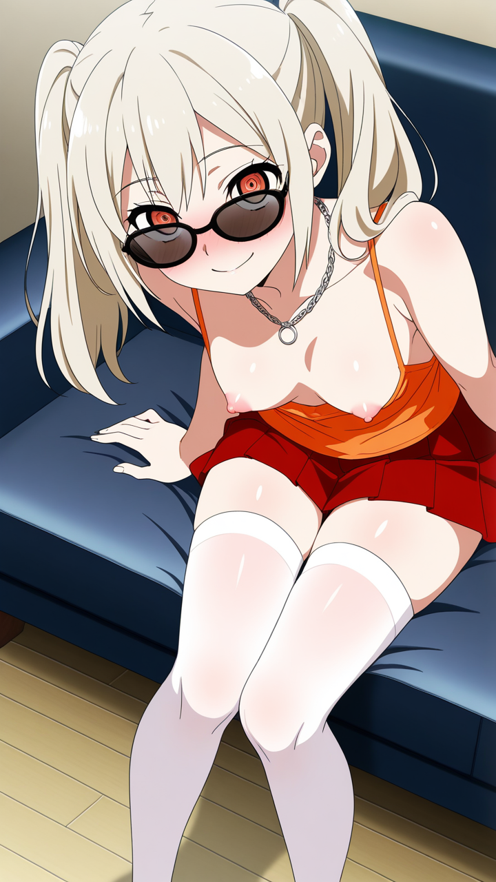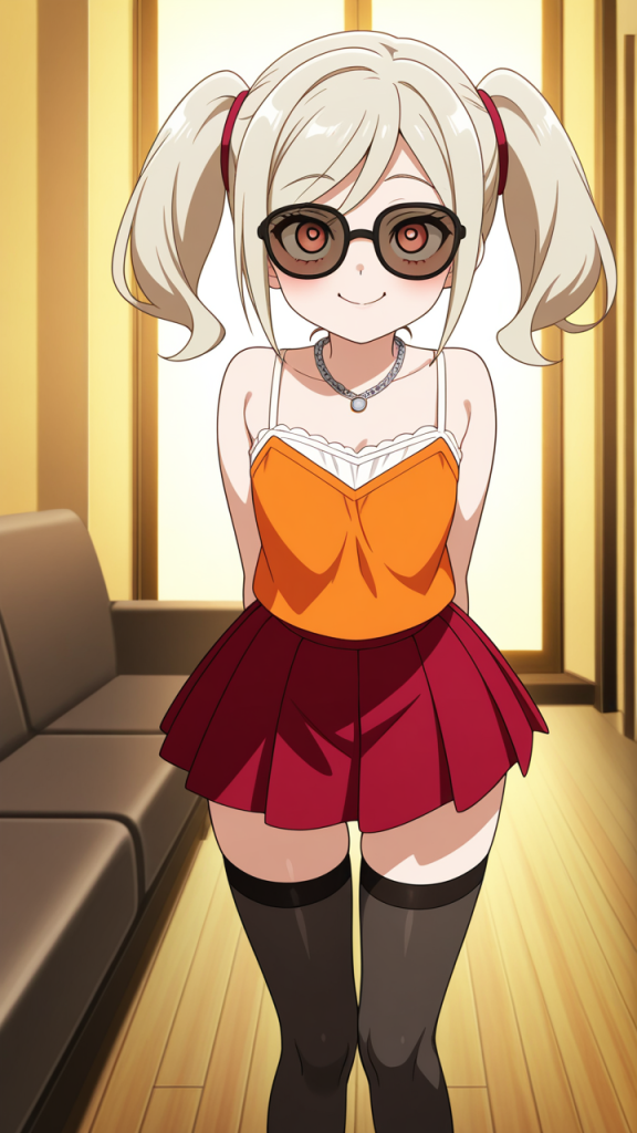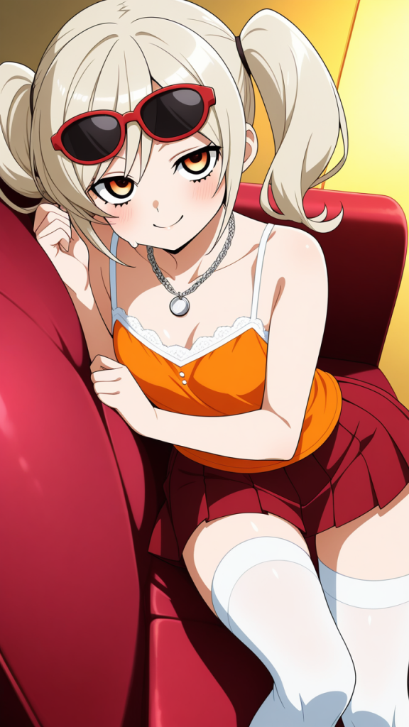 platinum blonde roll twintails,deep crimson eyes, upturned eyes,normal build, soft and slightly round figure,white sheer blouse, orange camisole, deep red pleated skirt, black sunglasses, platinum chain necklace,energetic and cheerful, always smiling and brightening those around her