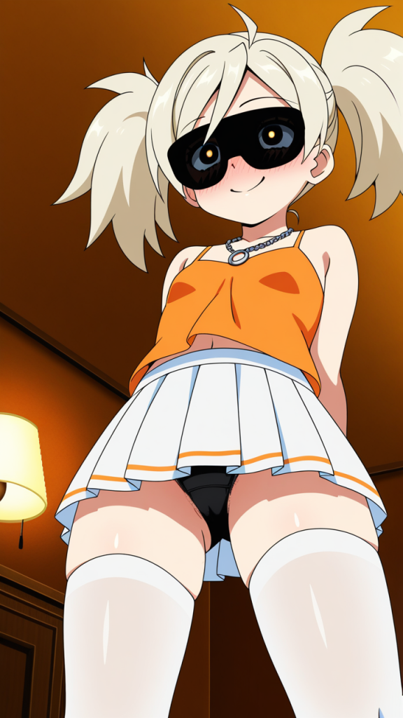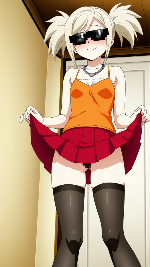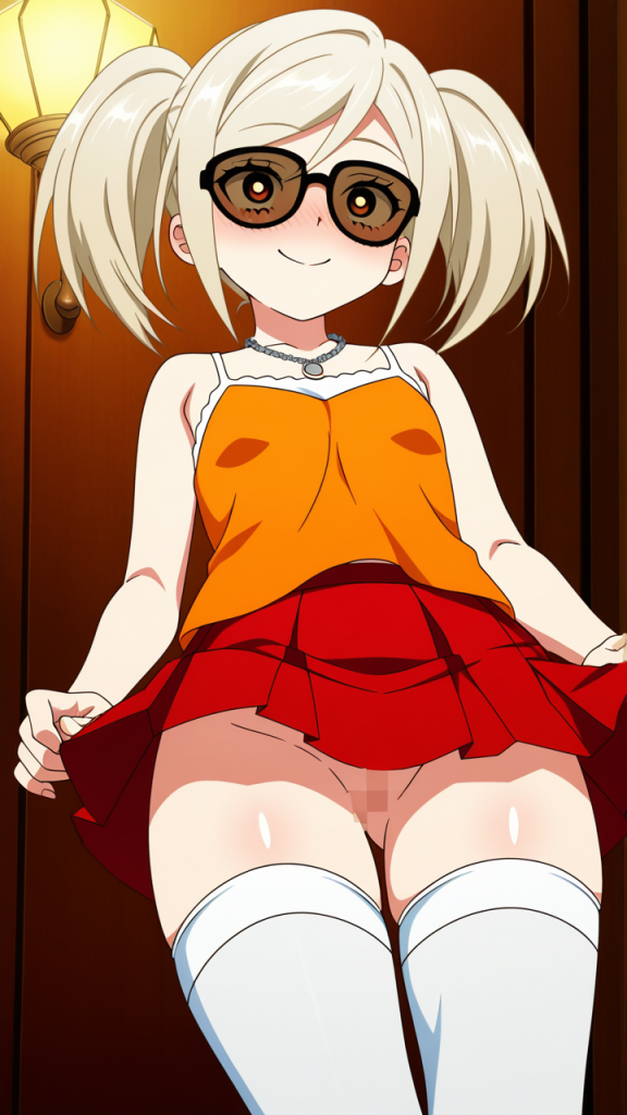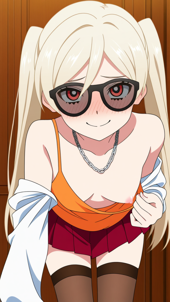 美少女,おっぱい,おしり,ニーソ,絶対領域,太もも,,プラチナ髪のロールツインテール,深紅の瞳、つり目,普通体型でやや丸みのある体つき,白いシースルーブラウスにオレンジ色のキャミソール、深紅のプリーツスカート、黒いサングラスにプラチナ色のチェーンネックレス,元気で快活、いつも笑顔で周囲を明るくする