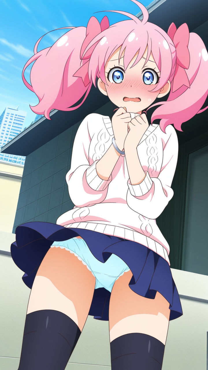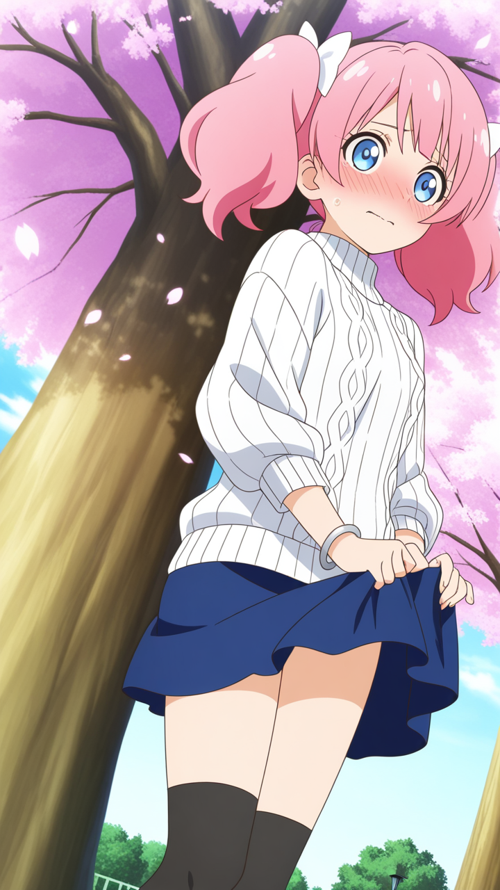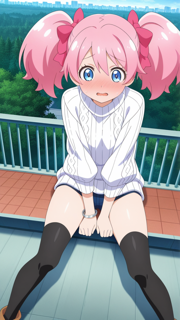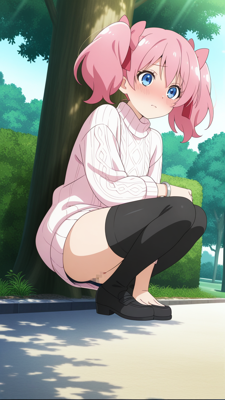 美少女,おっぱい,おしり,乳首,野外露出,露出,屋外,,桜色髪のロールツインテール,青い瞳の大きなぱっちり目,背が高くスレンダー,白ニットセーター、黒ニーソックス、銀色のブレスレット,天然ドジっ子で少し抜けた雰囲気