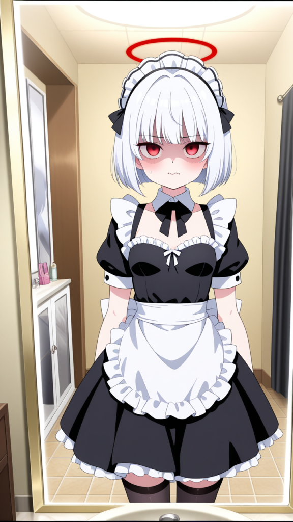 美少女,おっぱい,おしり,乳首,鏡,反射,鏡越し,,白髪の外ハネボブ,赤い瞳のつり目,貧乳・長身,黒のメイド服、白いエプロン、天使の輪、黒いニーソックス,ヤンデレ気味、執着的で嫉妬深い