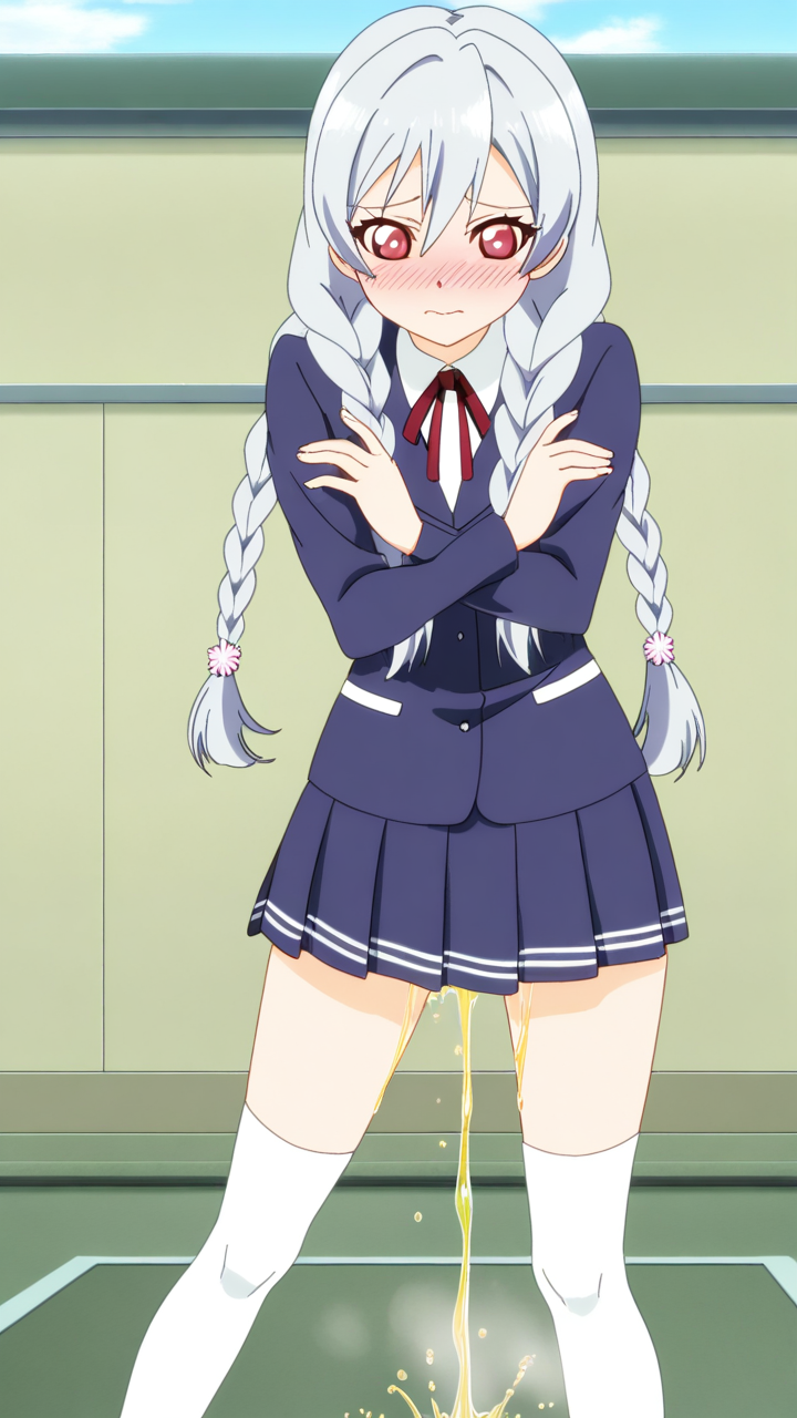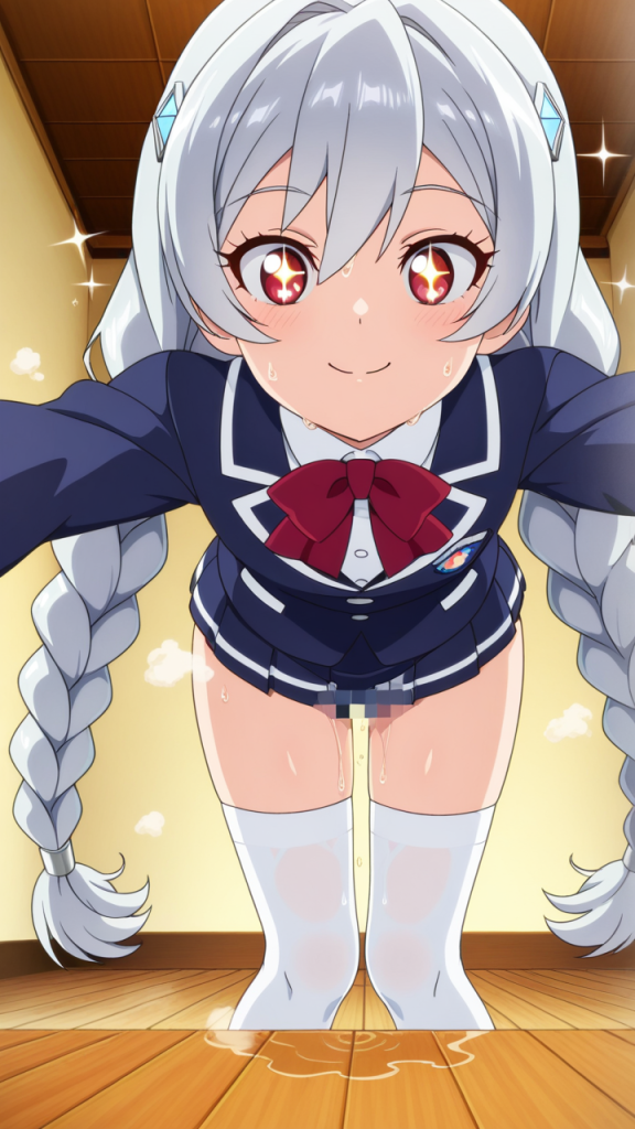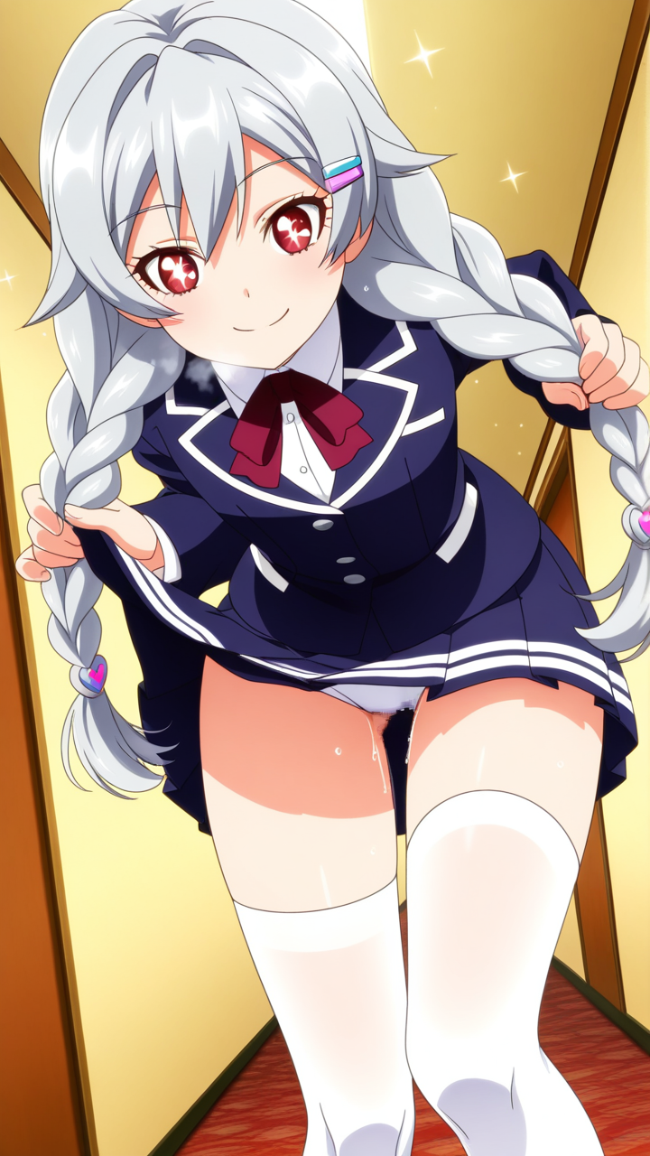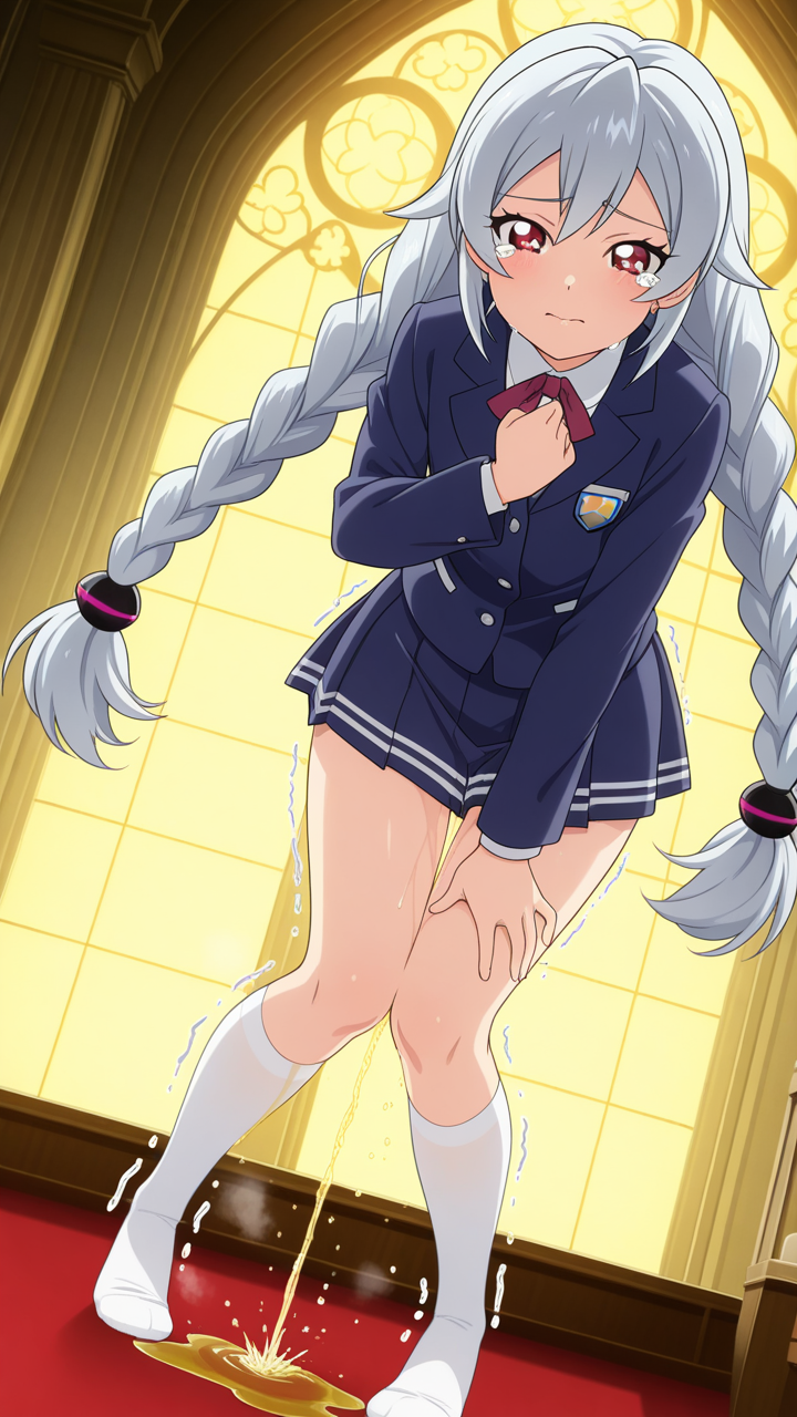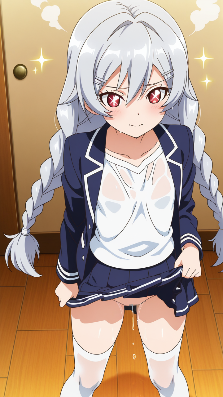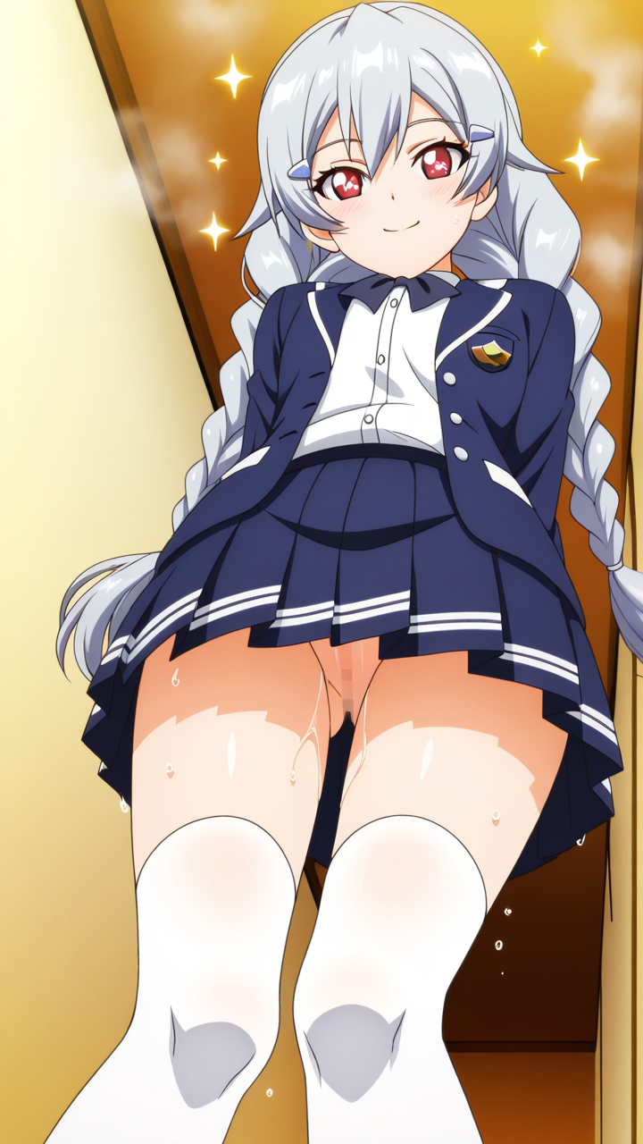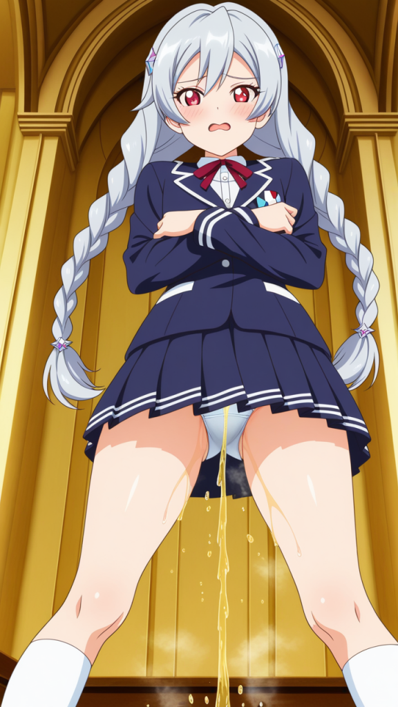 美少女,おっぱい,おしり,M字開脚,食い込み,乳首,パンツ,くぱぁ,おしっこ,お漏らし,放尿,,銀髪のツインおさげ、毛先ふんわり,赤い瞳、ハーフっぽい二重,貧乳・長身,紺と白のブレザー学生制服、白いシャツ、紺のプリーツスカート、白いニーソックス、銀色のハートヘアピン,元気系・明朗快活で活発的
