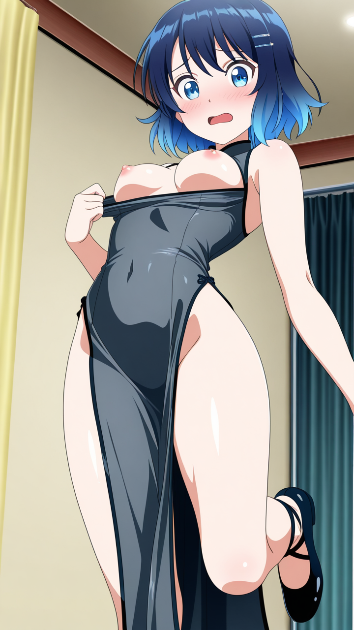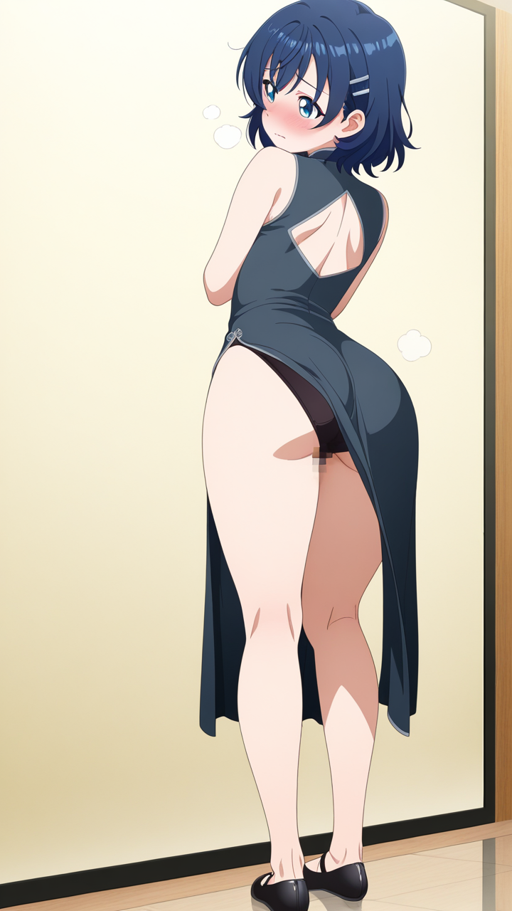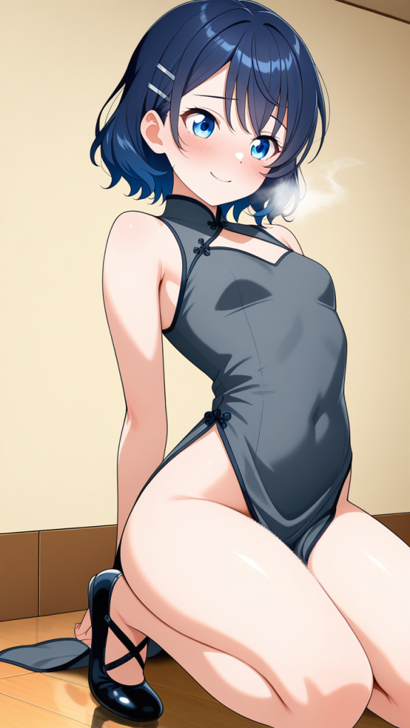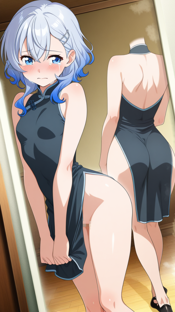 美少女,おっぱい,おしり,M字開脚,食い込み,乳首,パンツ,くぱぁ,バック,後背位,,青髪のくせ毛ショート,青い瞳の細めのクールな目,細身・長身モデル体型,深青と銀のチャイナドレス、銀製の竜型ヘアピン、黒いバレエシューズ,恥ずかしがり屋だが芯は強い