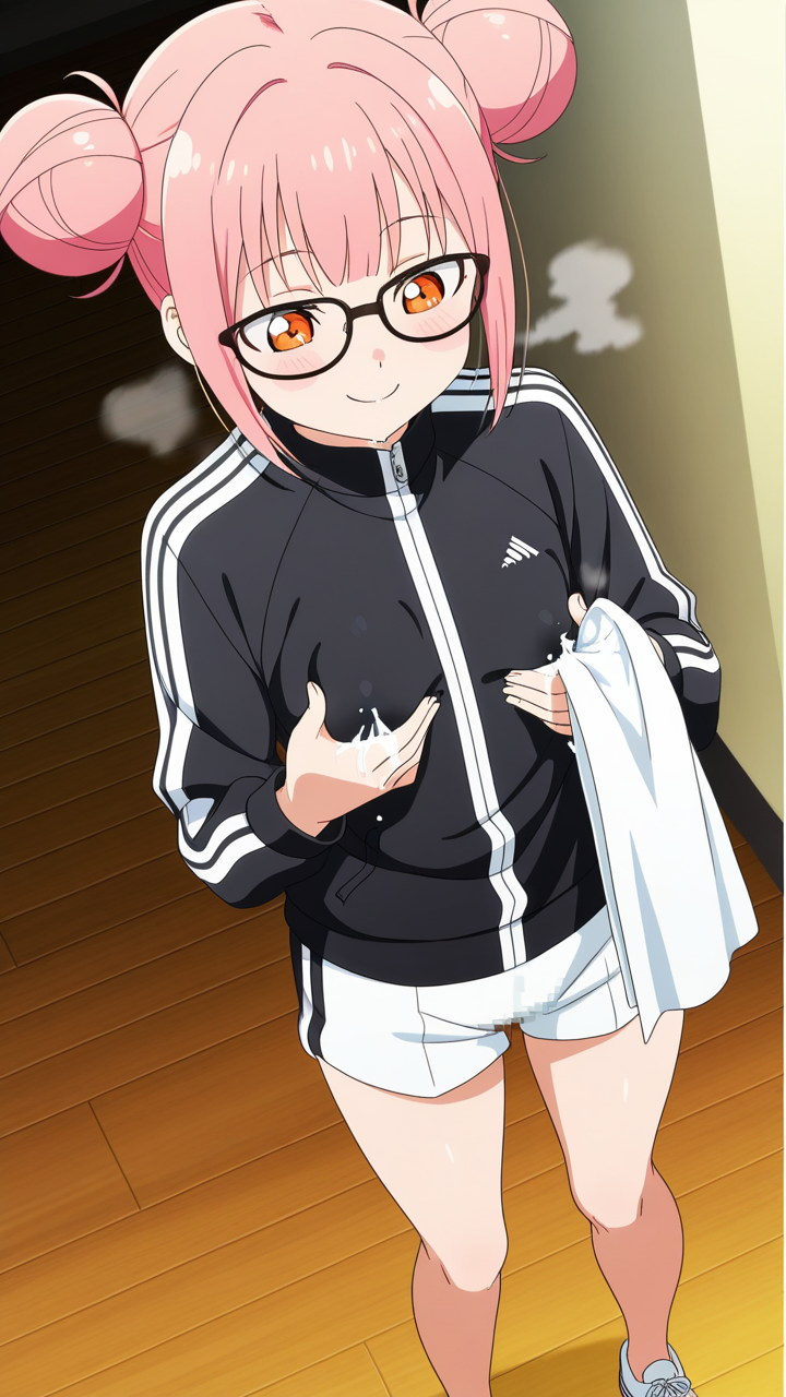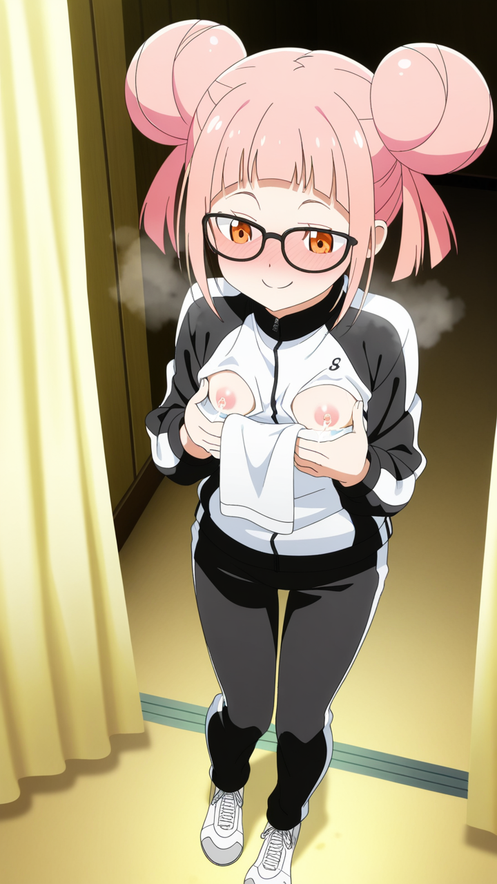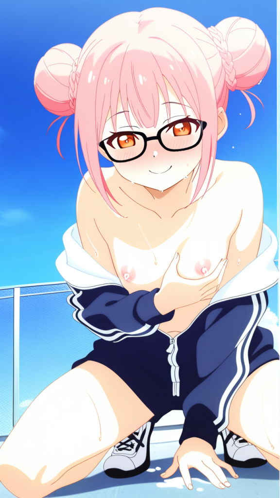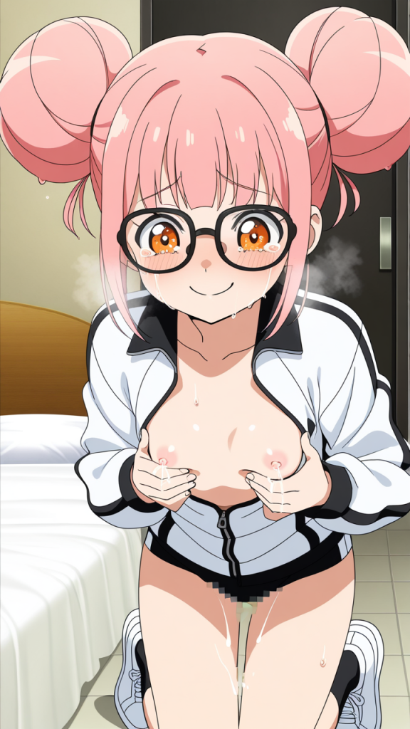 美少女,おっぱい,おしり,M字開脚,食い込み,乳首,パンツ,くぱぁ,母乳,ミルク,,ピンク髪のお団子ヘア、毛先ふんわり,橙色の丸くてキラキラした瞳,貧乳・長身,黒と白のジャージ上下、細フレーム眼鏡、白いスポーツシューズ,腹黒系、笑顔の裏に計算高さを隠している