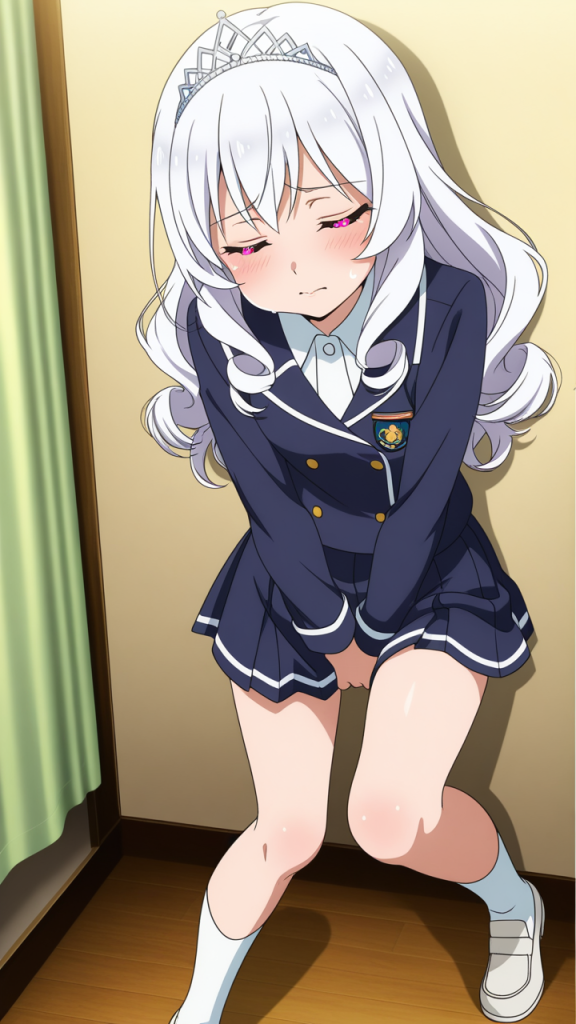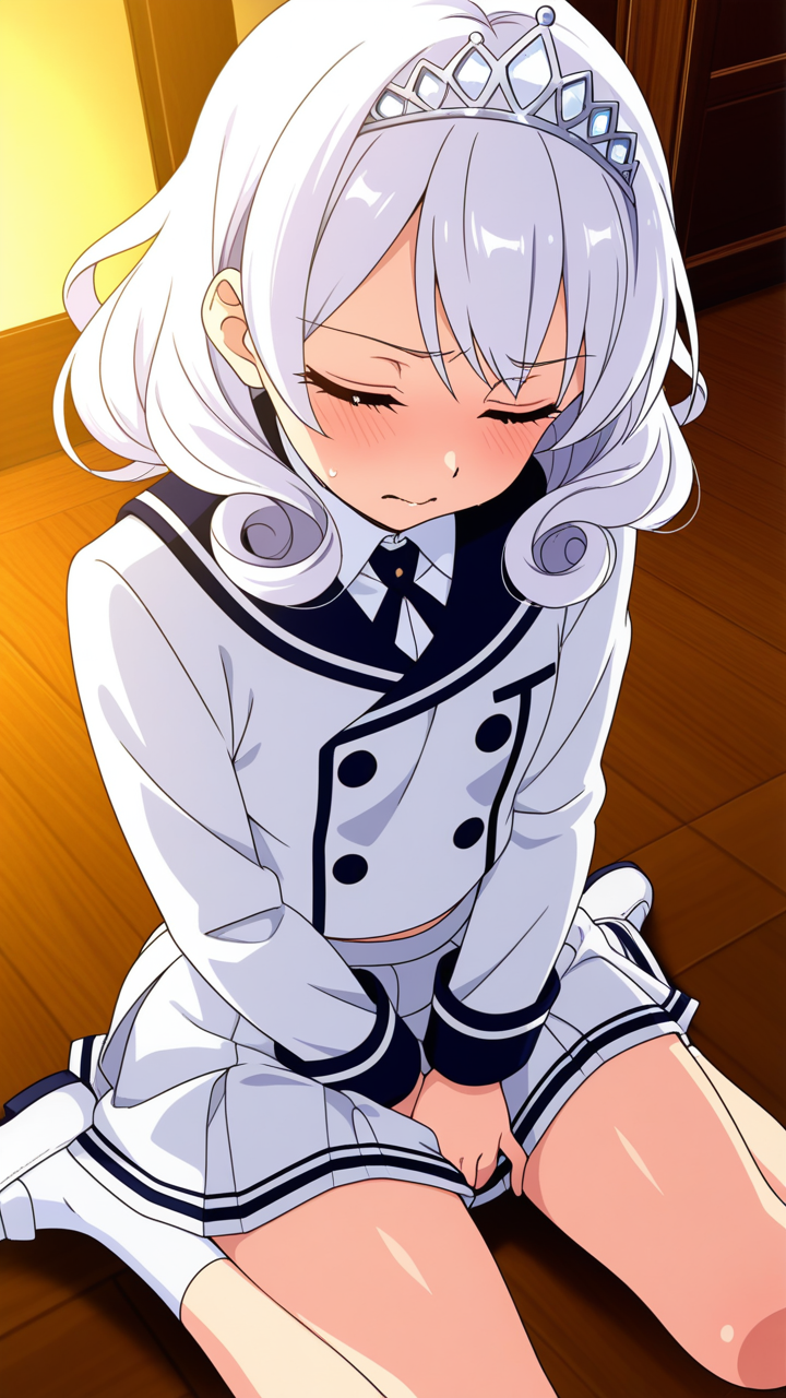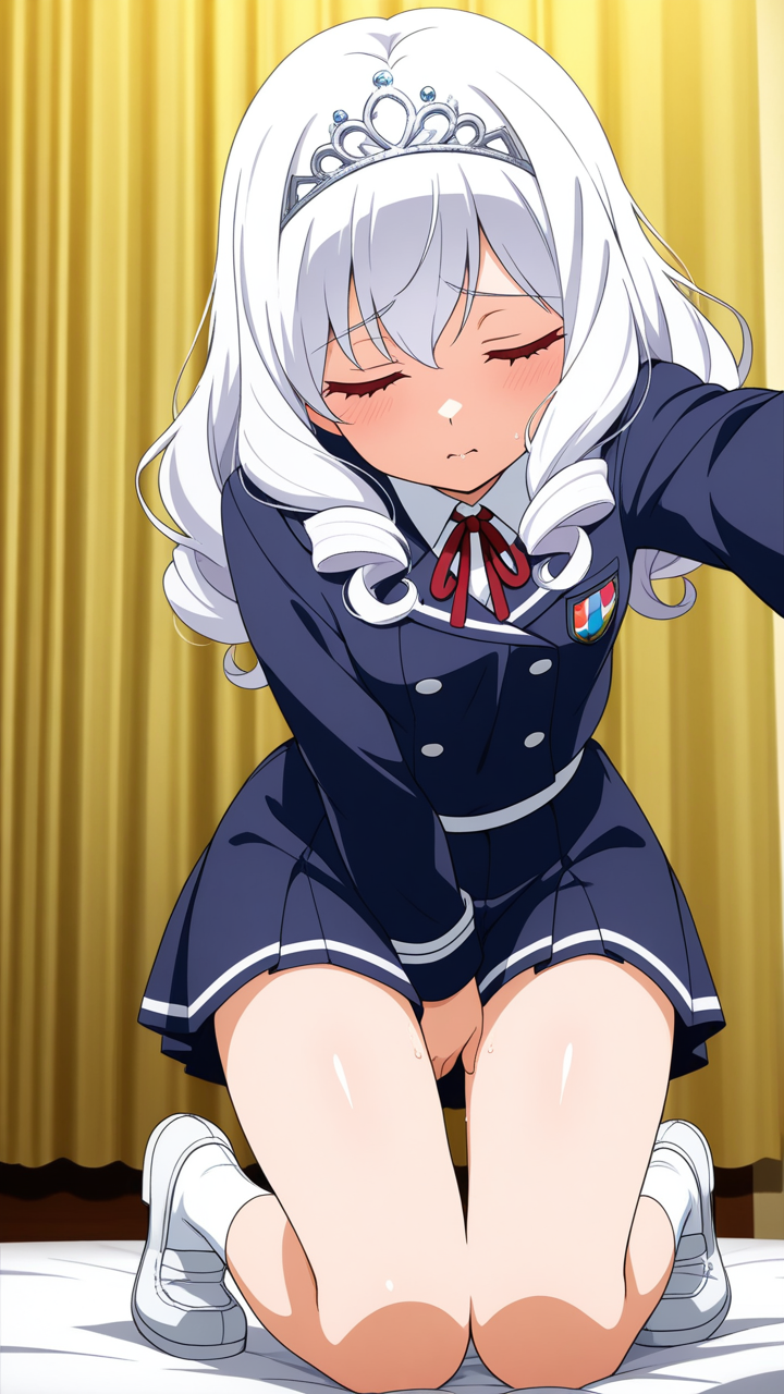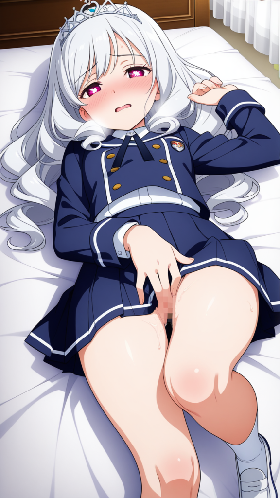 美少女,おっぱい,おしり,M字開脚,乳首,パンツ,くぱぁ,オナニー,自慰,指,マスターベーション,,白髪の内巻きセミロング,深紅の瞳、垂れ目気味のハーフ目,貧乳・小柄,紺と白のブレザー学生制服、白いシャツ、紺のプリーツスカート、白いアンクルソックス、白いローファー、頭部には銀色のティアラ型ヘッドドレス,気の強いボーイッシュで、やや生意気で挑戦的な表情