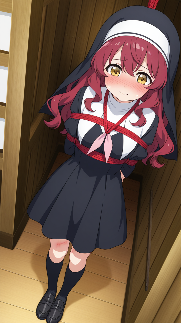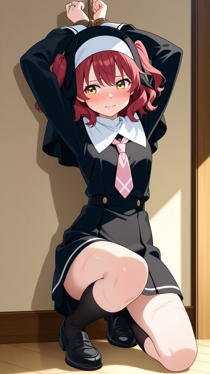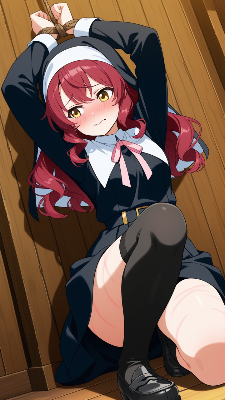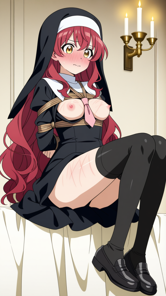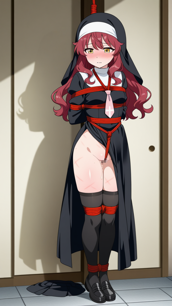 美少女,おっぱい,おしり,乳首,縛り,ロープ,拘束,SM,ボンデージ,,赤髪のショートカット、毛先がふんわりと外ハネ,金色の瞳、鋭い切れ長の目,背が高くスレンダーな体型,白と黒の修道女服、胸元に大きなピンク色のリボンタイ、黒いニーソックス、足元に黒いローファー,天然ドジっ子、おっとりとした雰囲気で時々予想外の行動をする