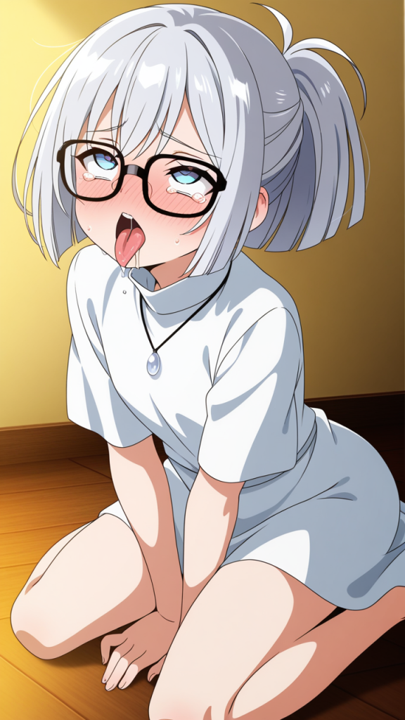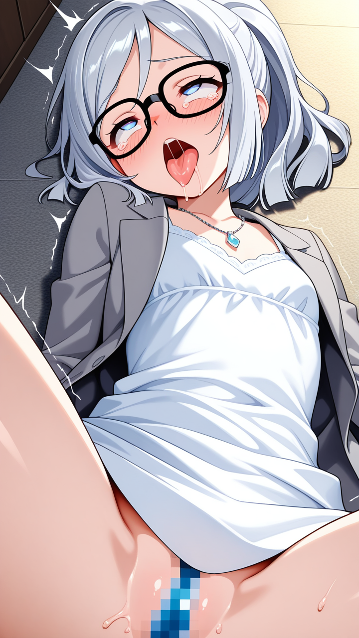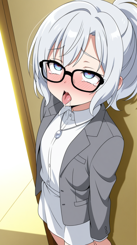 美少女,おっぱい,おしり,乳首,アヘ顔,白目,舌出し,よだれ,,銀髪のポニーテール、毛先ふんわり,水色の瞳、垂れ目気味のハーフ目,ロリ体型,グレーのビジネススーツ、白いシャツ、黒い眼鏡、シルバーのペンダントネックレス,毒舌で冷徹だが、時折優しさが垣間見える