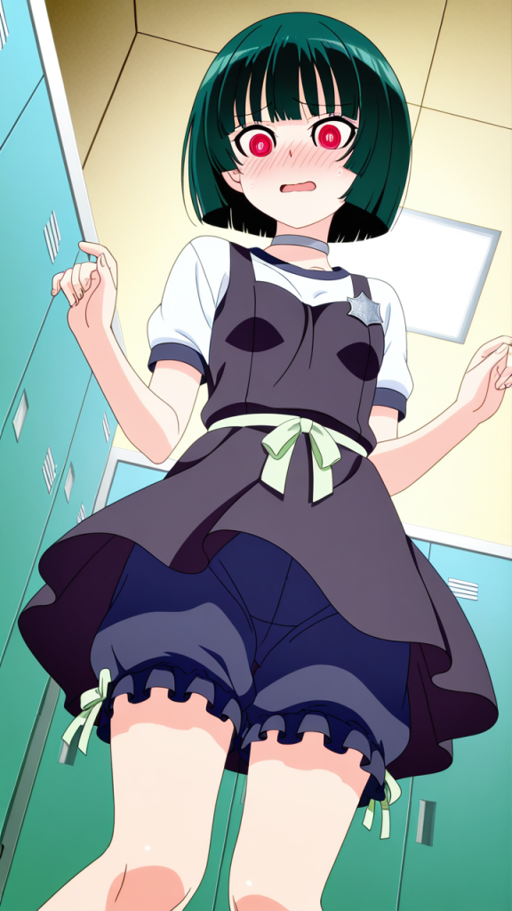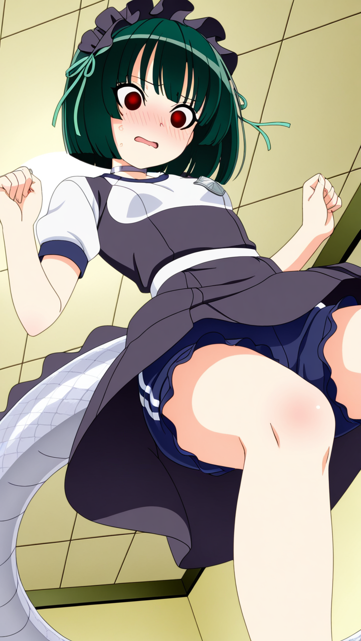 美少女,おっぱい,おしり,体操服,ブルマ,体育,,深緑色の外ハネボブ,深紅の瞳、大きなぱっちり目,貧乳・長身,深緑と黒のドラゴンメイド服、胸元に銀色の竜装飾、腰に深緑のリボン、シルバーチョーカー,気の強いボーイッシュで挑戦的