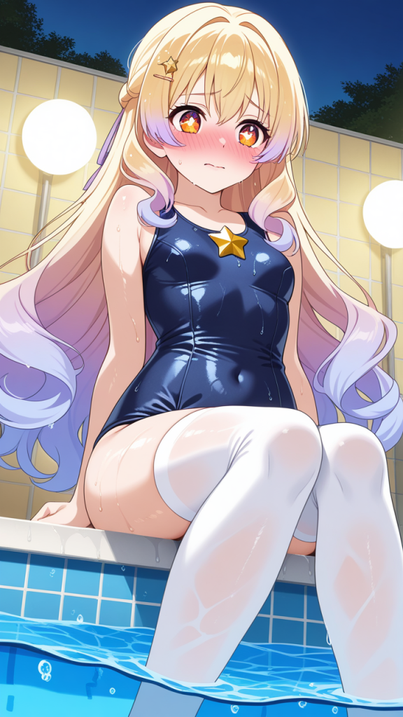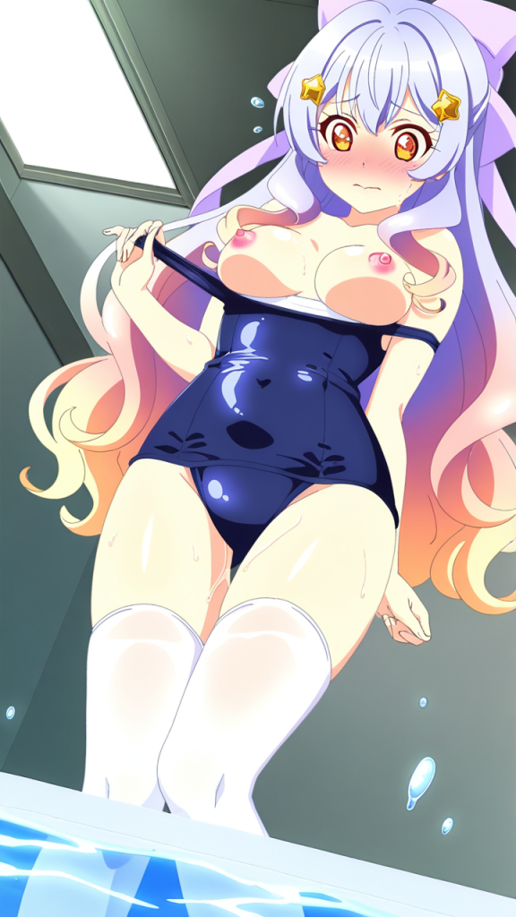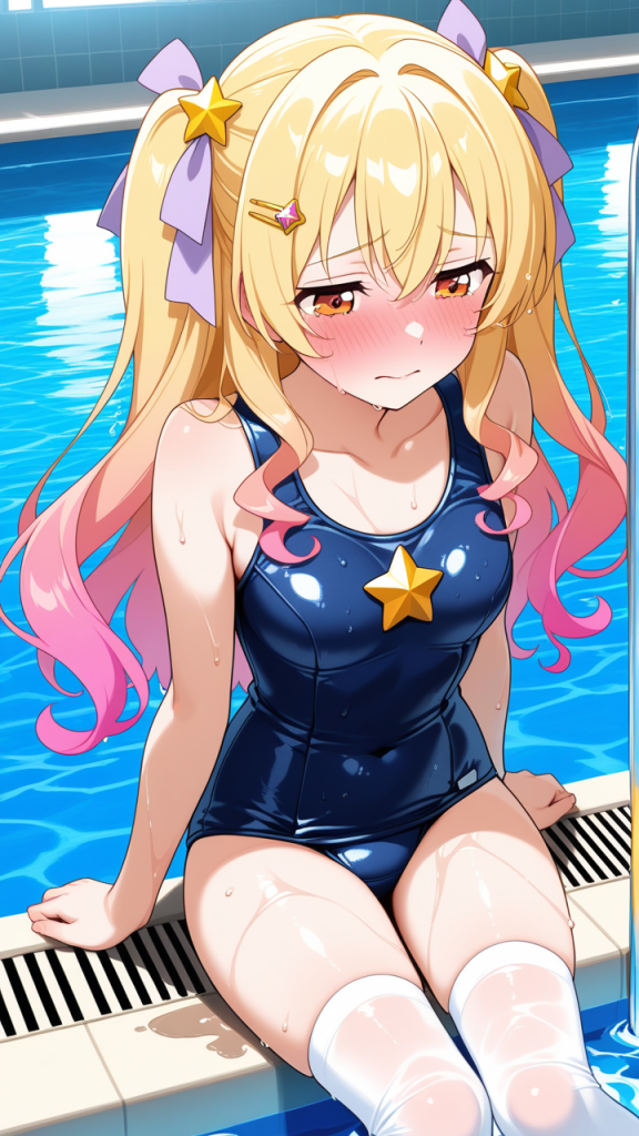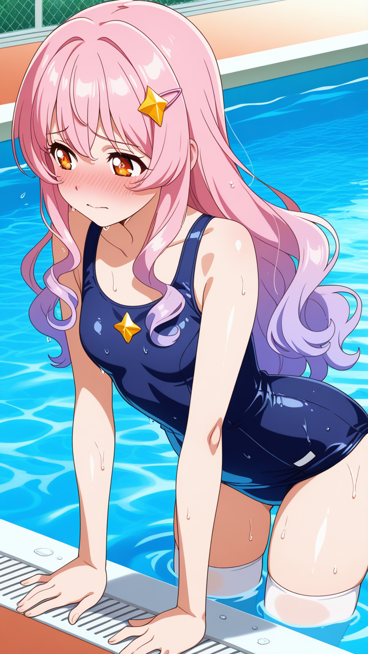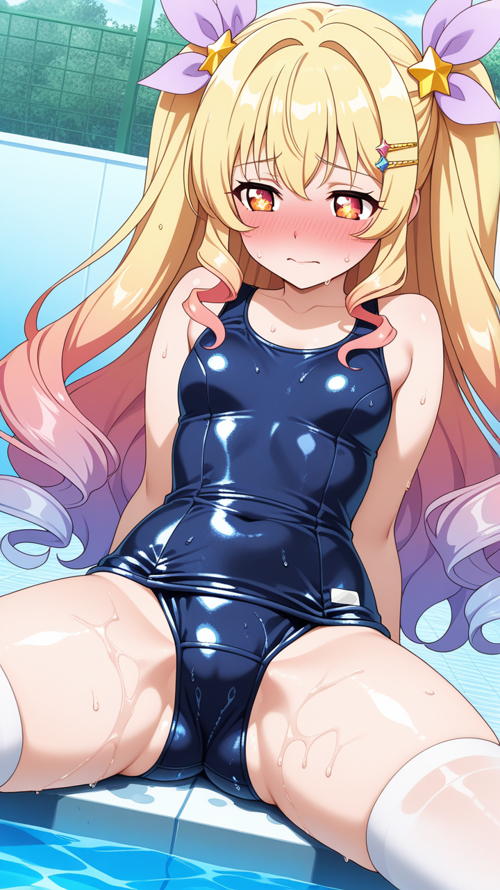 美少女,おっぱい,おしり,スク水,スクール水着,水着,,金からピンクへのグラデーション、内巻きセミロング,琥珀色の丸くてキラキラした瞳,巨乳・スレンダー体型,紫と白の魔法少女衣装、胸部に星型の装飾、腰に薄紫のリボン、白いニーソックス、金色のハート型ヘアピン,恥ずかしがり屋で照れやすい
