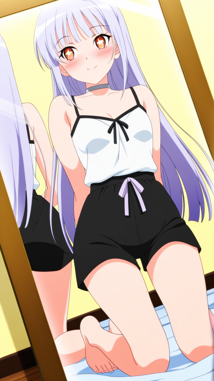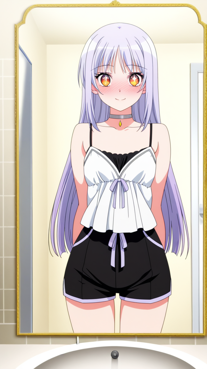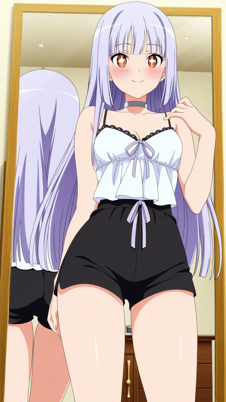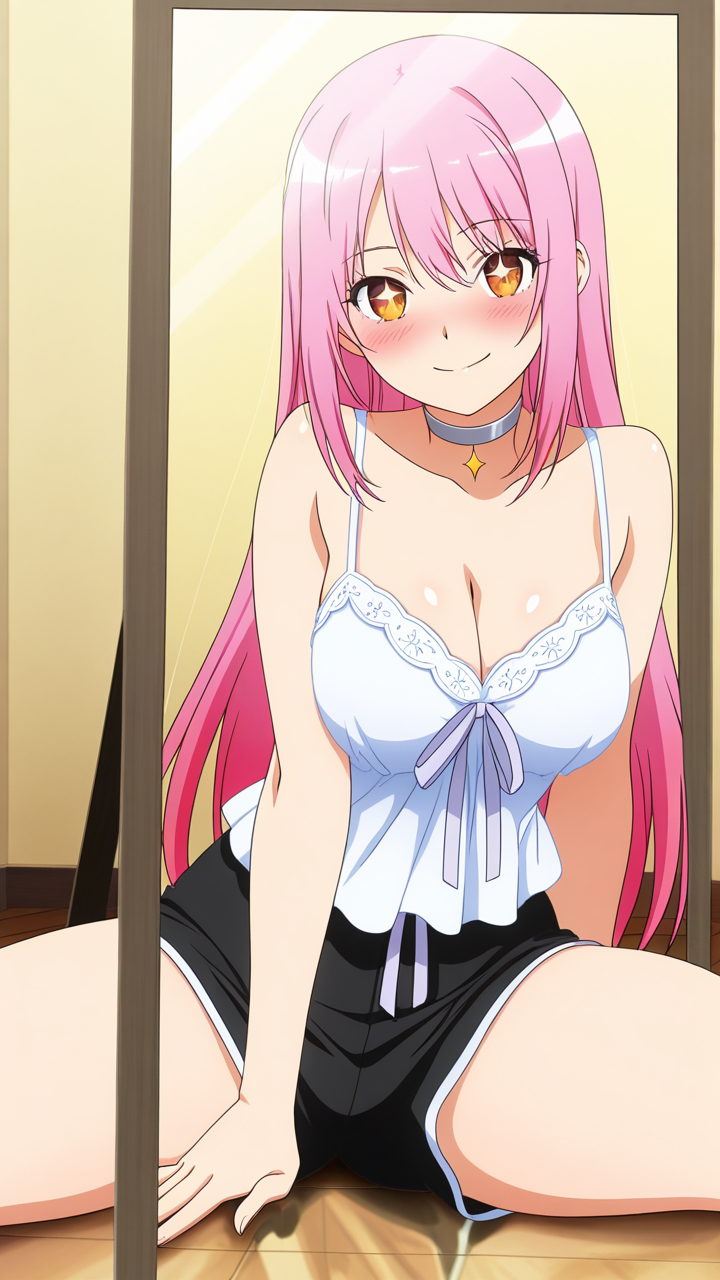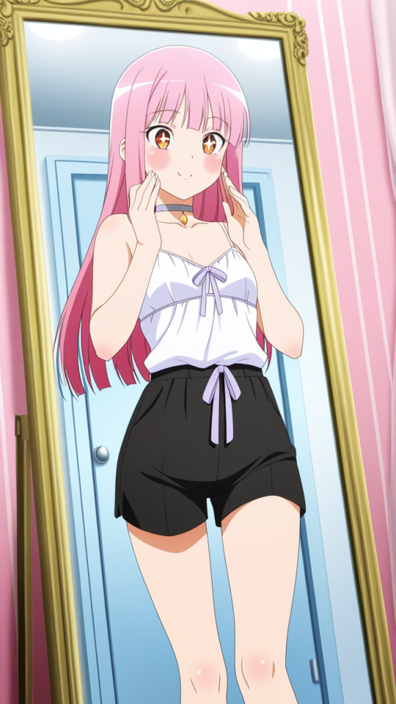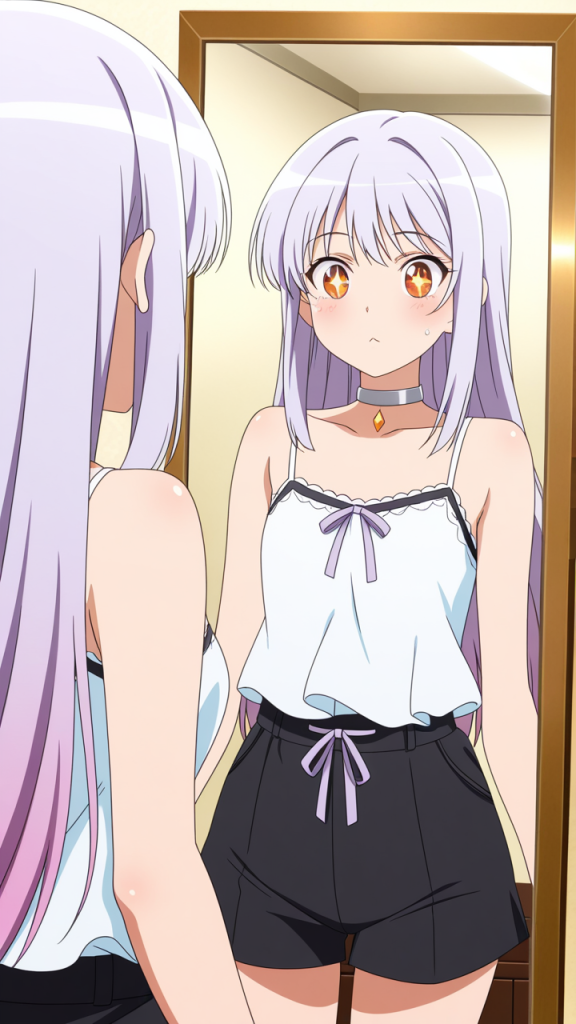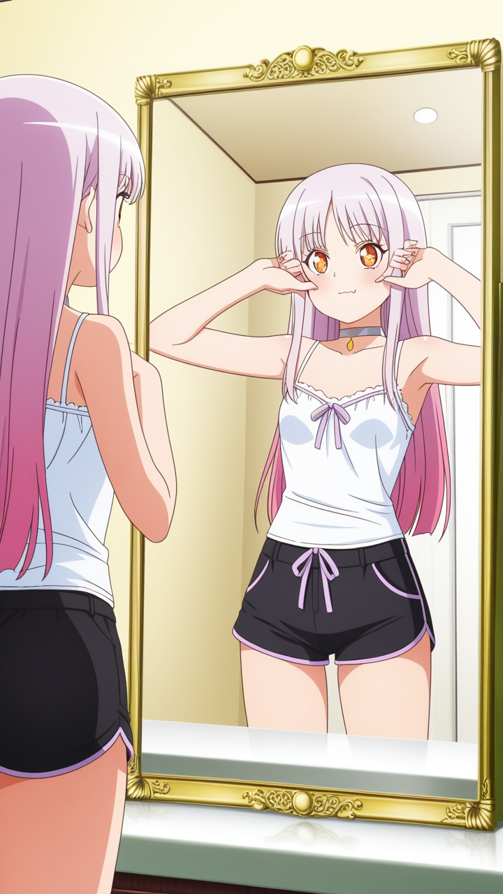美少女,おっぱい,おしり,乳首,鏡,反射,鏡越し,,金からピンクへのグラデーション、ロングストレート,琥珀色の丸くてキラキラした瞳,巨乳・スレンダー,黒のシースルーブラウス、白いキャミソール、黒いショートパンツ、シルバーのチョーカー、腰に薄紫のリボン,元気系で明るく活発