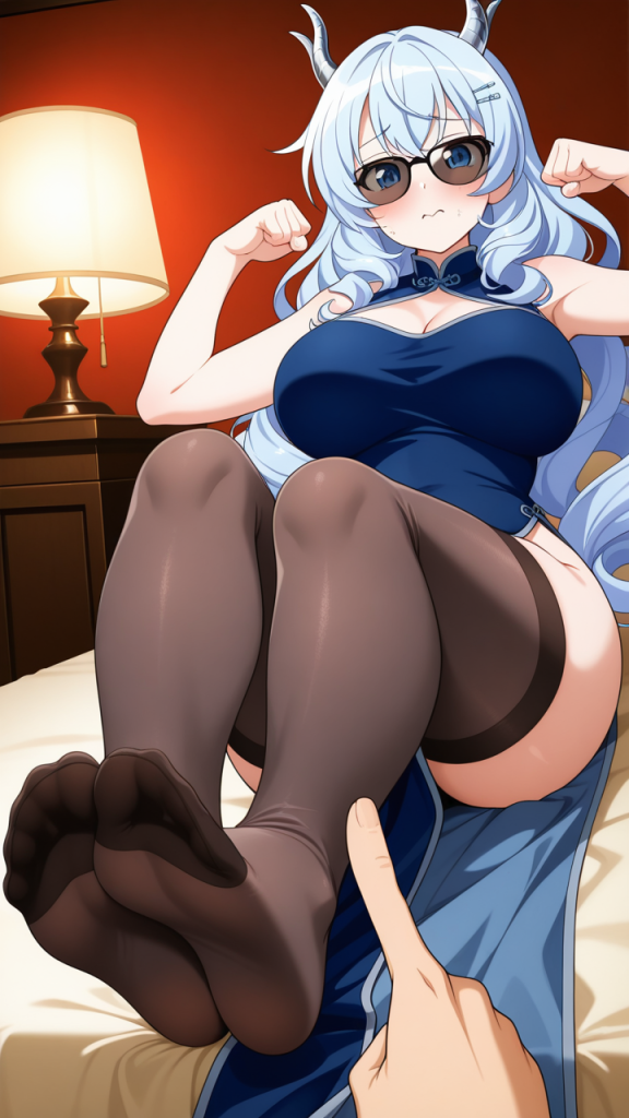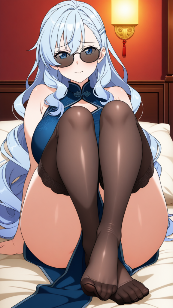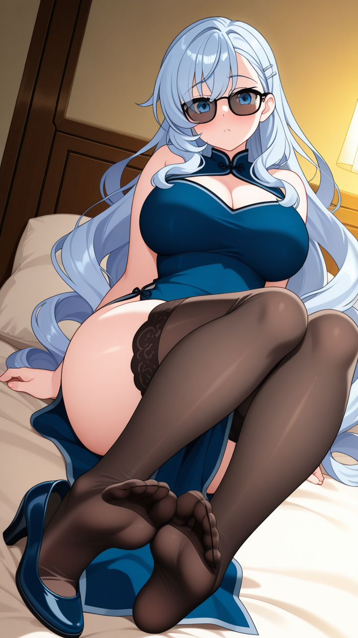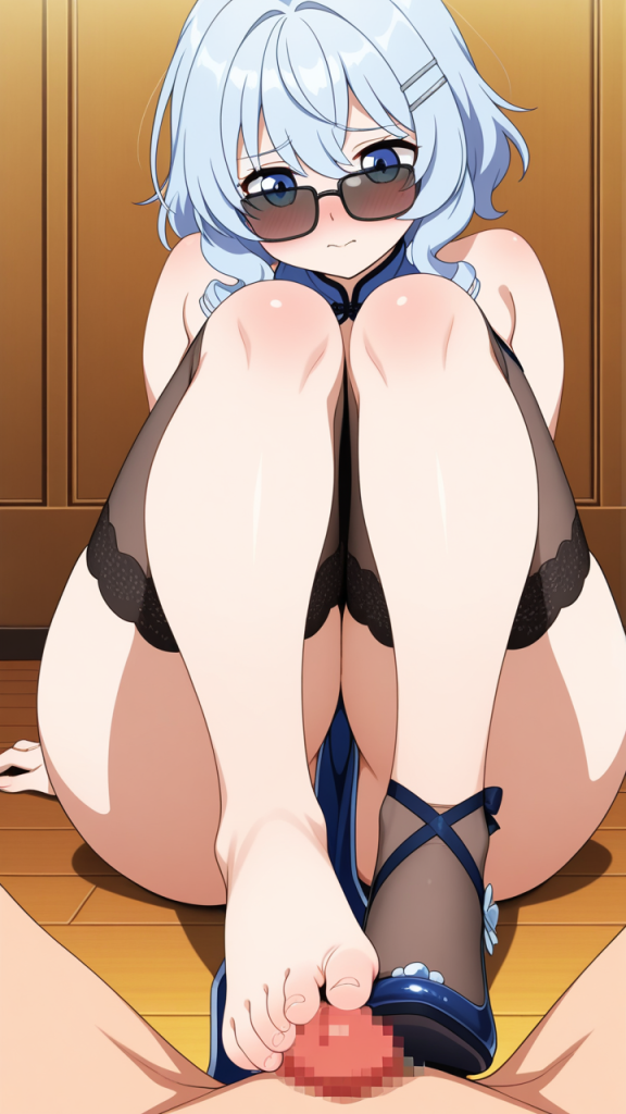 美少女,おっぱい,足コキ,足,脚,太もも,ニーソ,,水色髪の内巻きセミロング,青い瞳の細めのクールな目,巨乳・むっちりとした体型,深青と銀のチャイナドレス、黒いストッキング、銀色の龍型ヘアクリップ、黒いサングラス、足元に青いチャイナシューズ,甘えんぼで可愛らしい表情