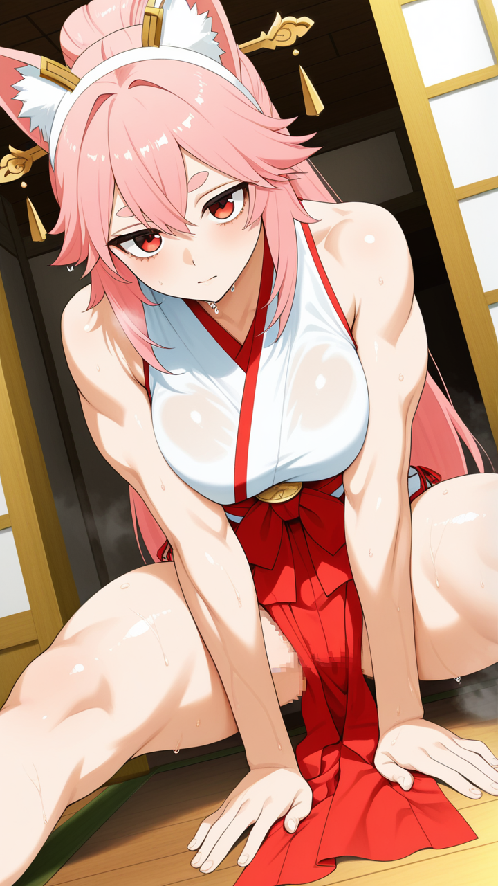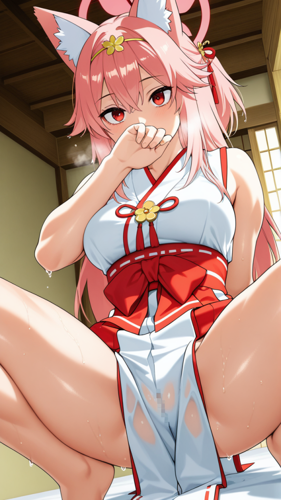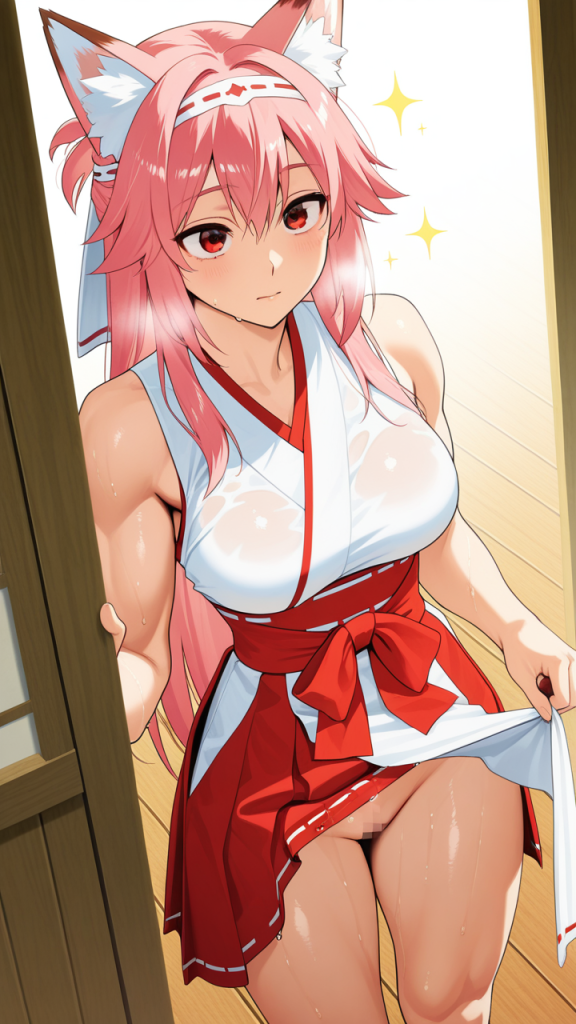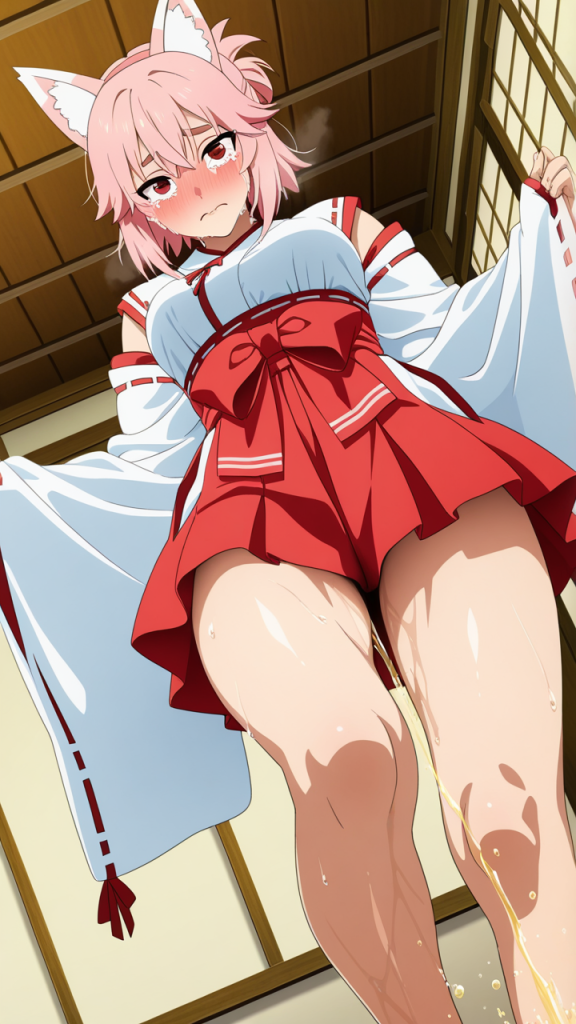 美少女,おっぱい,おしり,M字開脚,食い込み,乳首,パンツ,くぱぁ,おしっこ,お漏らし,放尿,,桜色のハーフアップ,赤い瞳のつり目,スポーティー・筋肉質,白と赤の巫女服、狐耳ヘッドアクセサリー、腰に金色の装飾紐,おっとり癒し系