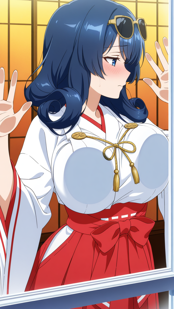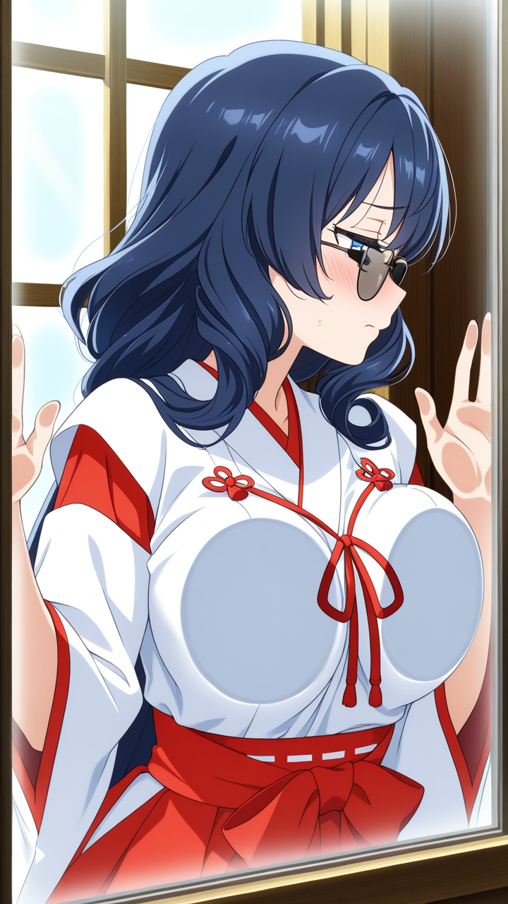 美少女,おっぱい,乳首,ガラス,押し付け,圧迫,胸,巨乳,貧乳,,青髪の内巻きセミロング,青い瞳の垂れ目気味ハーフ目,背が高くスレンダー,紺と白の巫女服、腰に金色の装飾紐、黒いサングラス,甘えんぼで優しい雰囲気
